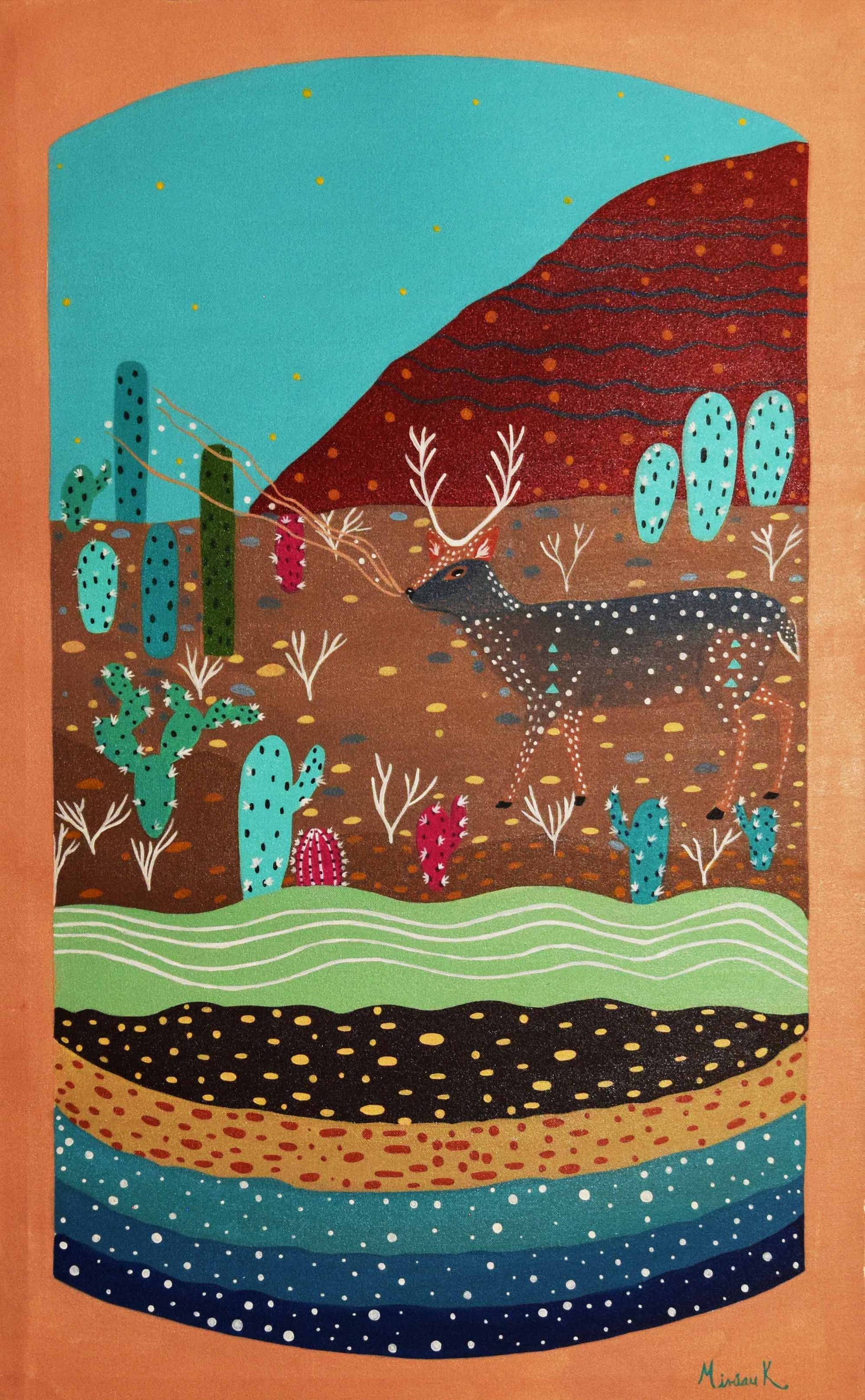 Esté cuadro representa el espíritu que sale del venado, llevándolo hacia el cielo en forma de canto. Las lineas de las montañas que en realidad son hilos que la envuelven cómo los hilos de la vida. Triángulos en la piel que simboliza la manifestación, iluminación, revelación y una perspectiva más elevada.