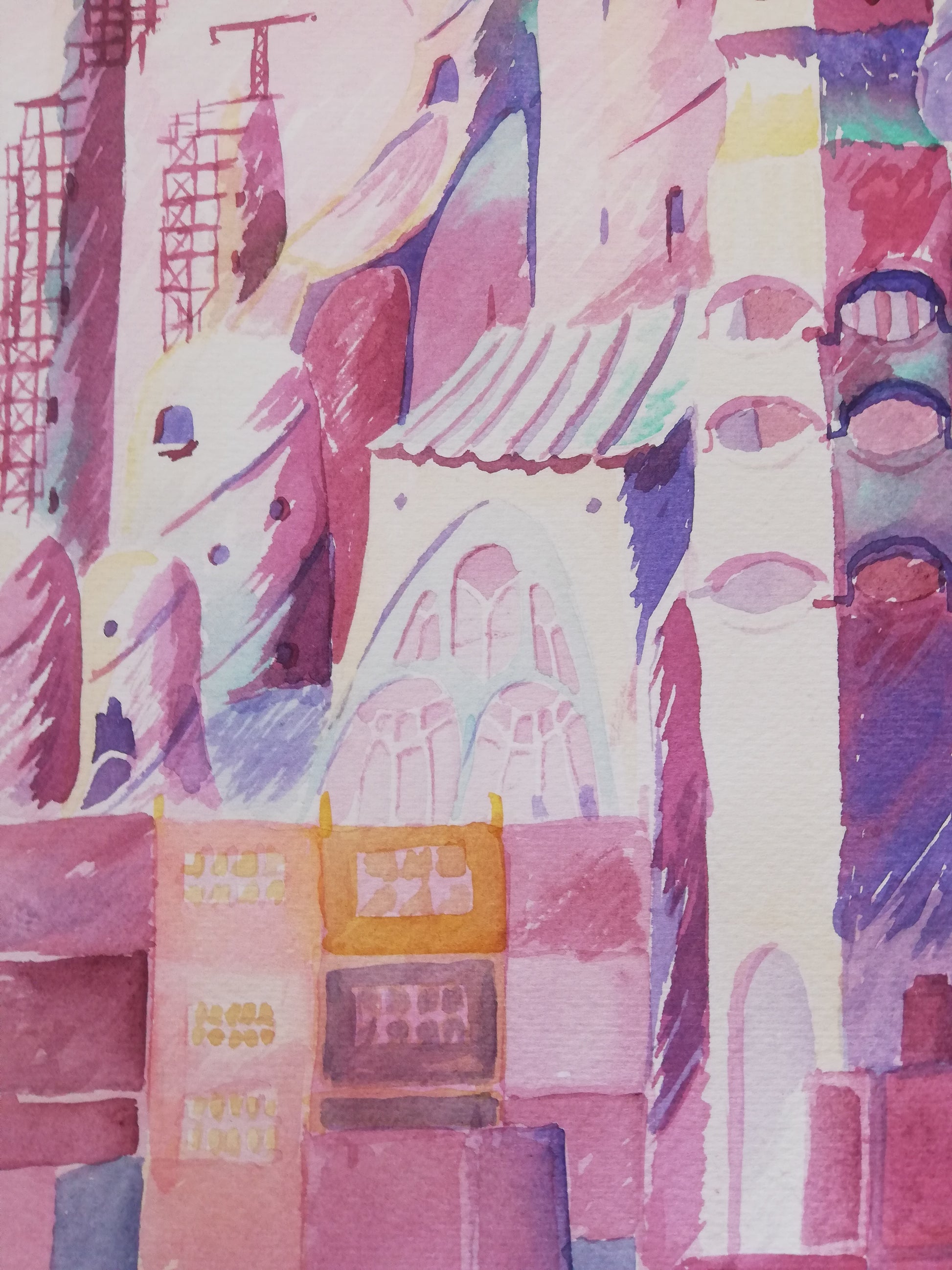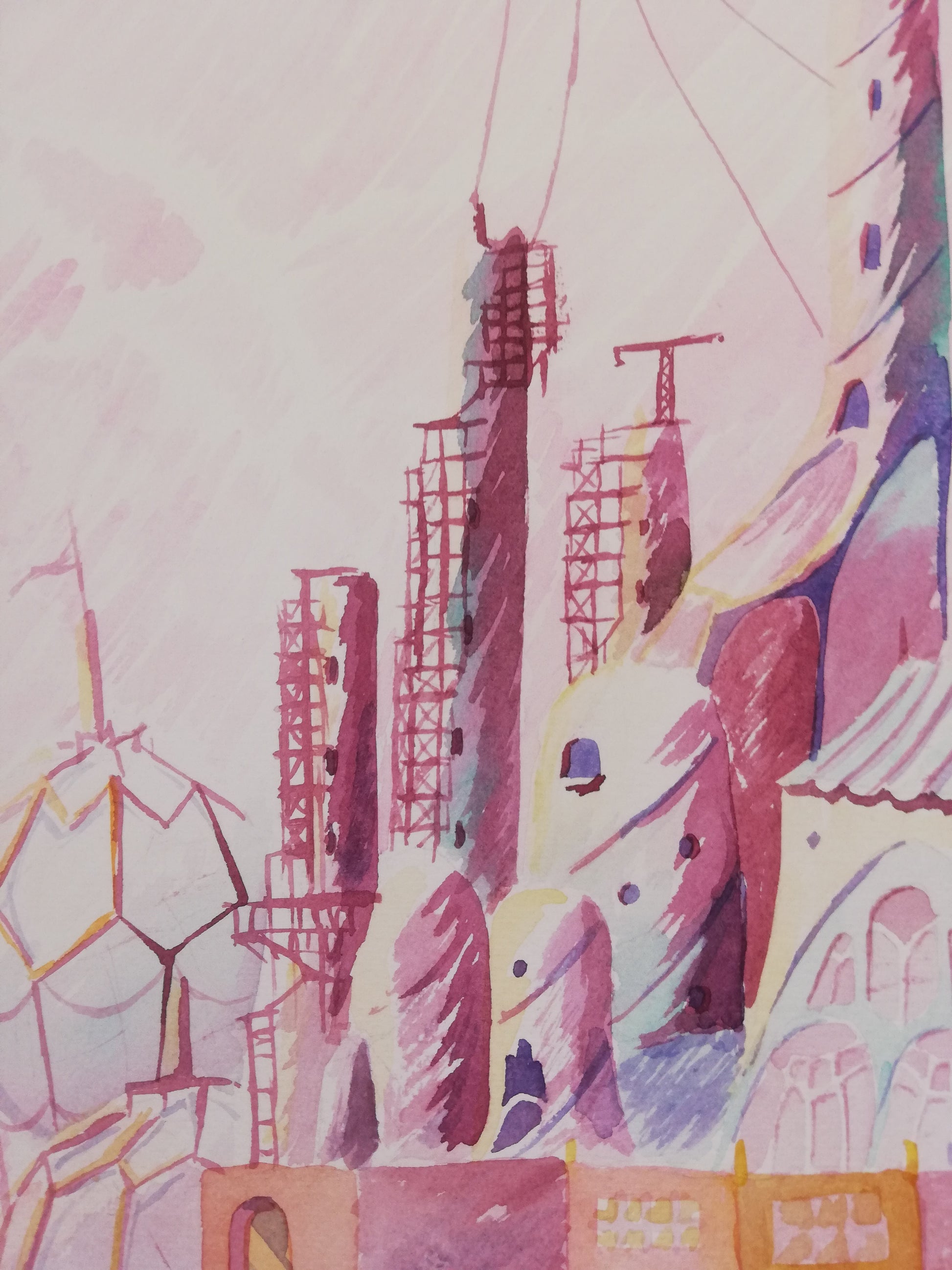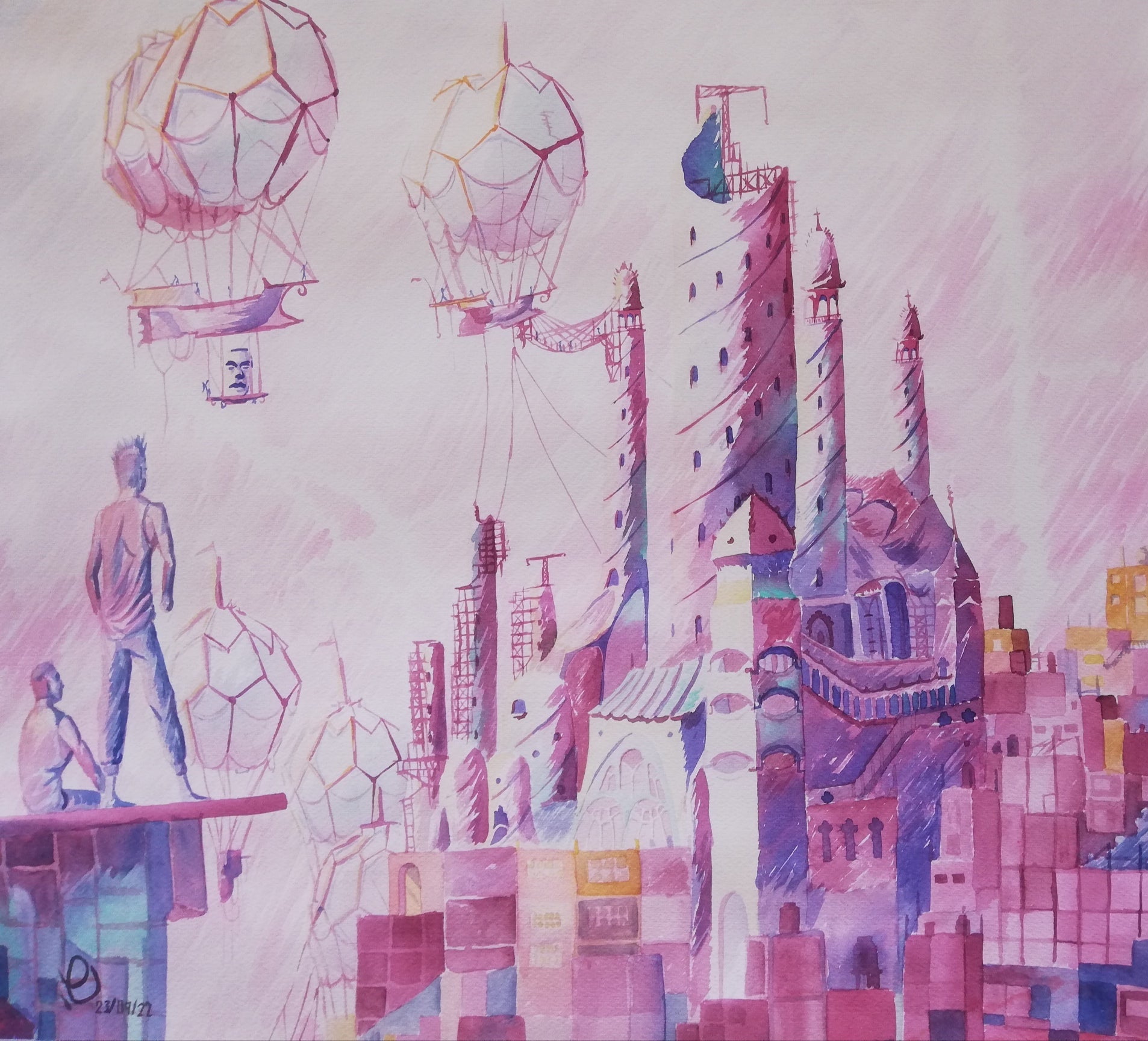 Escena de contemplación que muestra la construcción de un castillo extravagante en medio del paisaje urbano.