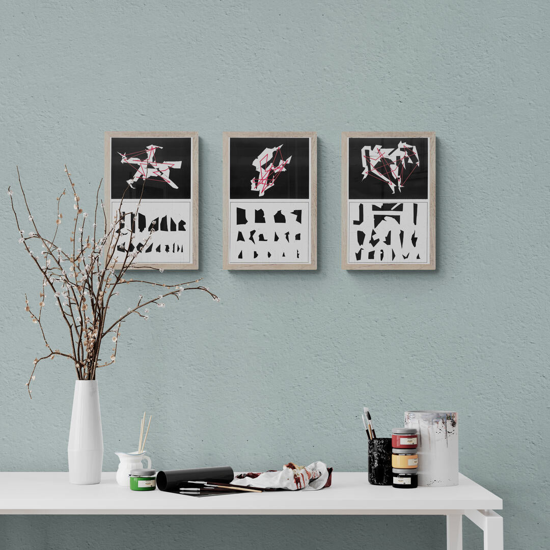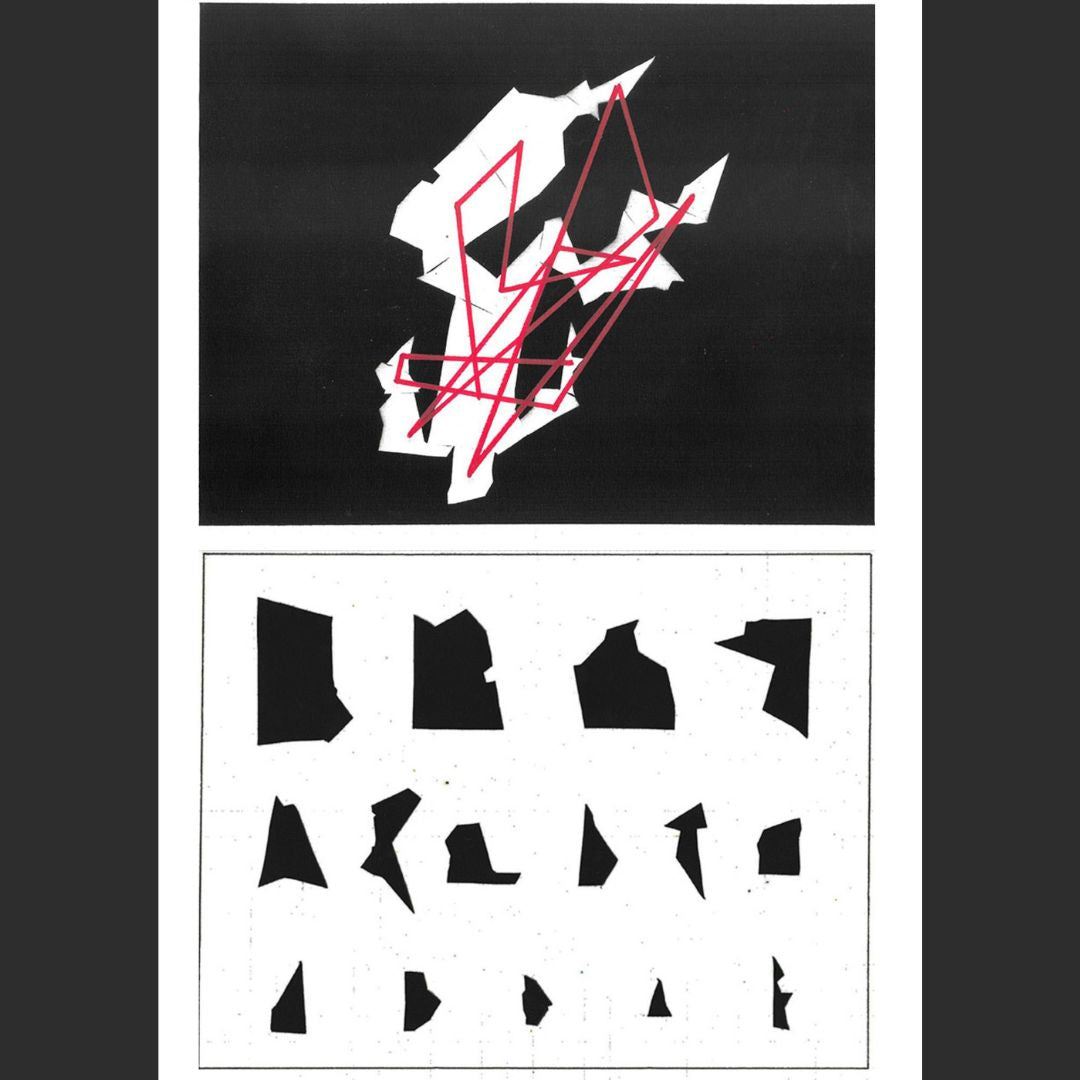 Después, partiendo de este orden, los fragmentos fueron unidos en las composiciones mediante una línea roja que seguía el criterio de clasificación previa. Esto dio como resultado un tipo imprevisto de visualidad en las composiciones iniciales.