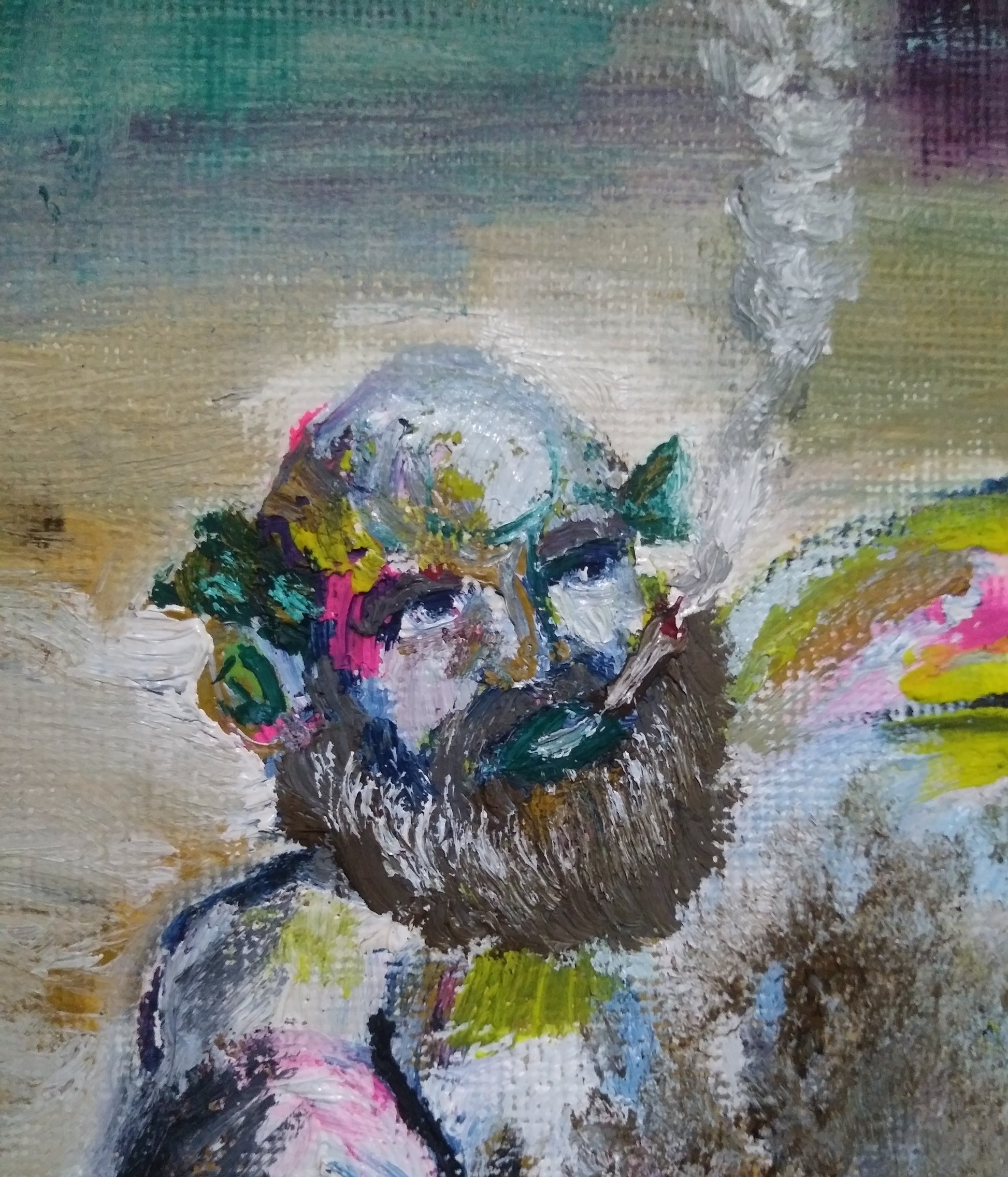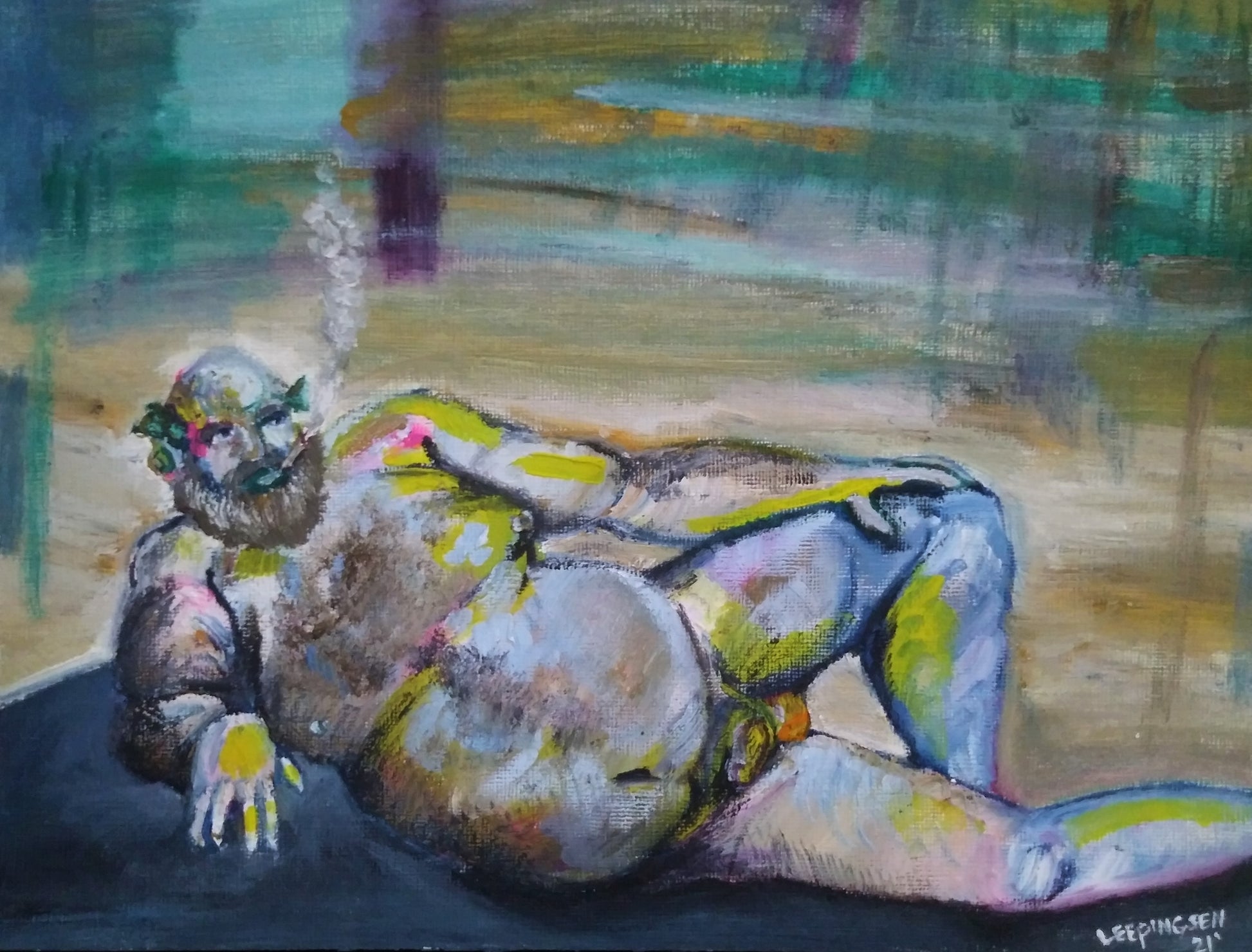 El personaje espera creído cual rey con ornamenta en la sien a alguien, cansado de aguardar por un tiempo a procedido a fumar un cigarrillo.