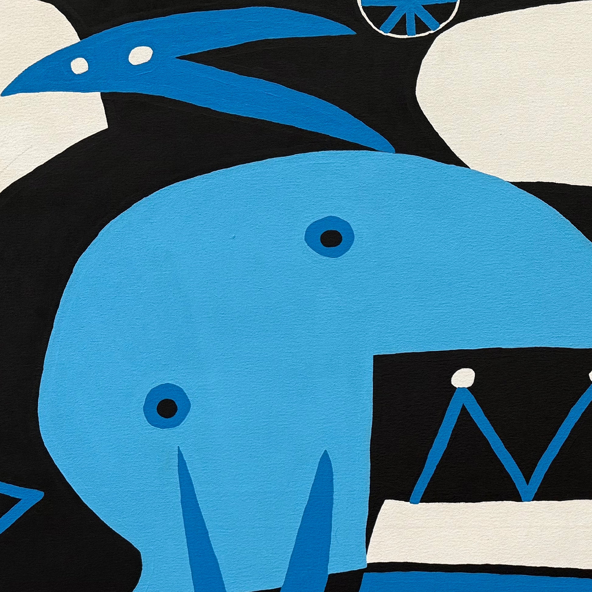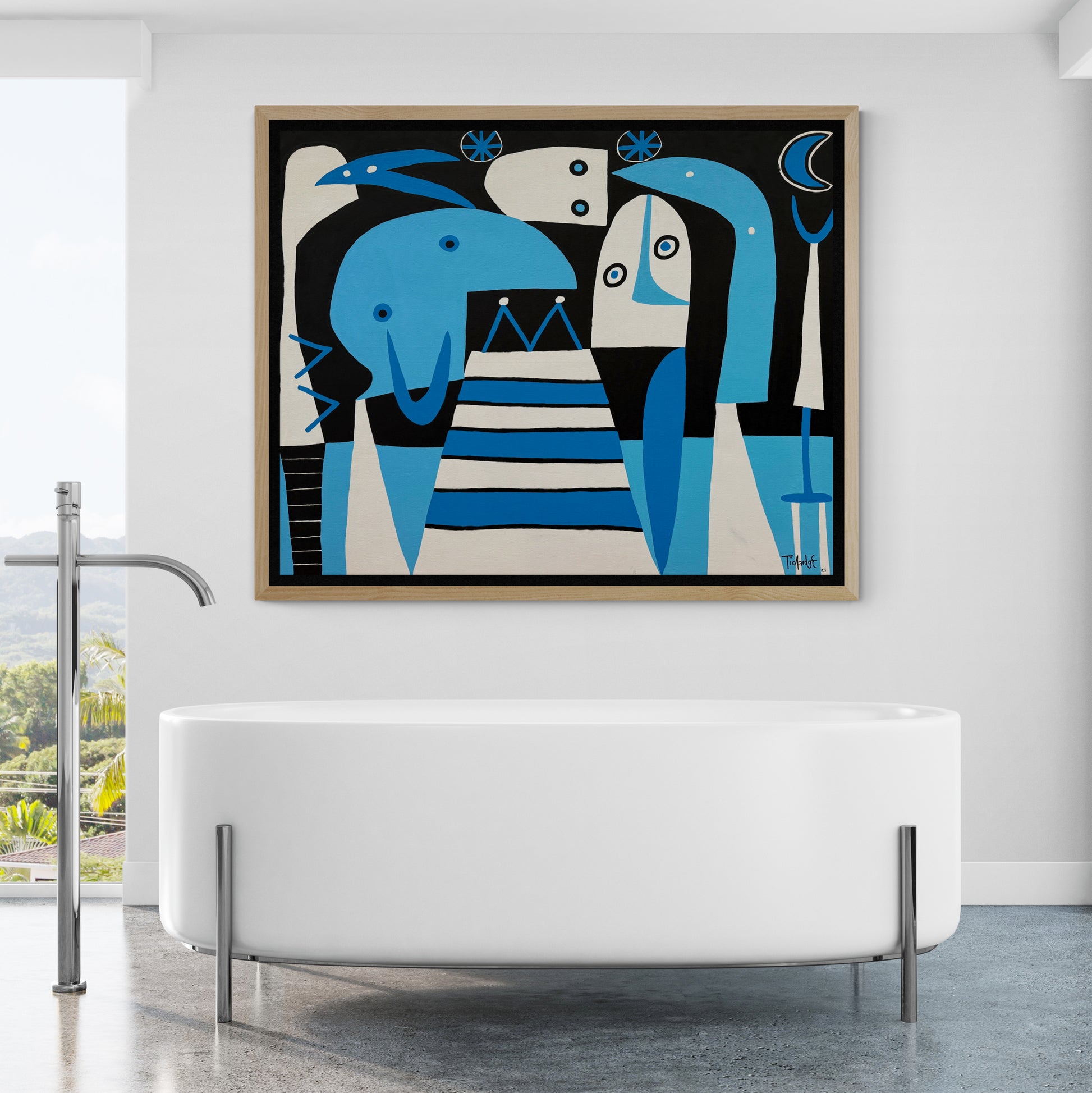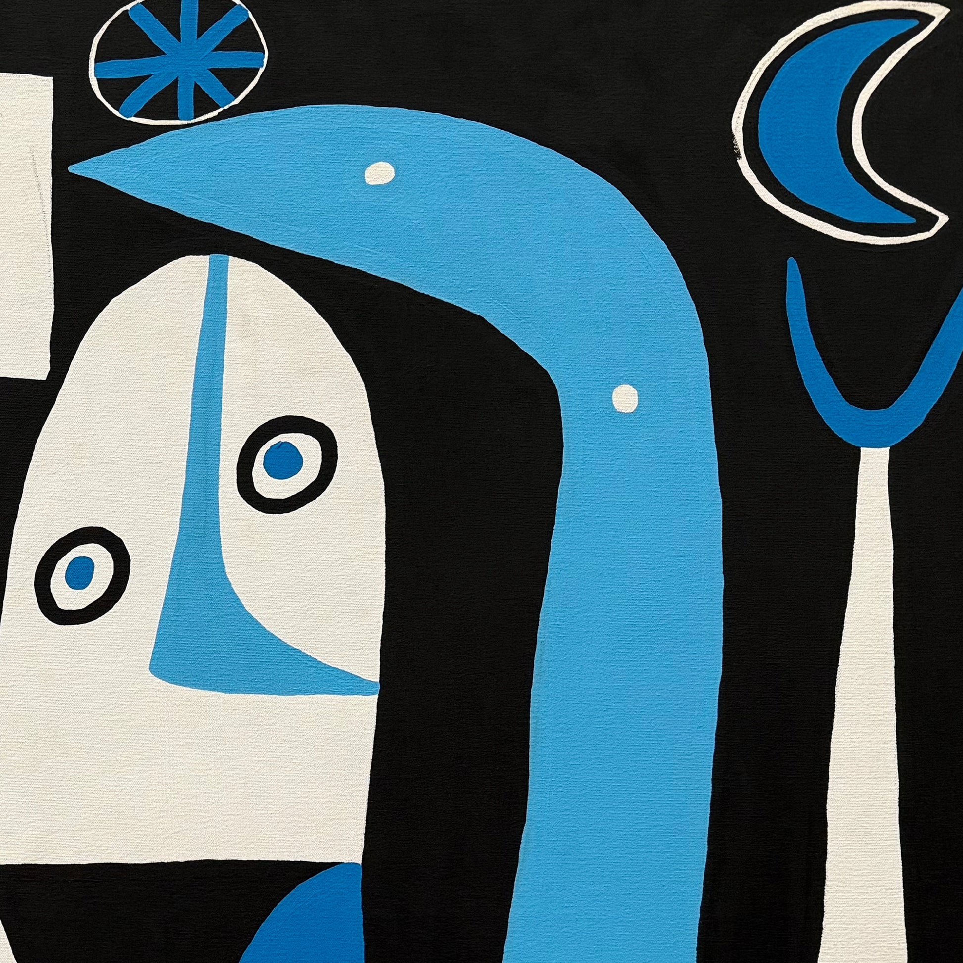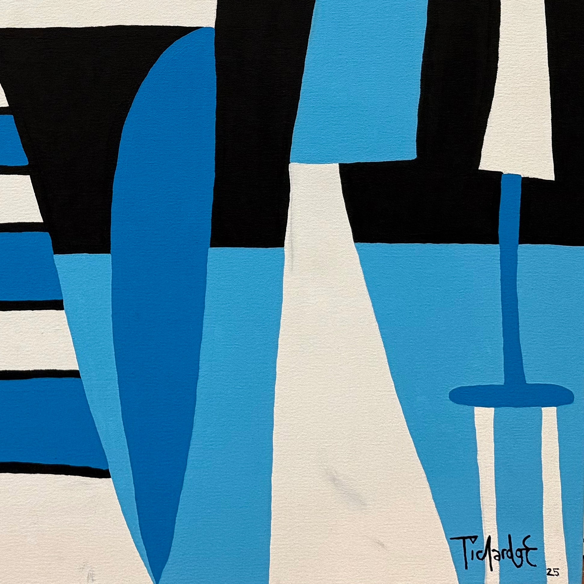 En El cumpleaños del artista Enrique Pichardo, las formas geométricas y las figuras orgánicas se enlazan en un diálogo continuo de ritmo y armonía. Curvas, líneas rectas y volúmenes planos construyen una escena simbólica donde todo parece fluir sin rigidez. Los contrastes cromáticos entre azul, blanco y negro generan profundidad y equilibrio visual. La obra evoca la libertad creativa de Joan Miró y la síntesis expresiva de Pablo Picasso, reinterpretadas por Pichardo desde su propio universo mexicano, lleno de color, humor y energía vital.
