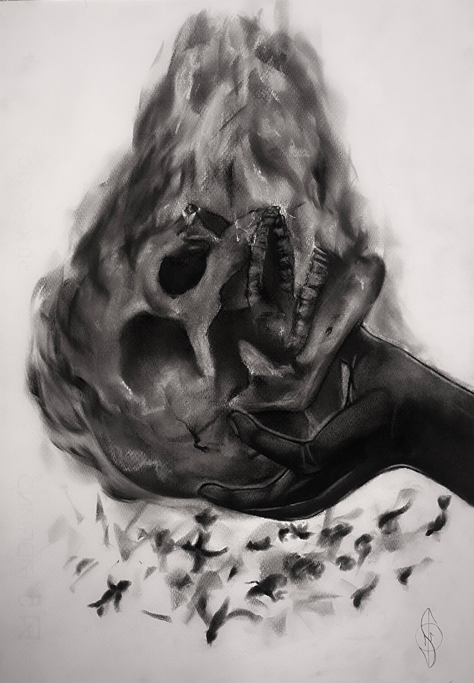 Esta obra representa aquello que no puede apagarse: la fuerza interior que permanece incluso en medio de la destrucción. El cráneo, envuelto en llamas, simboliza la mente y el espíritu enfrentándose al paso del tiempo, al dolor y a la transformación. El fuego no consume, revela; muestra la intensidad de lo que somos cuando todo lo superficial desaparece.