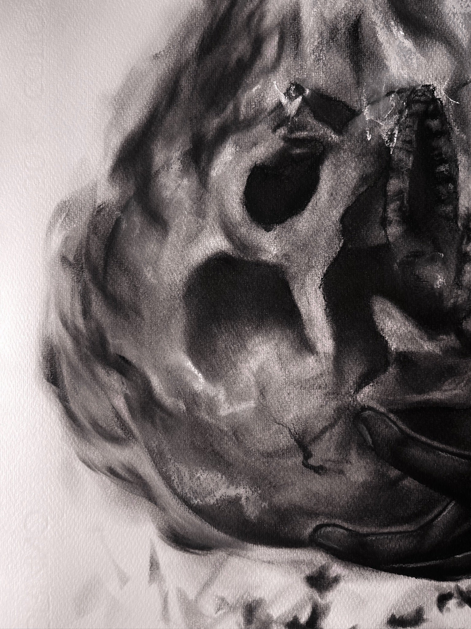 La mano que sostiene el cráneo habla de control, confrontación y aceptación: sostener el propio fuego sin huir de él. Es una pieza intensa, oscura y profundamente humana, pensada para quienes conectan con el arte que provoca, que incomoda y que permanece en la memoria.