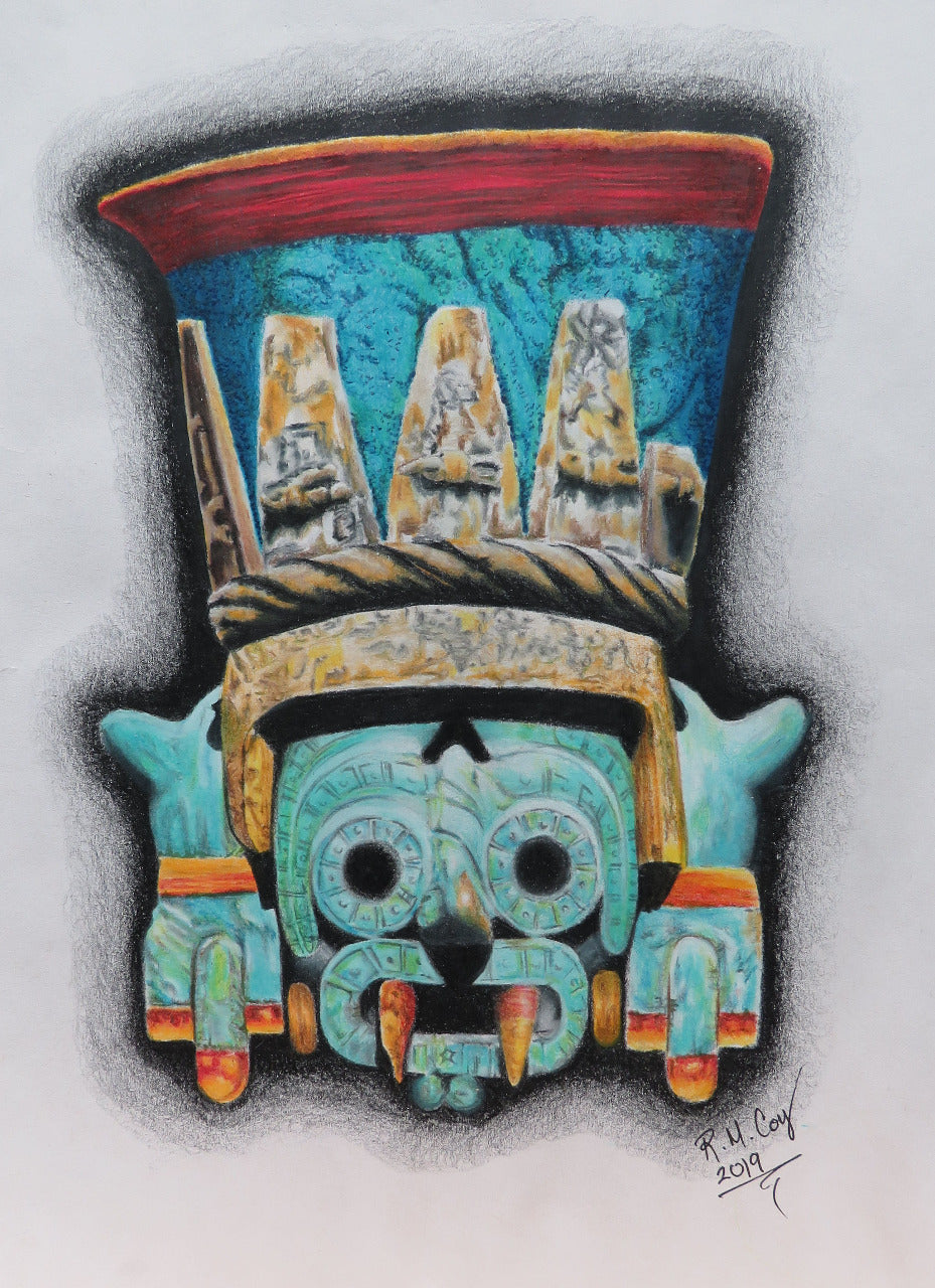 Técnica realismo colores de madera tema prehispánico de una pieza representativa de una de las deidades más importantes de los mexicas.