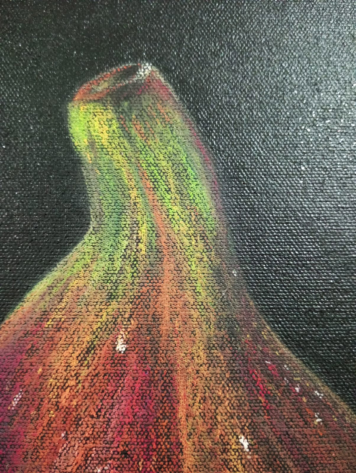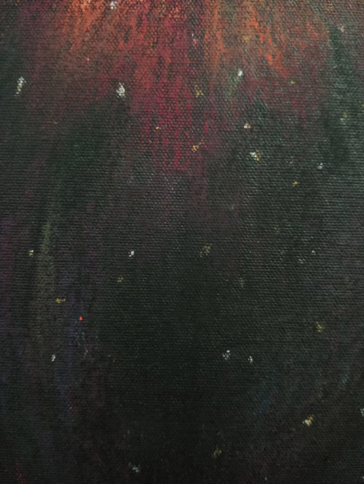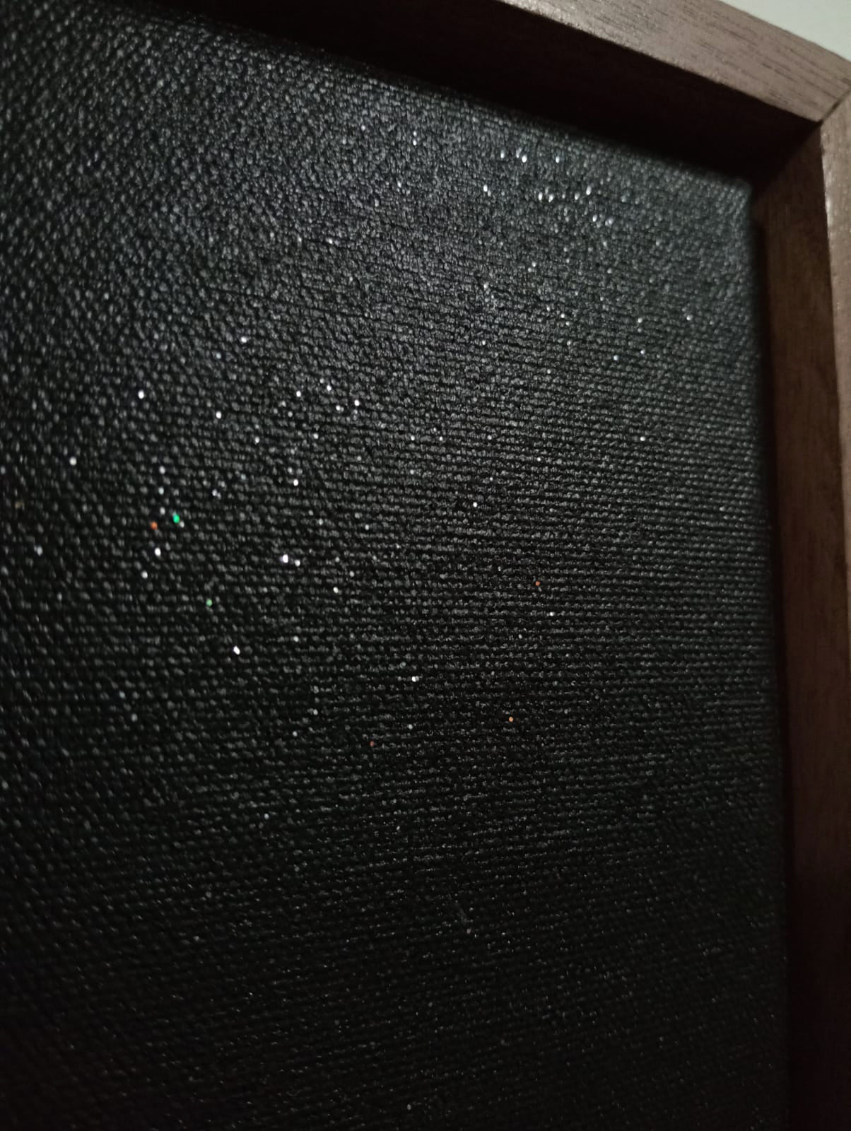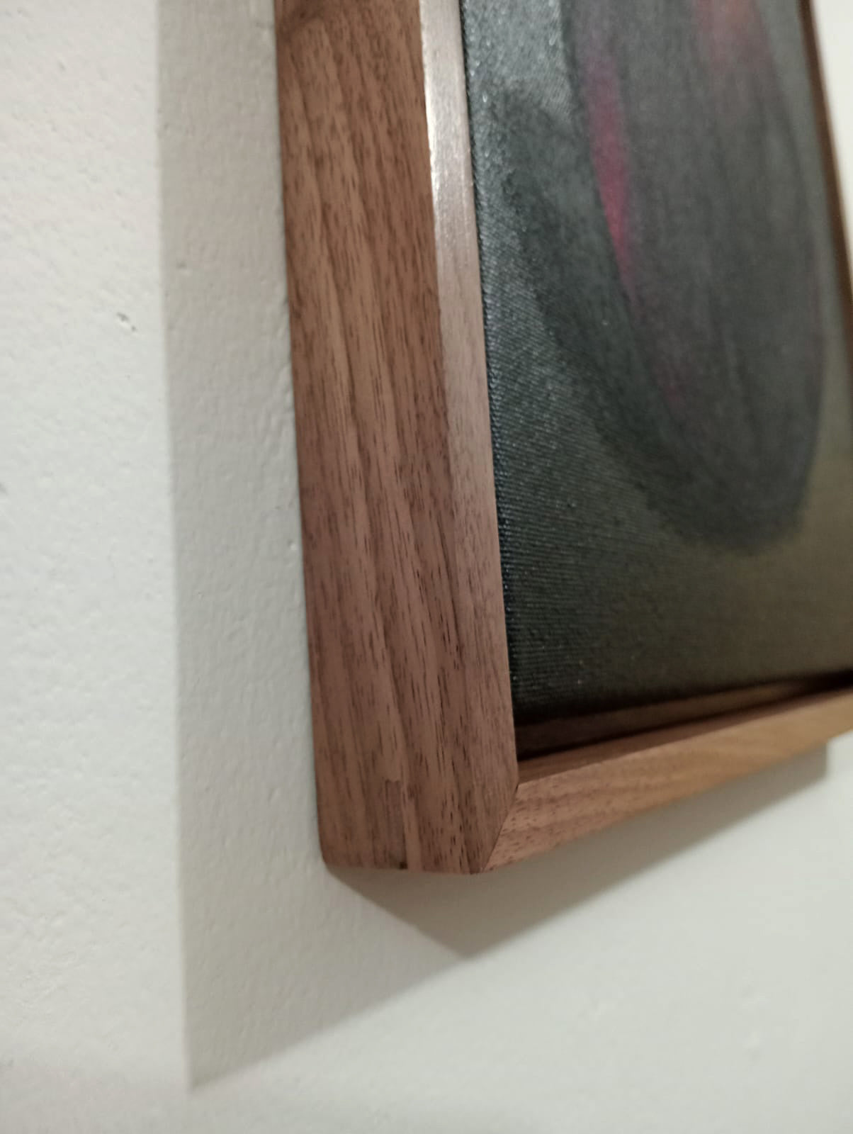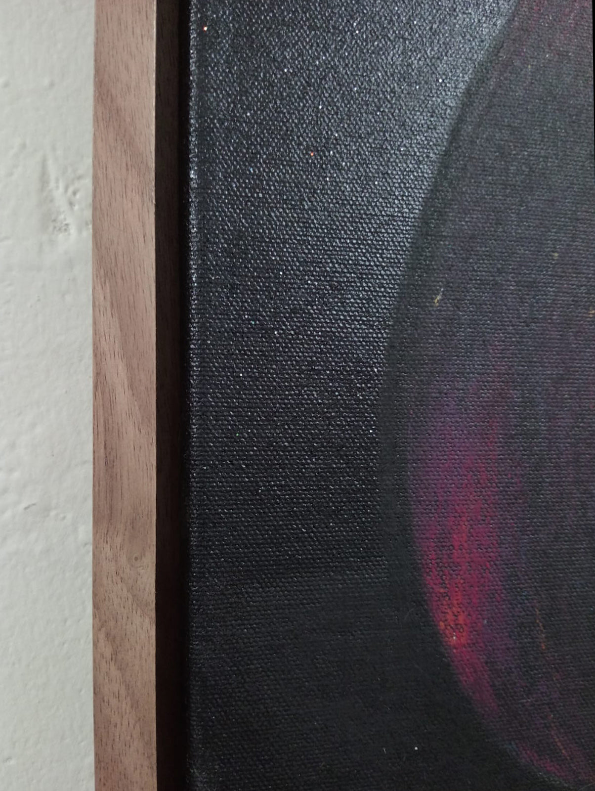 Óleo pastel, pintura acrílica y glitter sobre tela. Enmarcado con caja veneciana de madera de nogal.