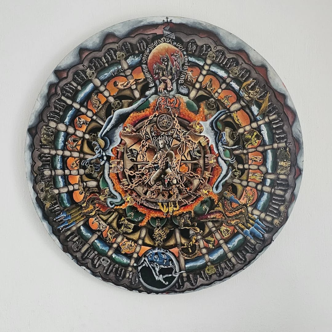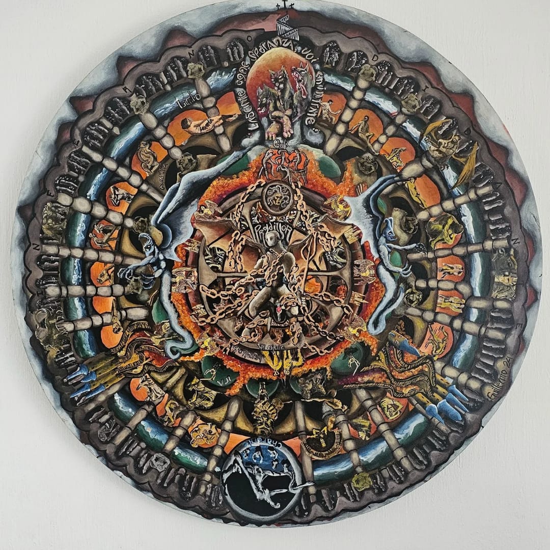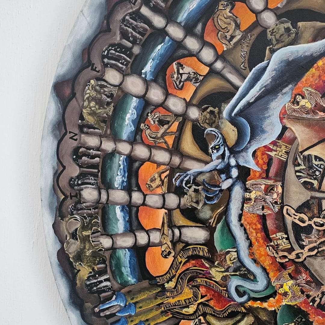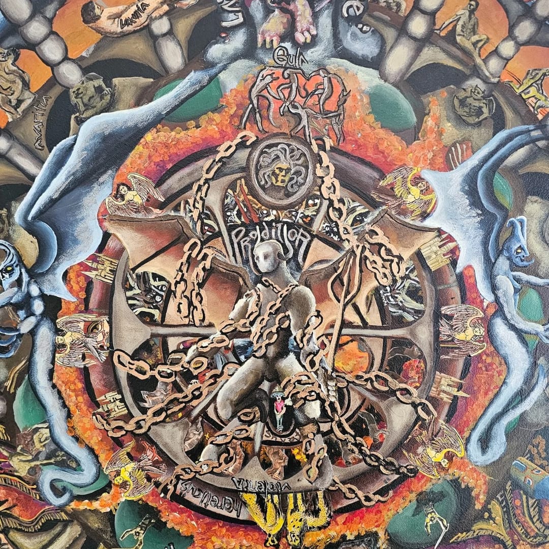 Una representación surrealista de los siete niveles del infierno con los que Dante ilustró el mundo después de la muerte para todos aquellos que morían pecadores. Un cuadro dramático con bastantes detalles, me tomó más de seis meses completarlo.