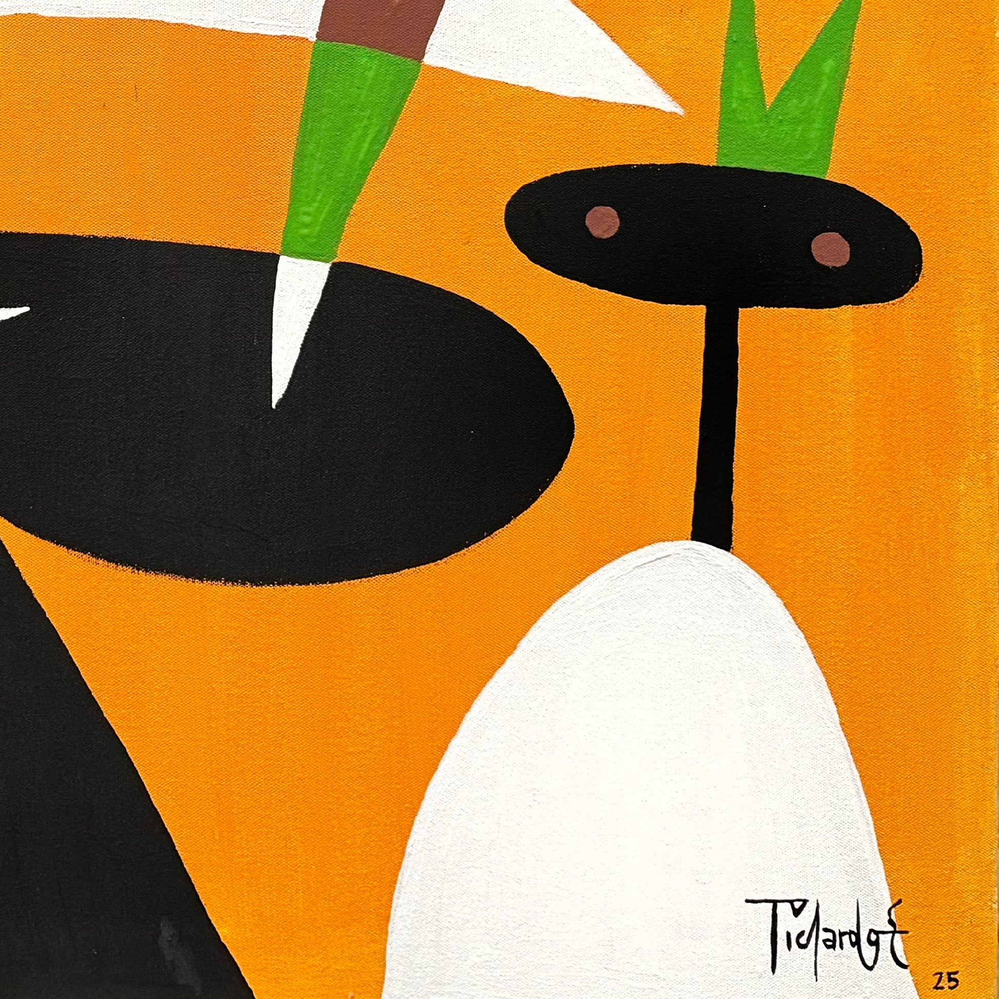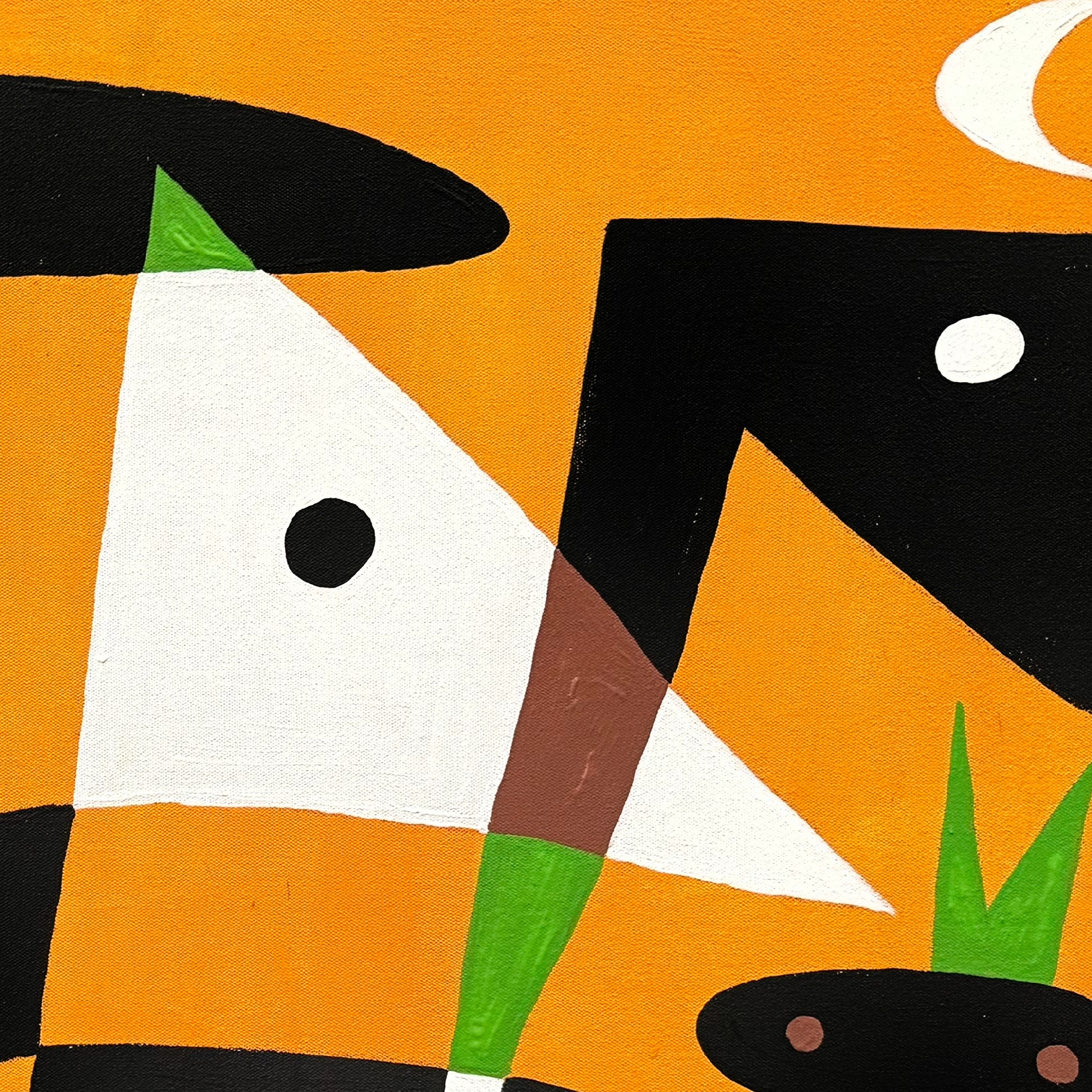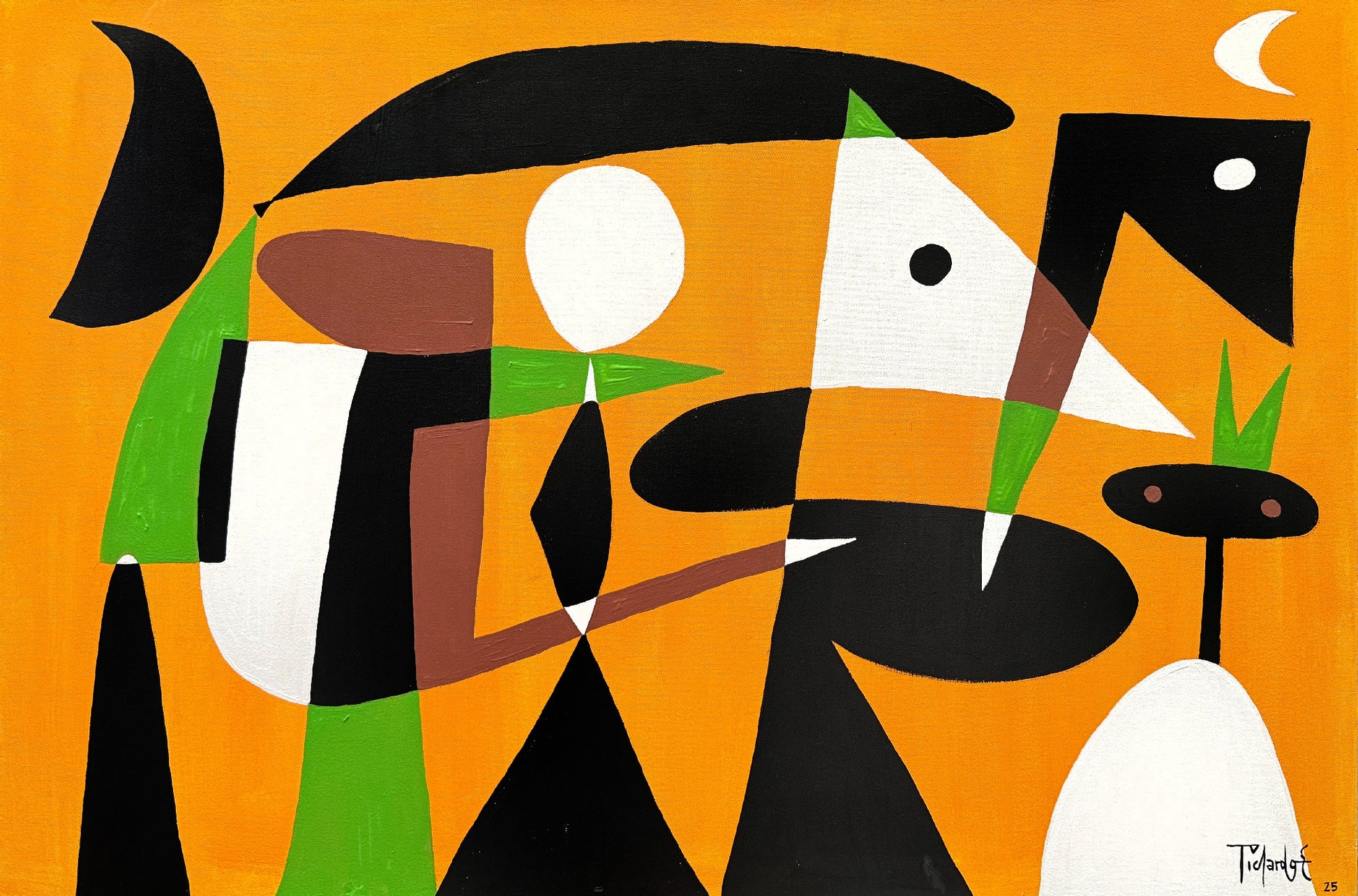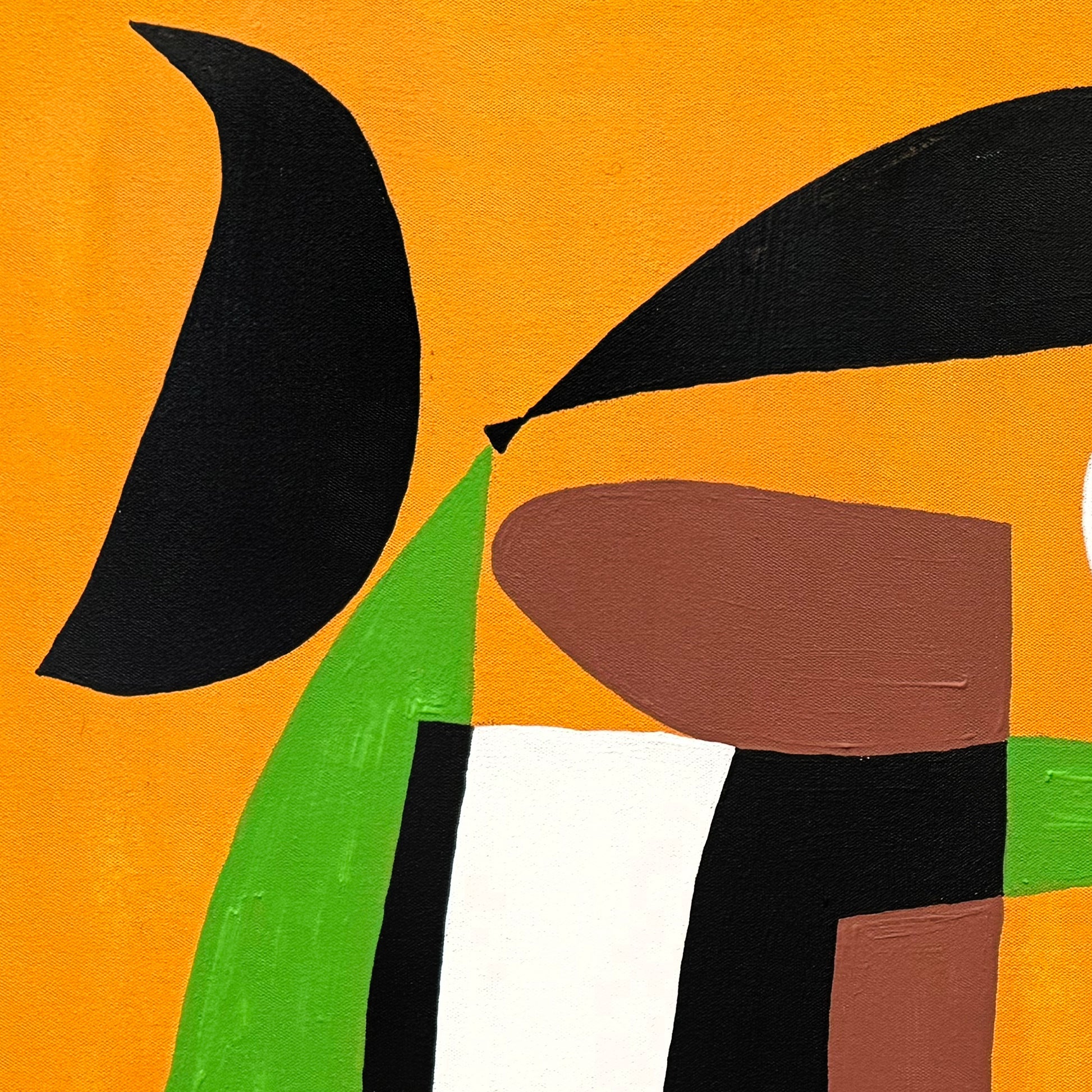El fondo naranja se convierte en un campo vibrante que sostiene todas las operaciones visuales de la obra. Sobre él, las figuras negras adquieren un peso contundente, mientras que los tonos verdes irrumpen con frescura, aportando dirección y verticalidad. La ausencia de sombreado y el uso de colores planos sitúan la pieza en diálogo con tendencias contemporáneas del arte abstracto, donde la fuerza cromática y la lectura inmediata del color actúan como motores perceptivos.