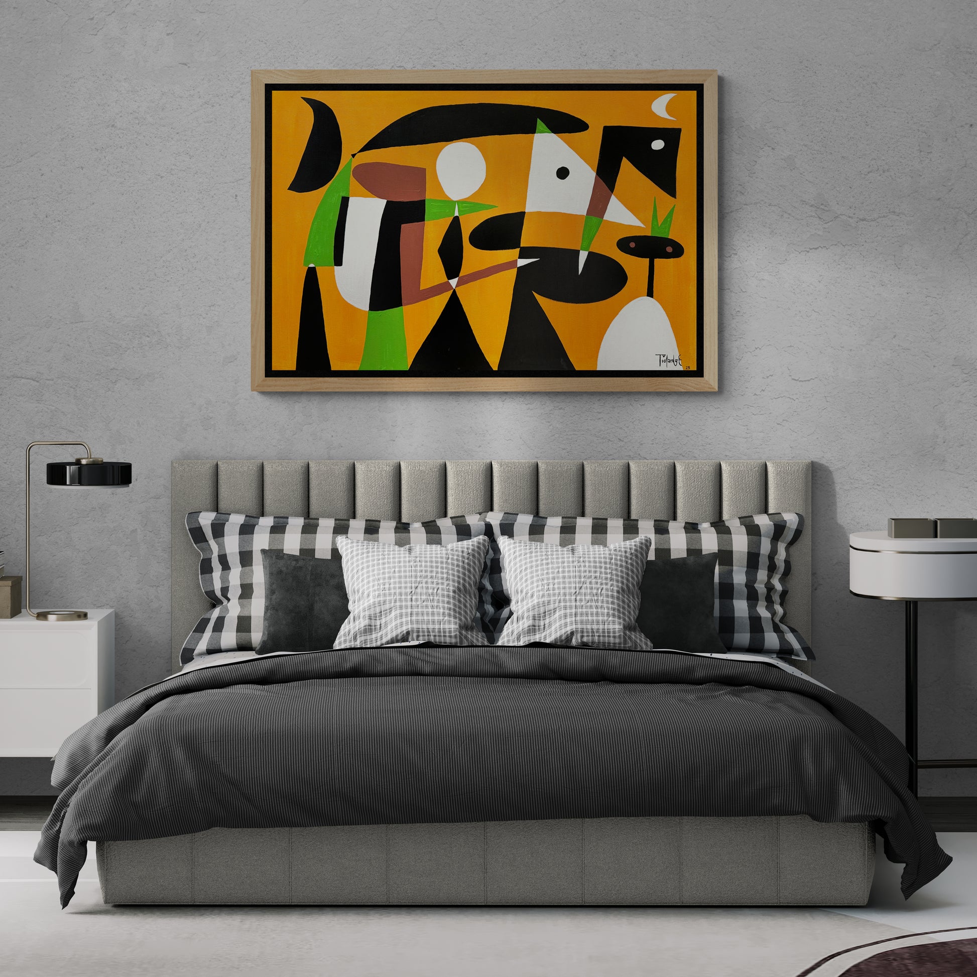 Las figuras triangulares, curvas y ovaladas se enlazan dentro de una estructura abstracta que logra equilibrar tensión y fluidez. Cada forma dialoga con la siguiente, como en un rompecabezas intuitivo donde todo ocupa un lugar preciso. Las zonas negras funcionan como puntos de anclaje visual y los acentos blancos y verdes actúan como contrapesos que iluminan la composición. Esta combinación remite a la síntesis gráfica de Miró y al ritmo escultórico de Calder, influencias perceptibles sin restar autenticidad al lenguaje personal de Pichardo.