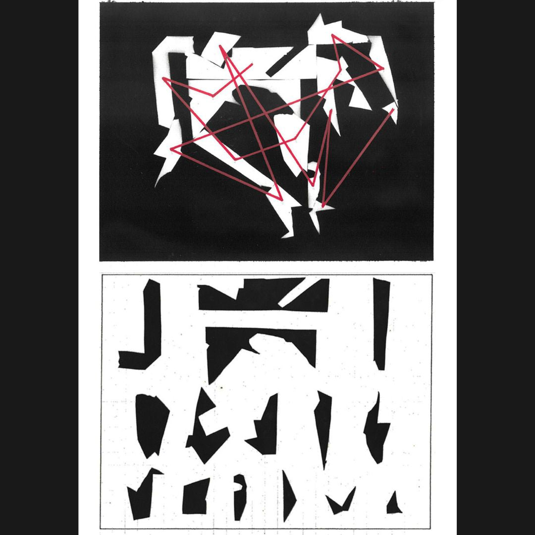 Después, partiendo de este orden, los fragmentos fueron unidos en las composiciones mediante una línea roja que seguía el criterio de clasificación previa. Esto dio como resultado un tipo imprevisto de visualidad en las composiciones iniciales.