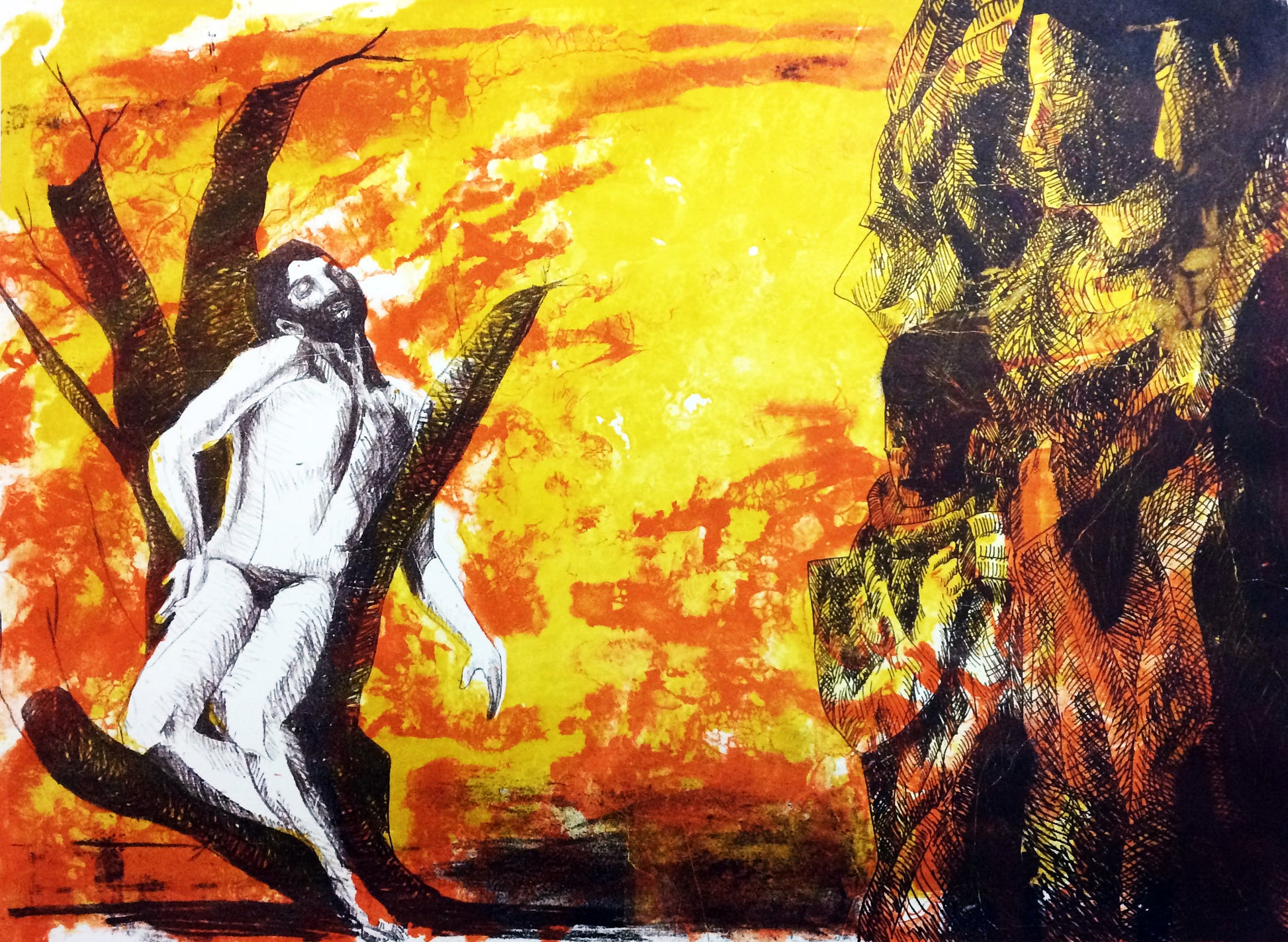 Litografía de 2004 a tres tintas, el martirio del santo desconocido, un martirio en el que figuras a lo lejos permanecen en la obscuridad sin intervenir, inertes e indolentes ante su sufrimiento, ¿tiene que sufrir para ser un santo? o ¿tiene que ser un santo para sufrir? al fin y al cabo está solo.