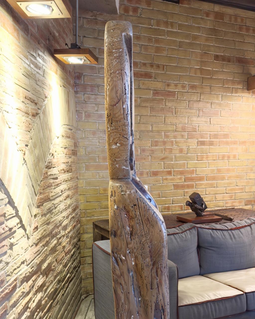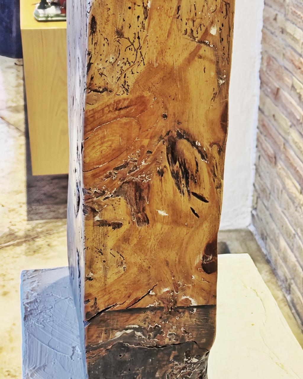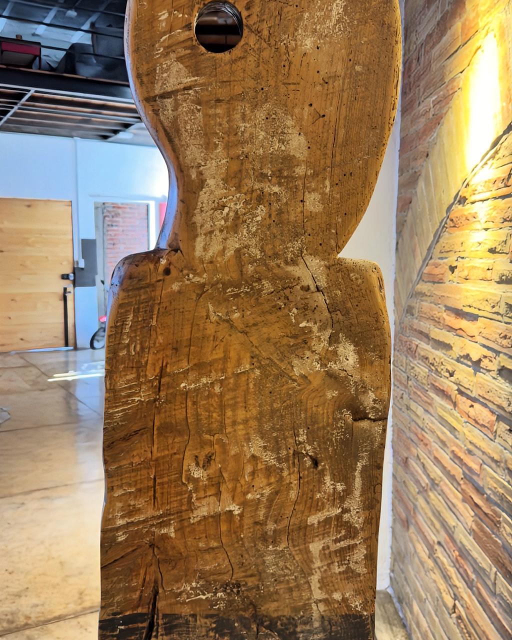 Tallado en una madera centenaria, este personaje se yergue como testigo silencioso del tiempo. Su figura, austera y firme, contempla el mundo con distancia casi glacial; nada lo perturba, nada lo quiebra. Sin embargo, en su interior late un corazón de acero: no frío, sino indomable. Es la metáfora del ser humano que, aun frente al dolor ajeno y las sombras que lo rodean, permanece en pie. Observa, resiste y existe, sosteniendo en su quietud una fuerza que no se doblega.