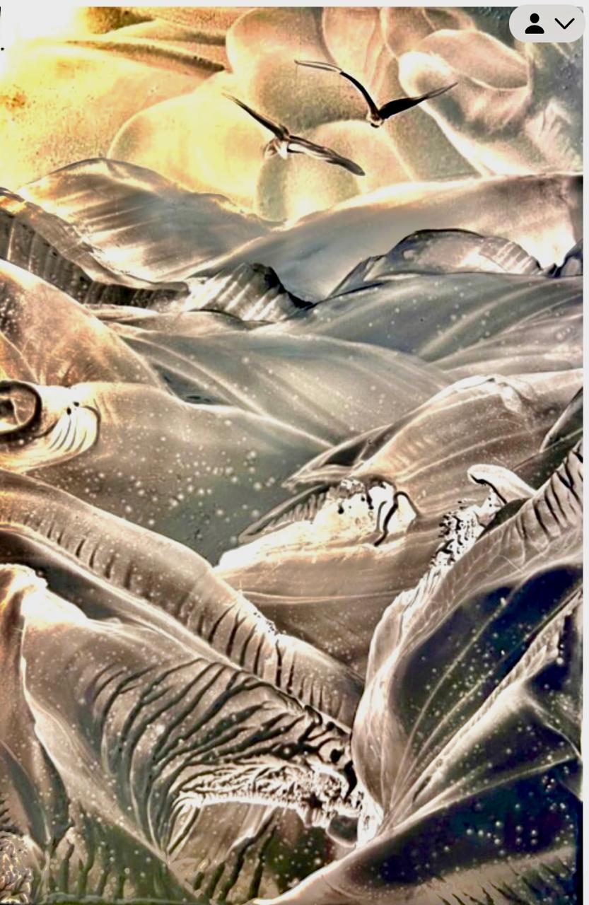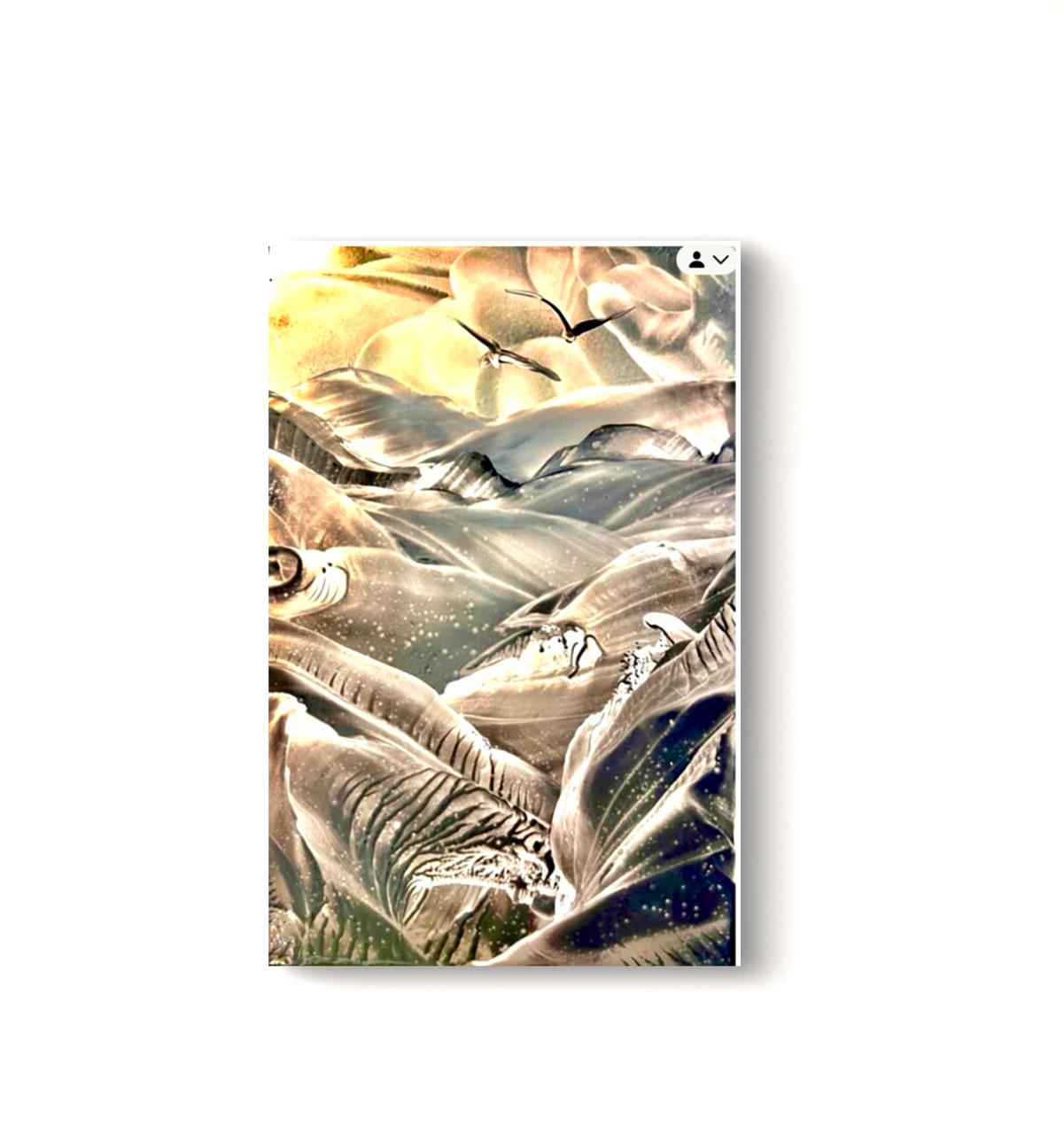 El juego de texturas y tonos metálicos, que van desde los dorados hasta los grises, invita al espectador a sumergirse en la inmensidad de un paisaje sereno y contemplativo. La obra captura la esencia de este icónico lugar, ofreciendo una interpretación artística única del Tepozteco, donde las montañas parecen fluir y cambiar de forma, reflejando la interacción constante entre la naturaleza y la luz.
