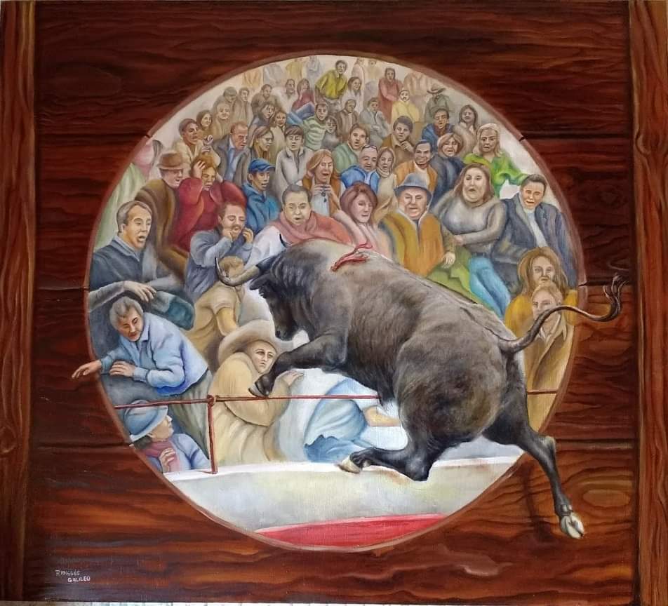 Representación artística del momento en que el toro "Pajarito" brinco a la gradería de la plaza México en una corrida de toros de la temporada grande. Óleo