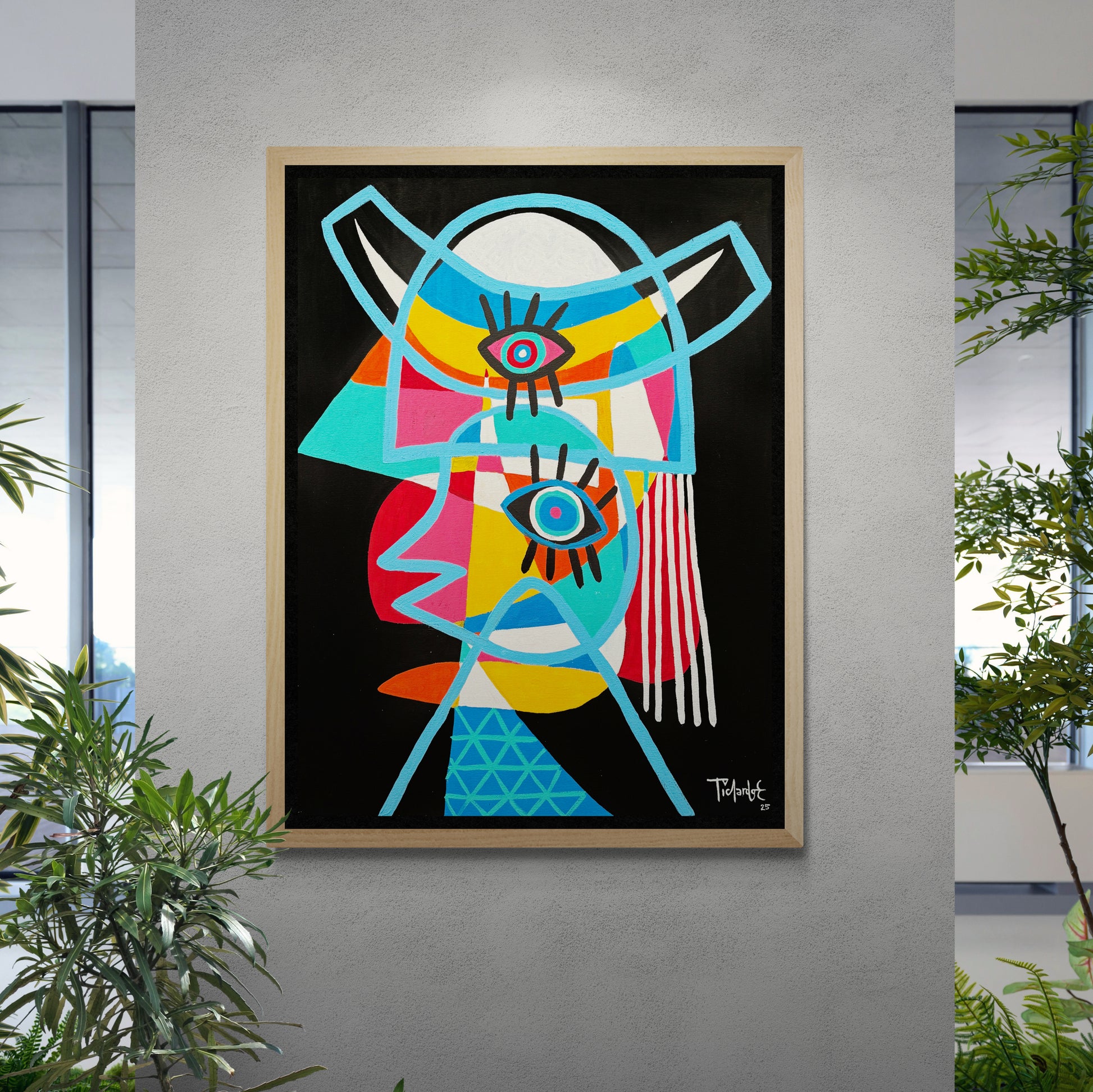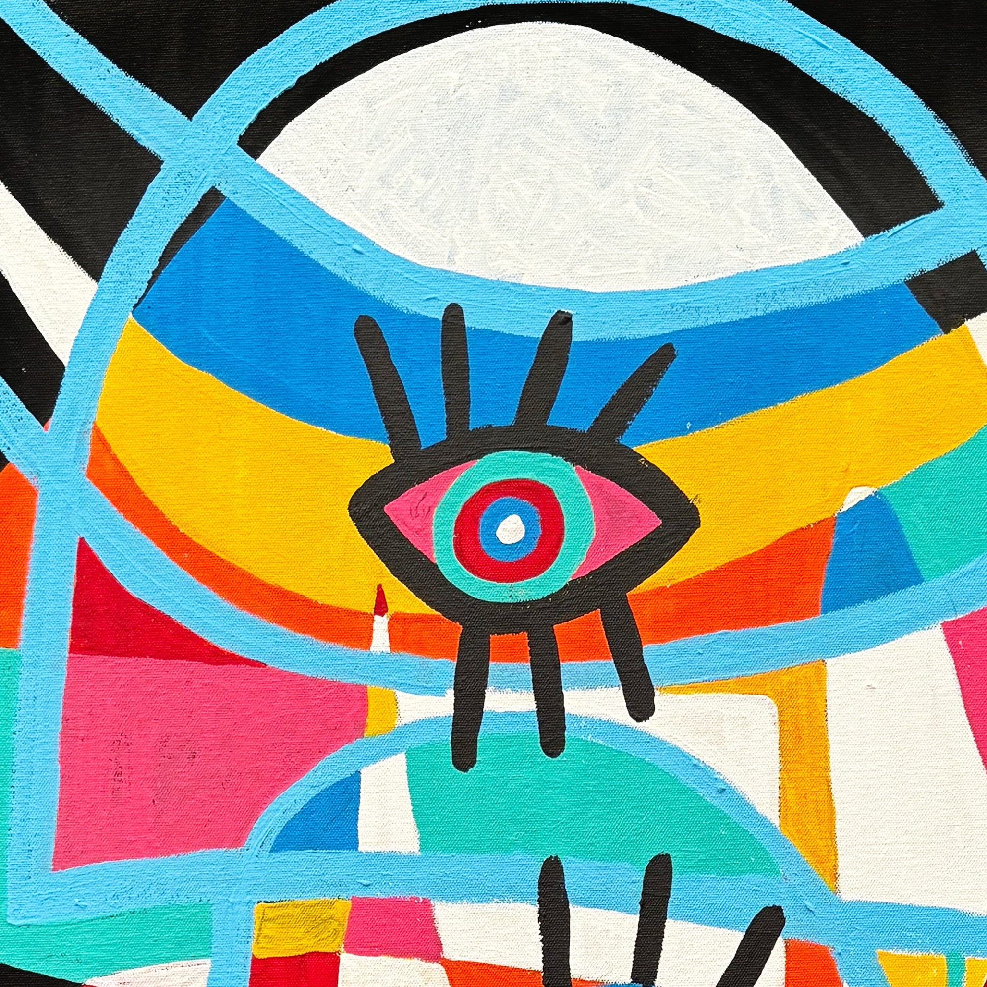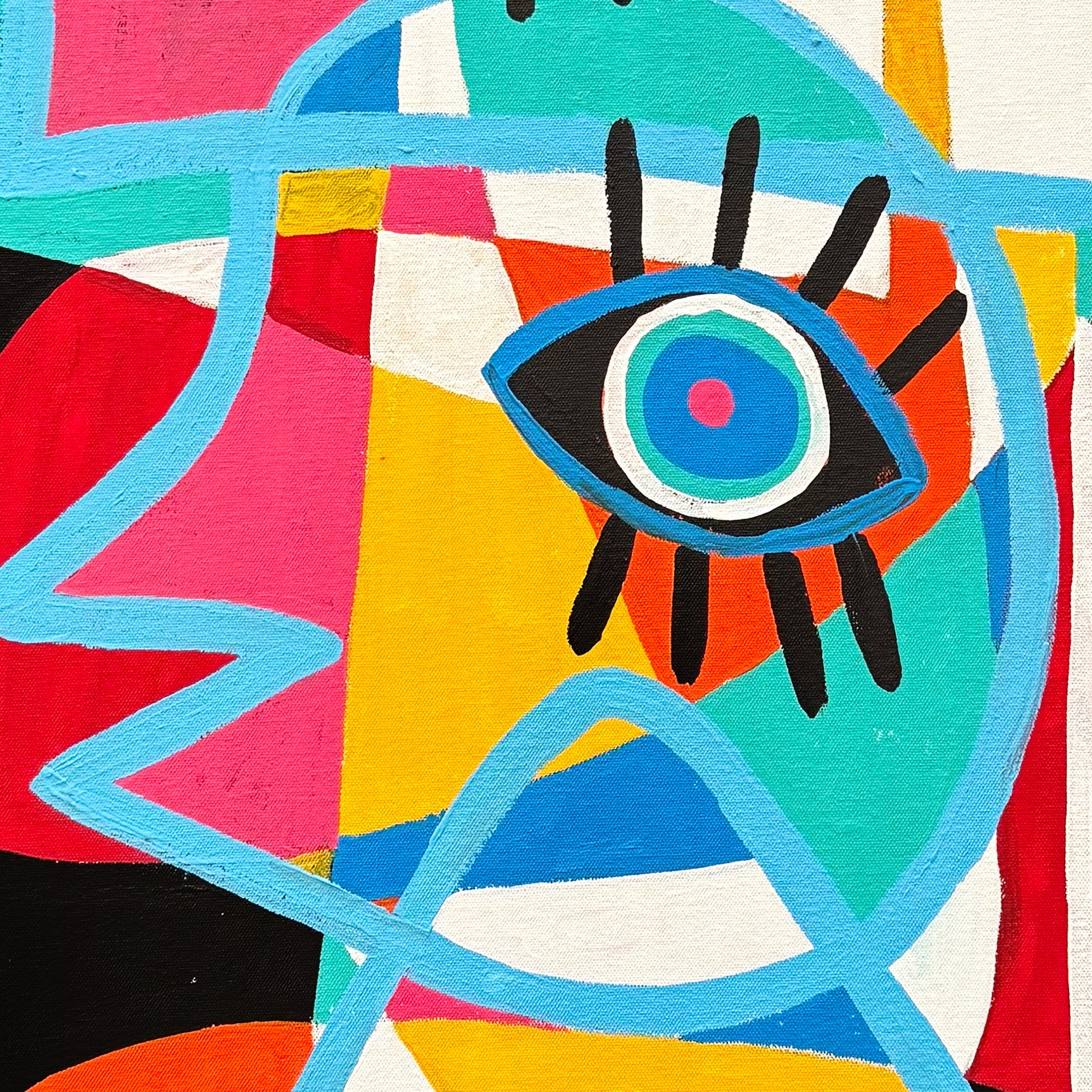 La obra se organiza a partir de planos de color bien definidos que se superponen dentro del contorno del personaje. Se observan colores intensos como azul, amarillo, rojo, turquesa y blanco, equilibrados sobre un fondo negro que refuerza la silueta. Los ojos, repetidos y de gran presencia gráfica, funcionan como ejes visuales que articulan la composición y generan un ritmo visual constante, característico del estilo libre del artista.