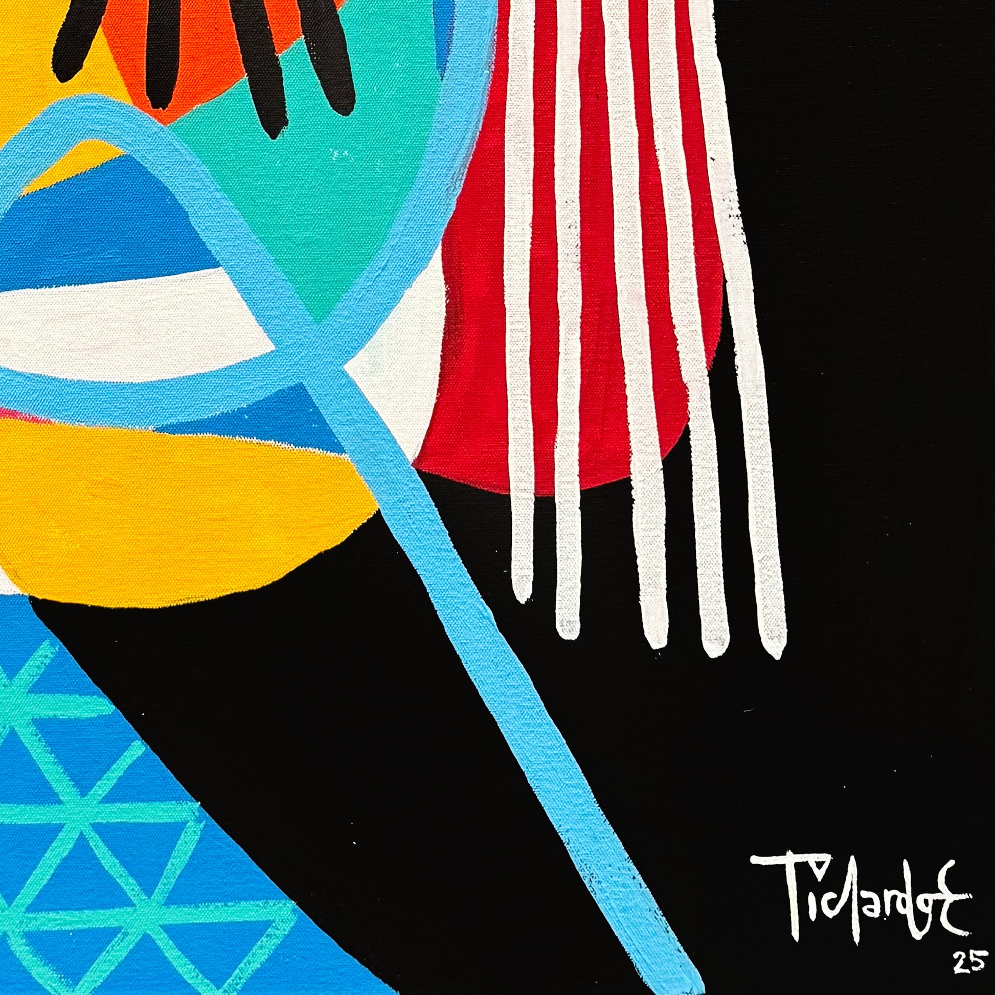 El trazo negro delimita cada sección cromática con firmeza, creando una estética cercana a la pintura figurativa contemporánea con influencias del arte moderno y una clara intención gráfica. La disposición asimétrica de los elementos, junto con patrones geométricos y franjas lineales, aporta dinamismo y una sensación de movimiento interno sin necesidad de acción narrativa explícita.