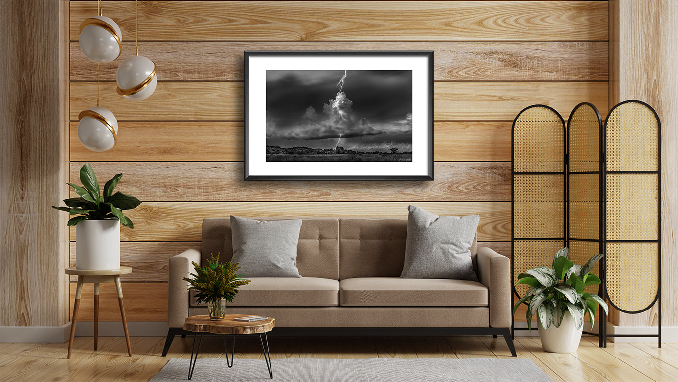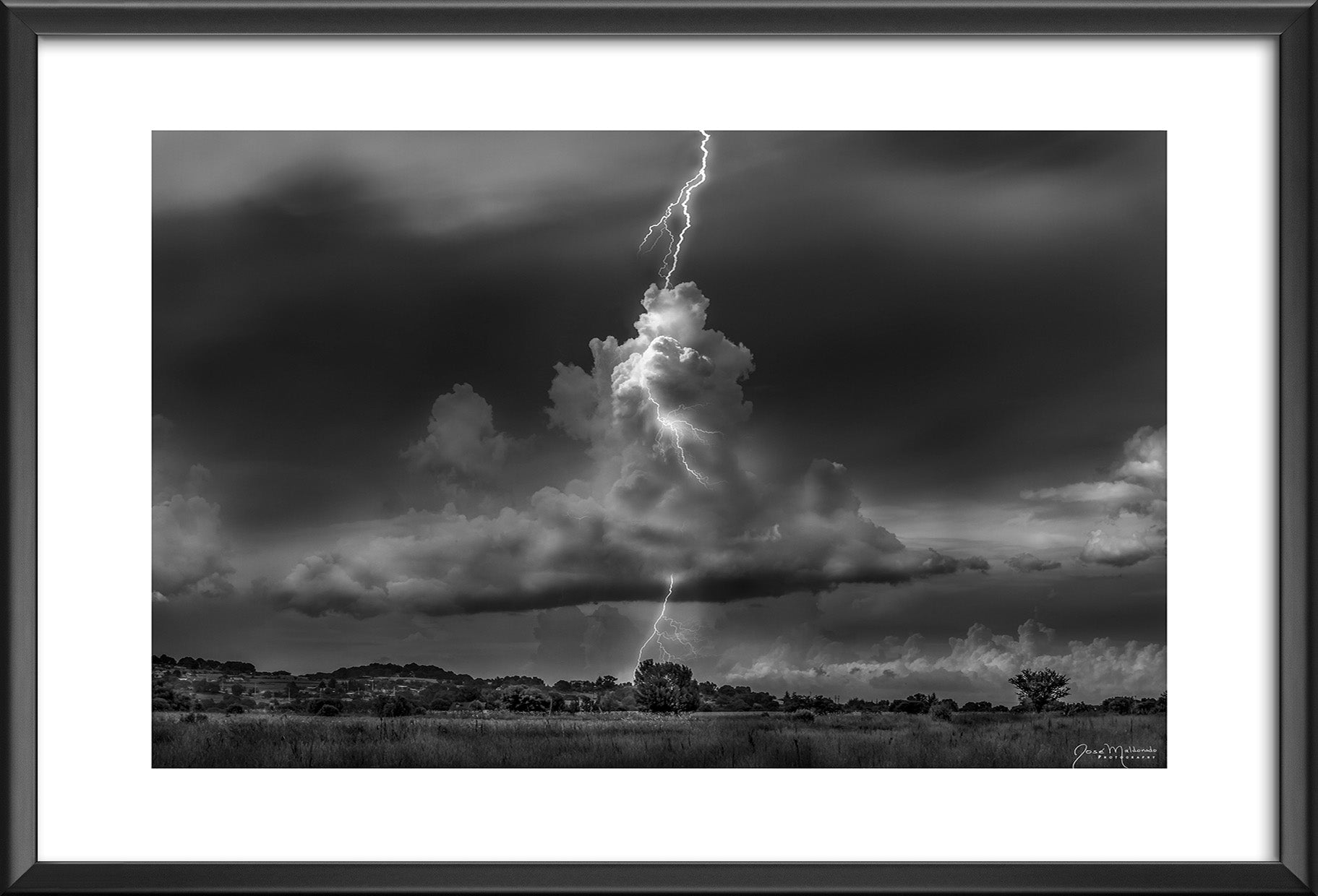 Esta obra fotográfica en blanco y negro captura un momento impresionante y poderoso: un relámpago cayendo sobre un sembradío de Huasca, Hidalgo.