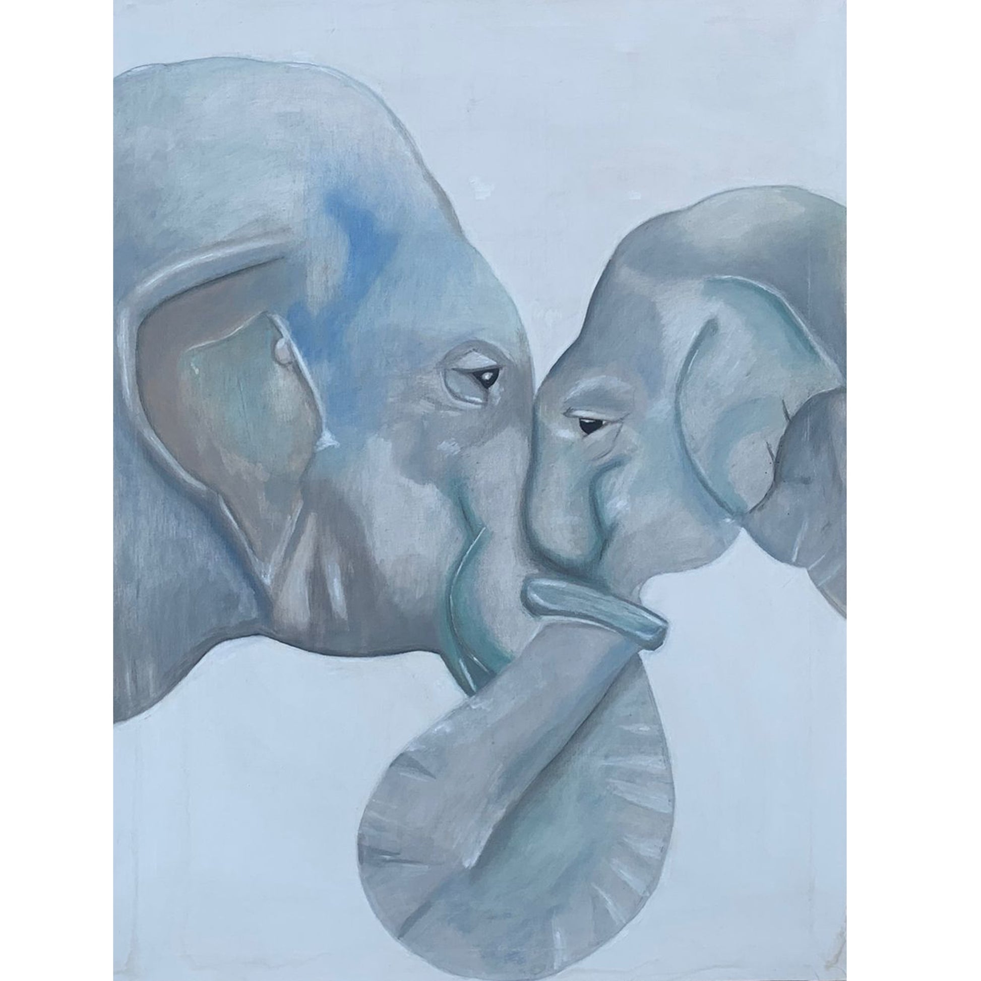 La pintura representa una Madre y su hijo, Elefantes que capturan la profunda conexión entre los dos a través de colores cálidos y gestos íntimos. La madre representada con una expresión serena, mira a su hijo con ternura, transmitiendo amor y protección. Se aprecia una atmósfera acogedora, simbolizando la seguridad. Esta obra evoca sentimientos de ternura y la belleza de la maternidad, invitando al espectador a reflexionar sobre los lazos familiares y la importancia del amor maternal.