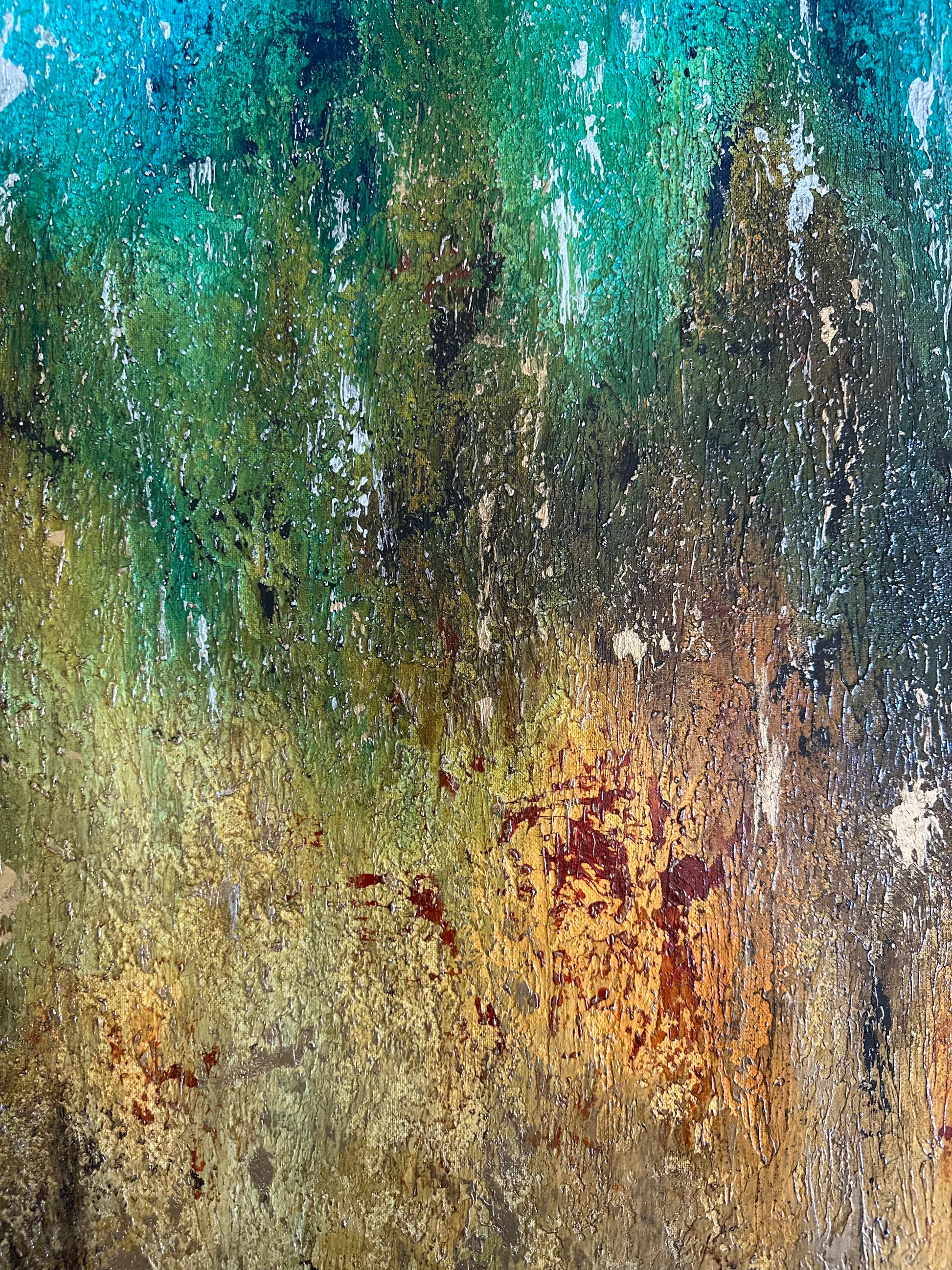 Acrílico con textura, polvo de oro y plata sobre lienzo.