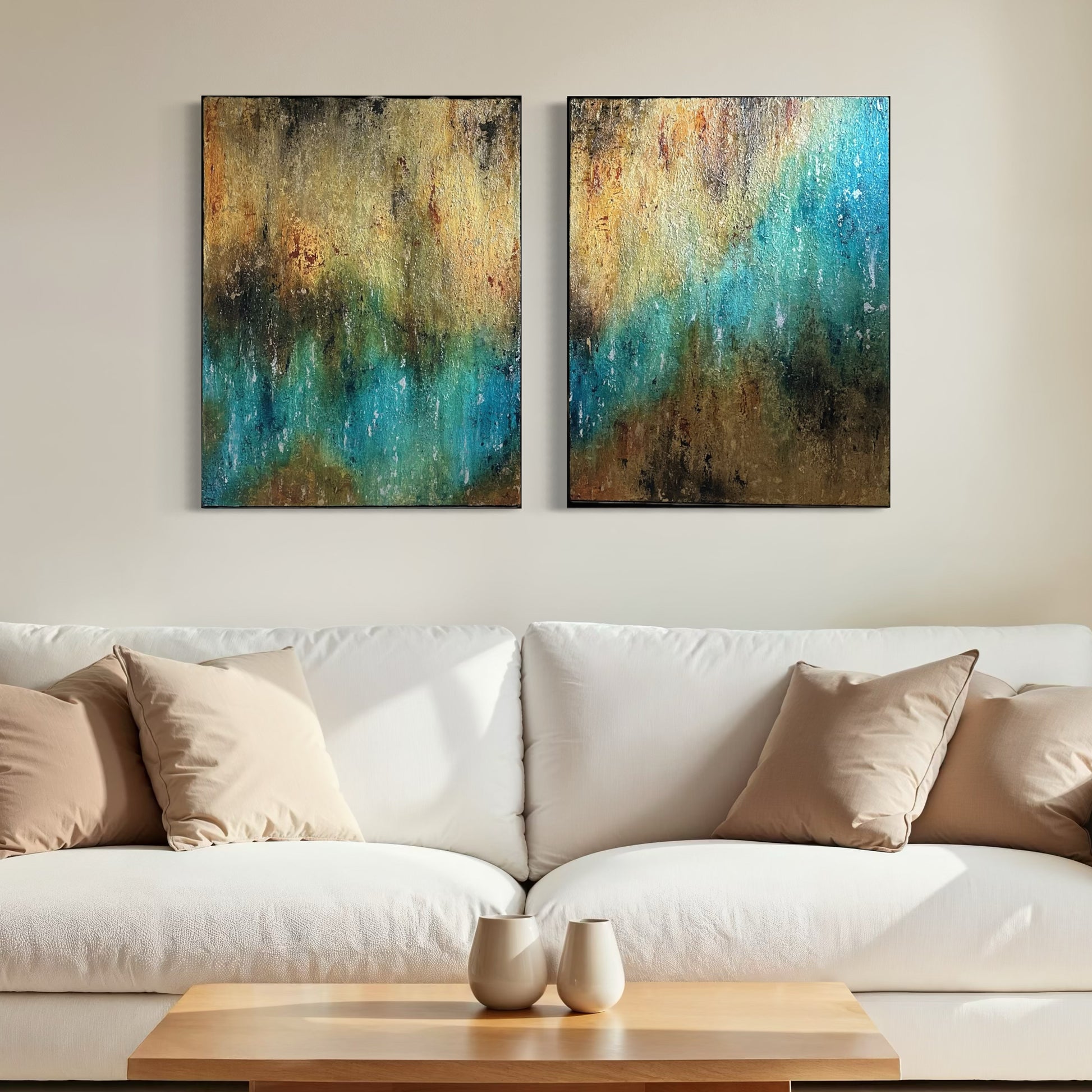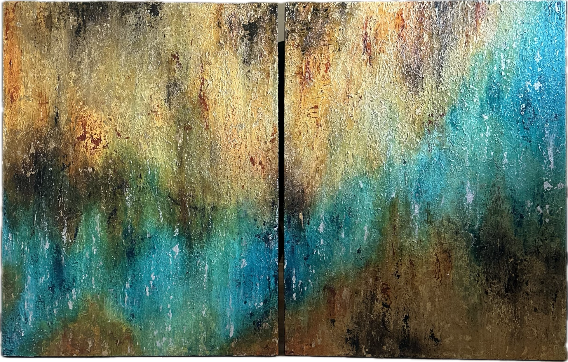 Esta obra nace de la energía vibrante de los colores y su contraste, representa la coexistencia viva de los cuatro elementos:el fuego (tonos dorados y rojizos), el aire (transiciones ligeras y etéreas), la tierra (textura profunda y oscura), y el agua(azules intensos y fluidez).
