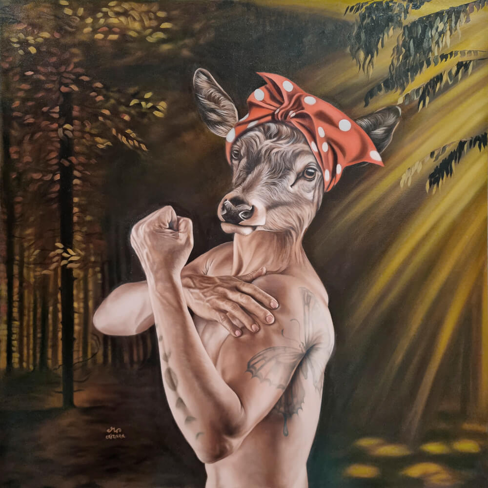 Esta obra reinterpreta la icónica propaganda de 1943 She Can Do It! en un contexto contemporáneo, con un mensaje de empoderamiento y transformación personal. Inspirada en el espíritu de fuerza de la Segunda Guerra Mundial y la era industrial, esta composición invita a despertar, florecer y moverse hacia adelante, rompiendo barreras personales y sociales.