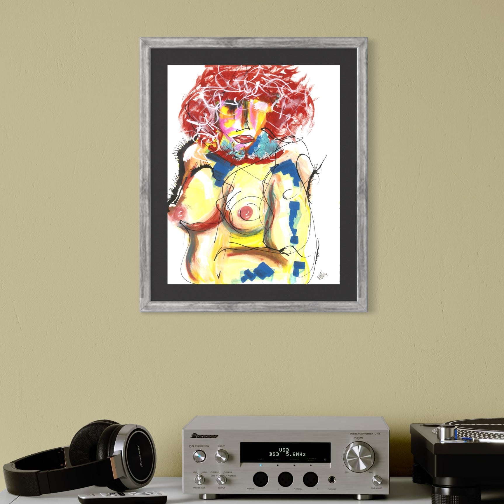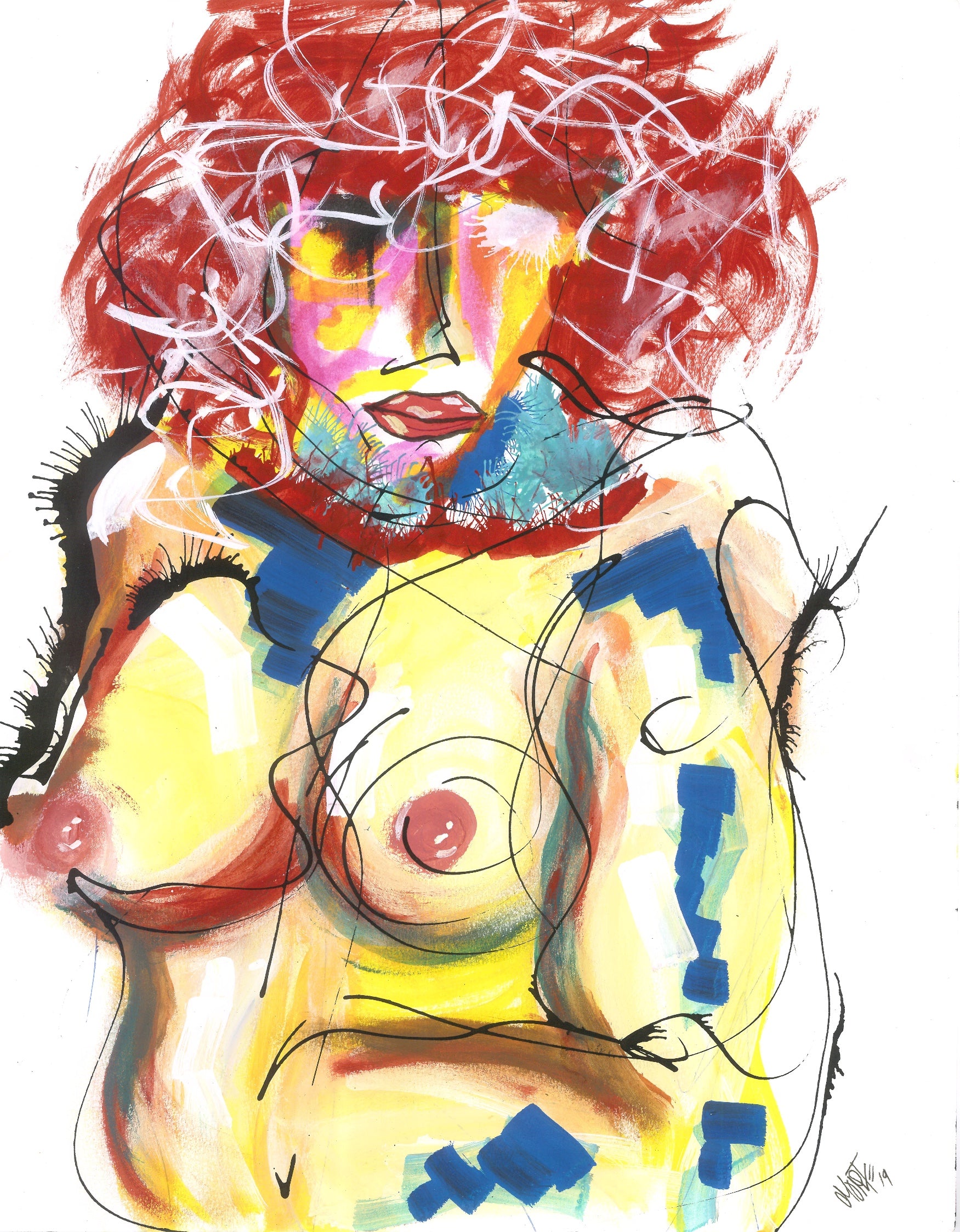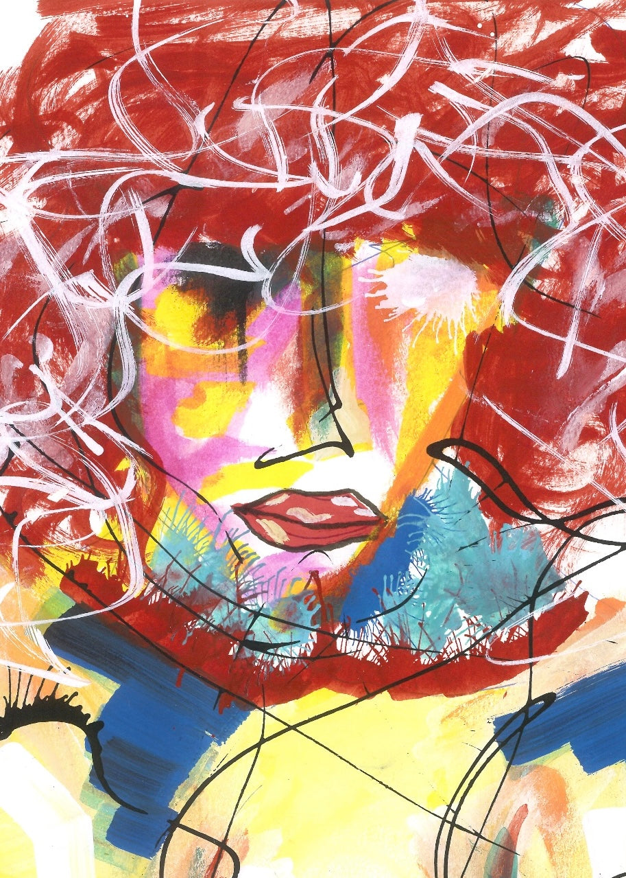 Esta obra explora la tensión entre la exposición y el desconocimiento. La figura femenina fragmentada, sugiere una identidad compleja y distante. Las líneas blancas enredadas sobre el cabello y los bloques de color en el cuerpo refuerzan la idea de una barrera emocional, simbolizando cómo la verdadera esencia del personaje permanece oculta, incluso cuando parece estar expuesta.