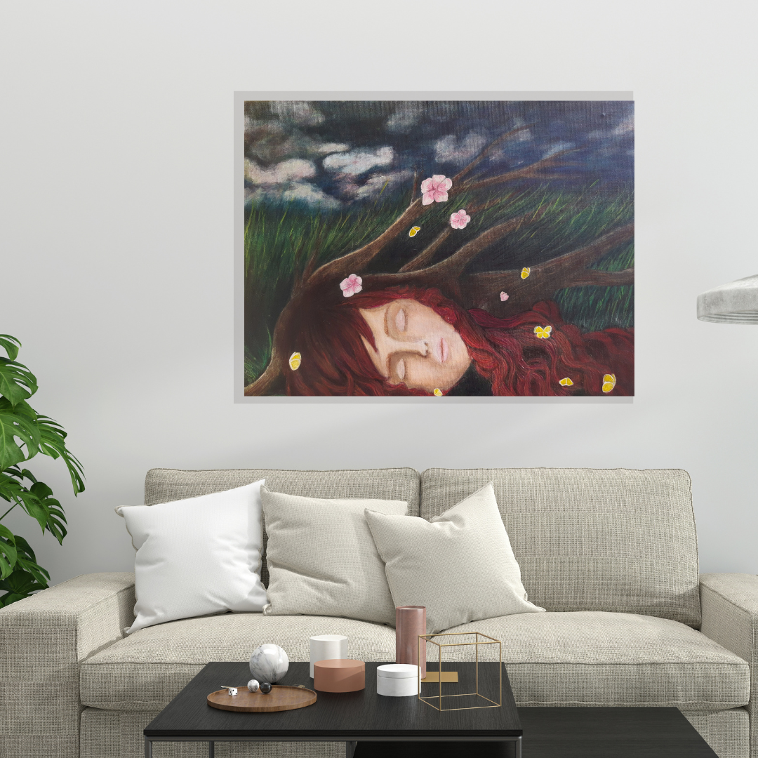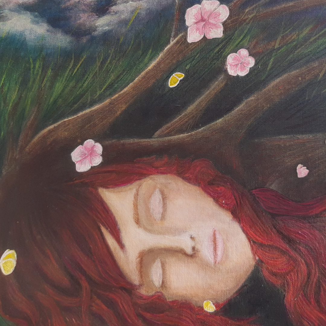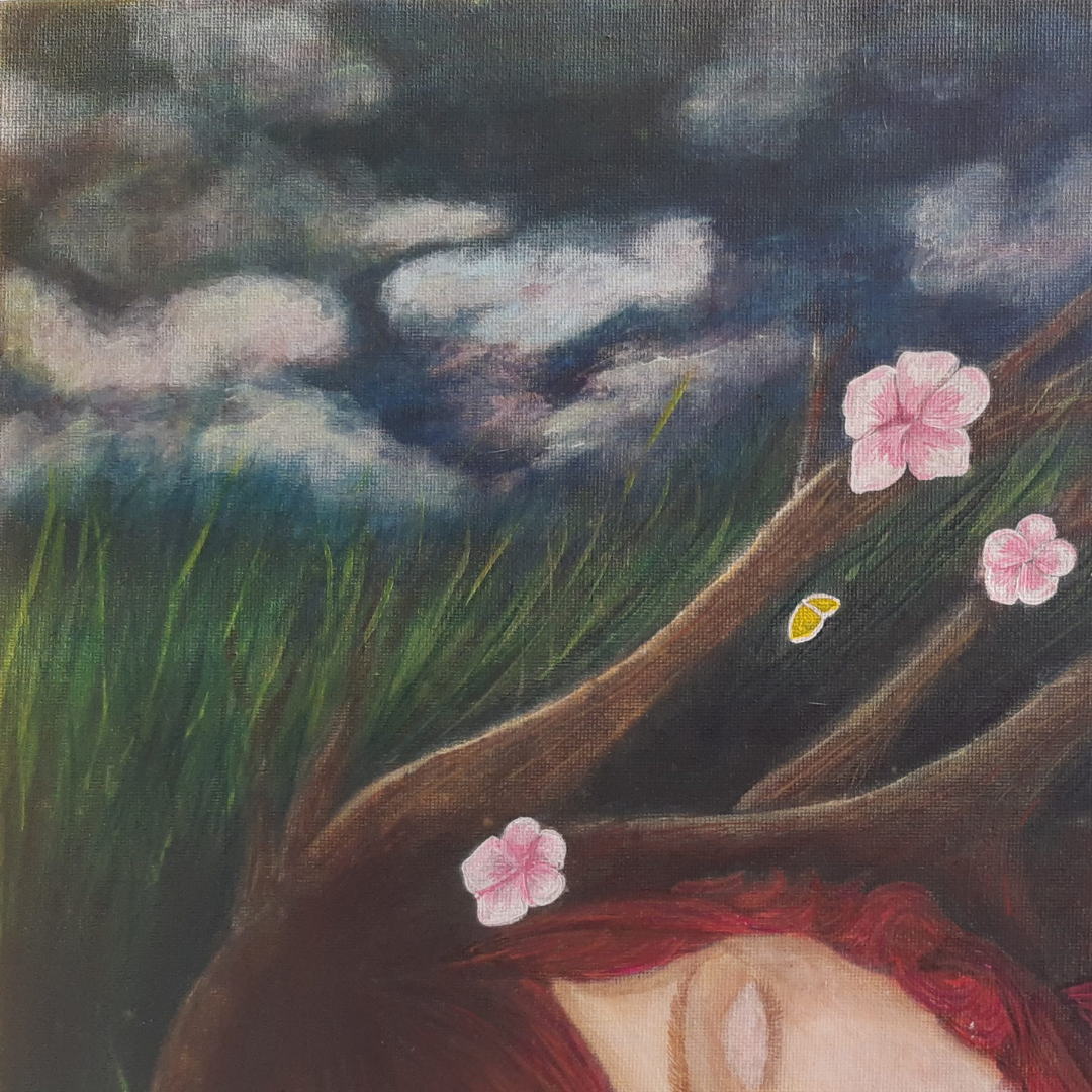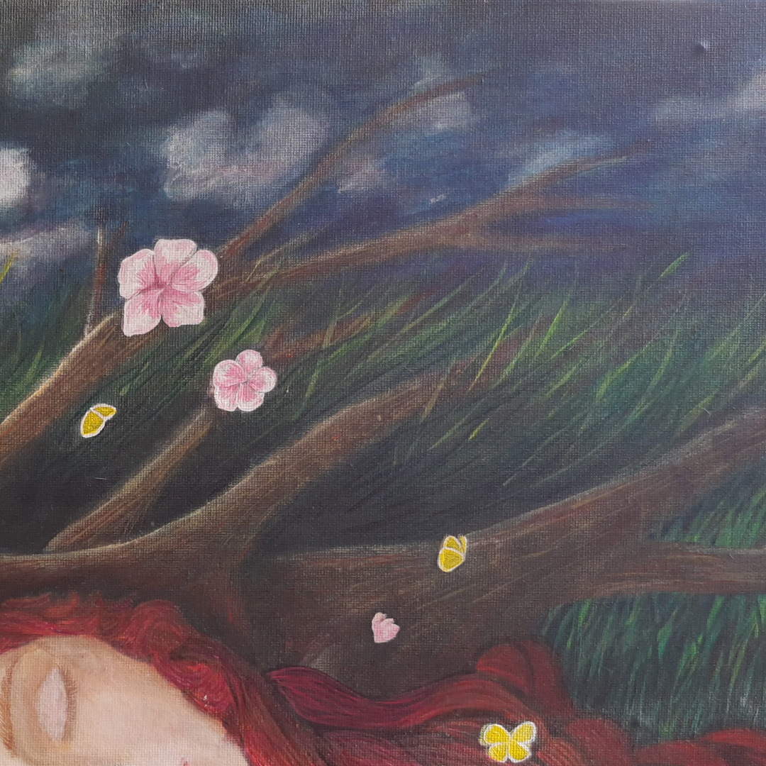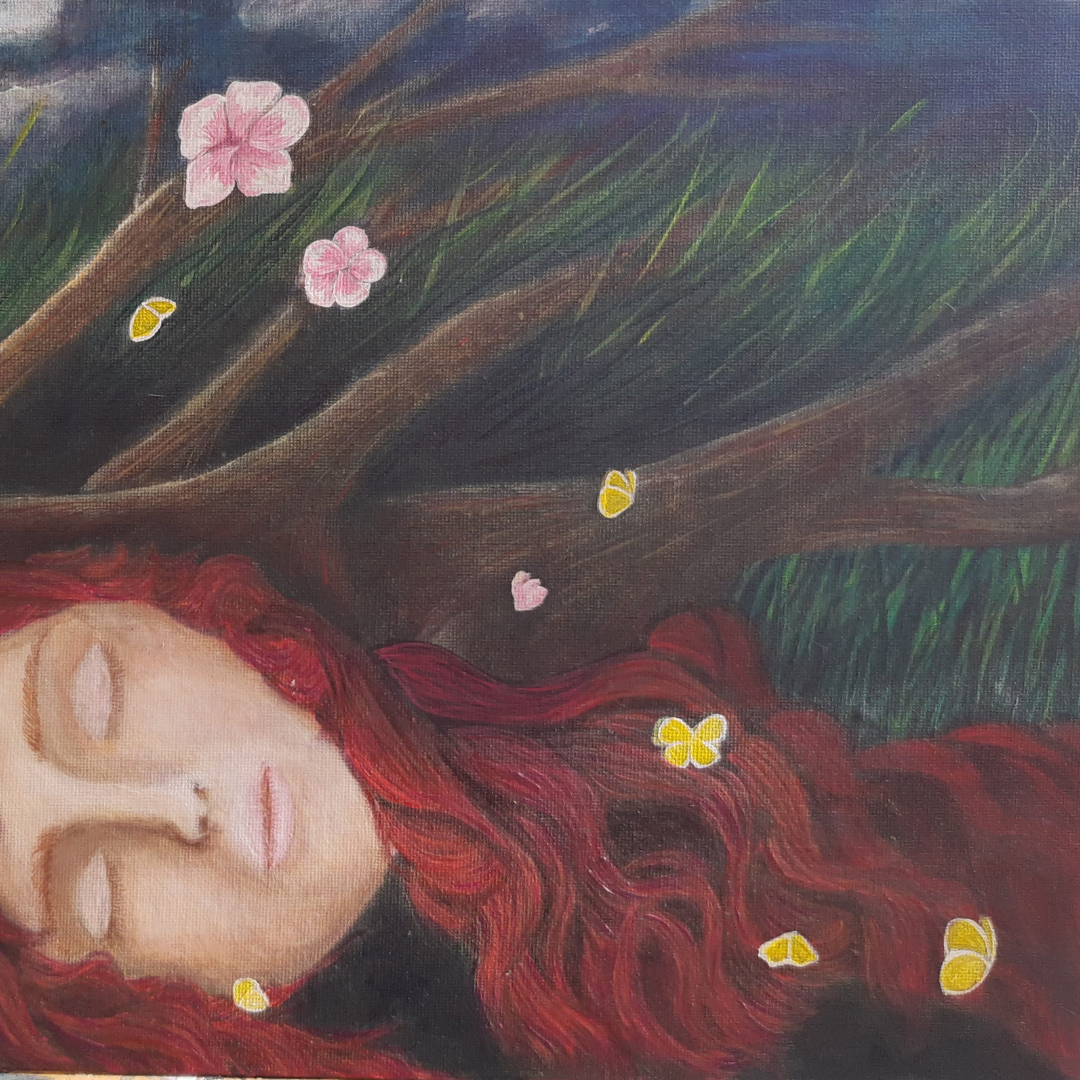 "En el bosque" es una obra que nos refleja tranquilidad, dulzura, melancolía y paz. Podemos ver una joven en calma durmiendo sin embargo no encontramos su cuerpo si no a ella fusionándose con el bosque.