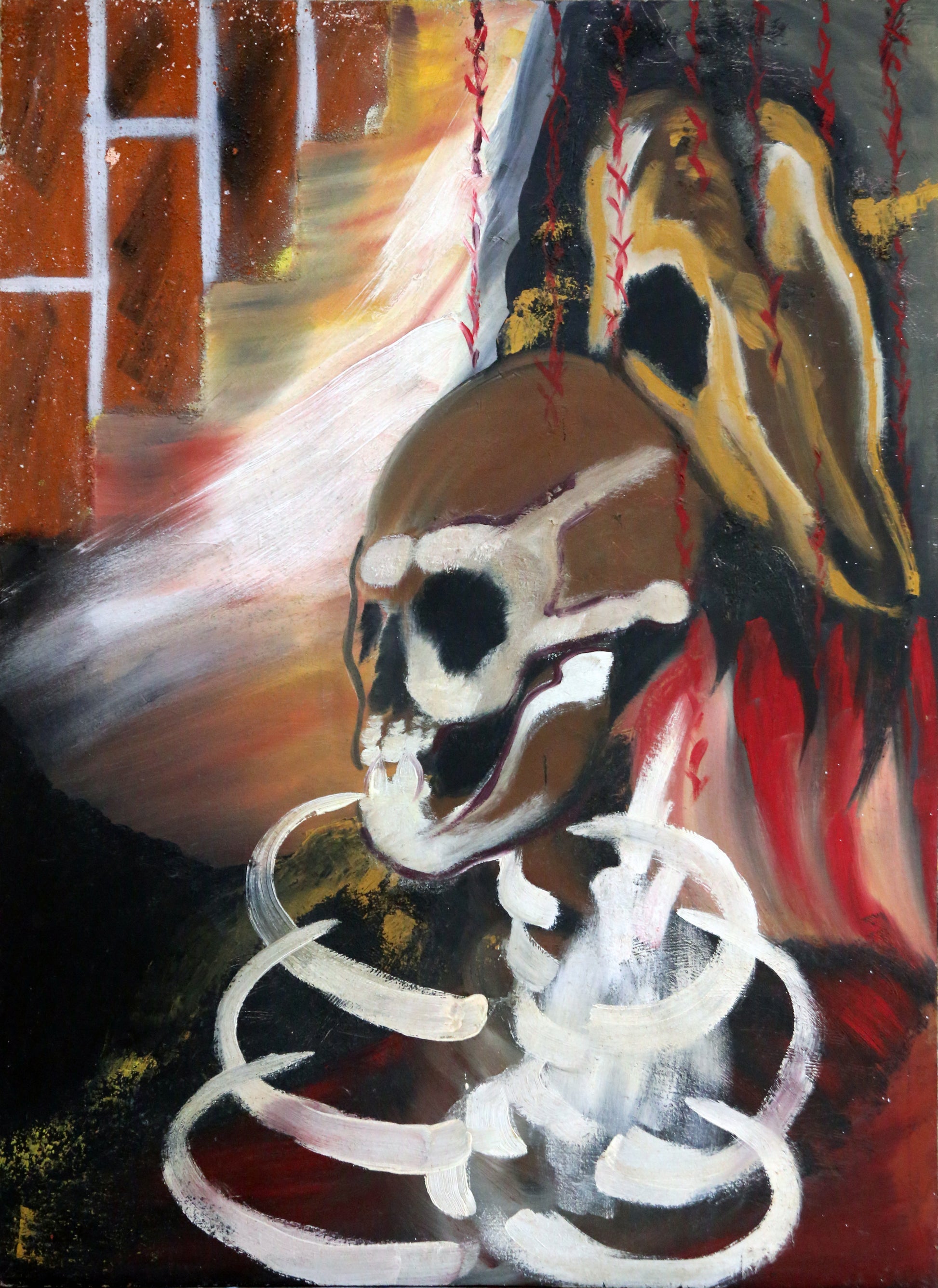 "En el rastro (somos ganado y nuestro alimento es la gasolina)" es una pieza expresionista que presenta un torso humano frente a un cráneo de res, con un fondo de ladrillos y pinceladas toscas. La obra utiliza técnicas mixtas y óleo sobre madera, que refleja la crudeza del consumismo contemporáneo.