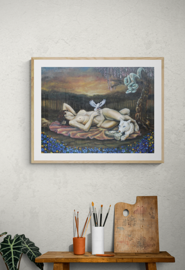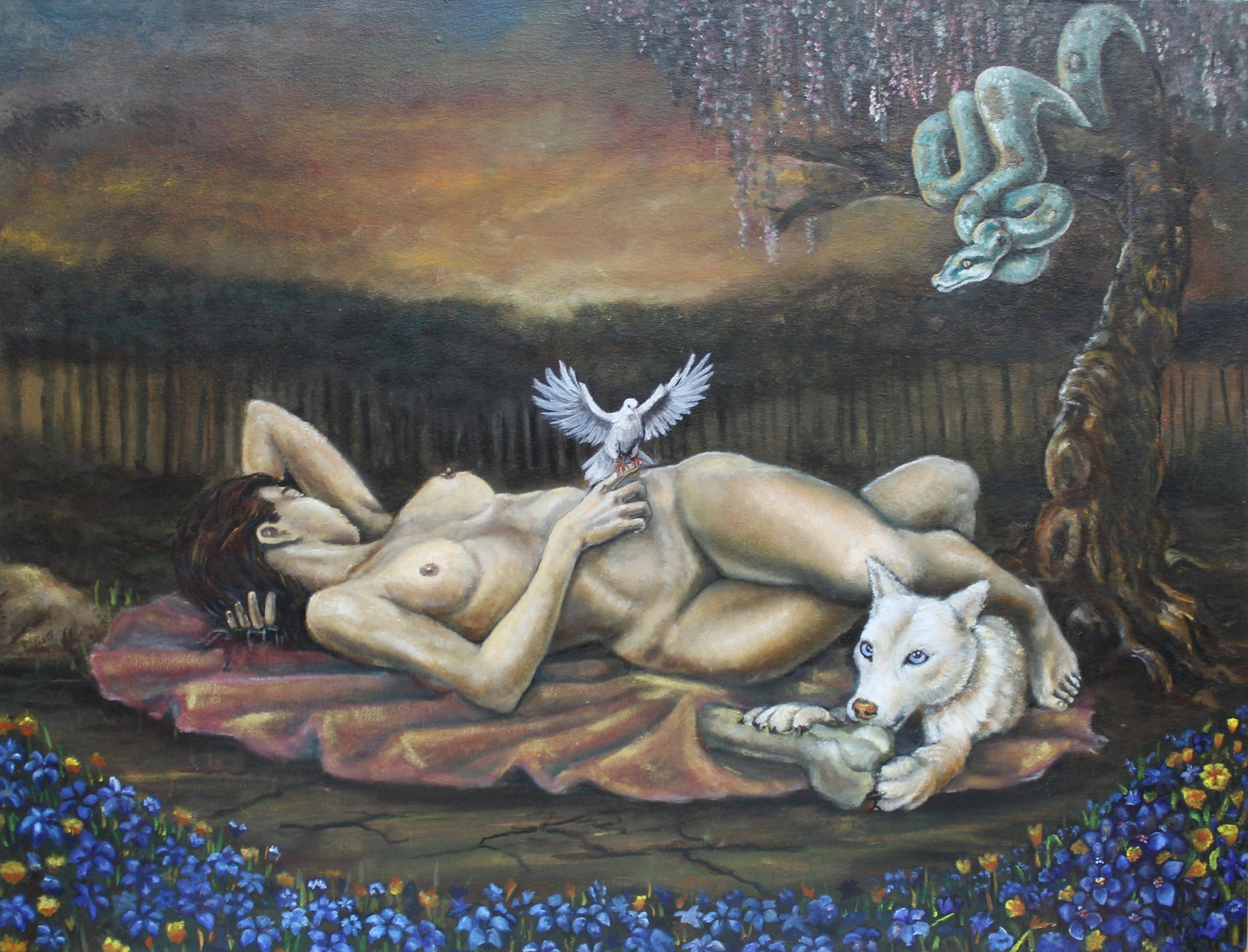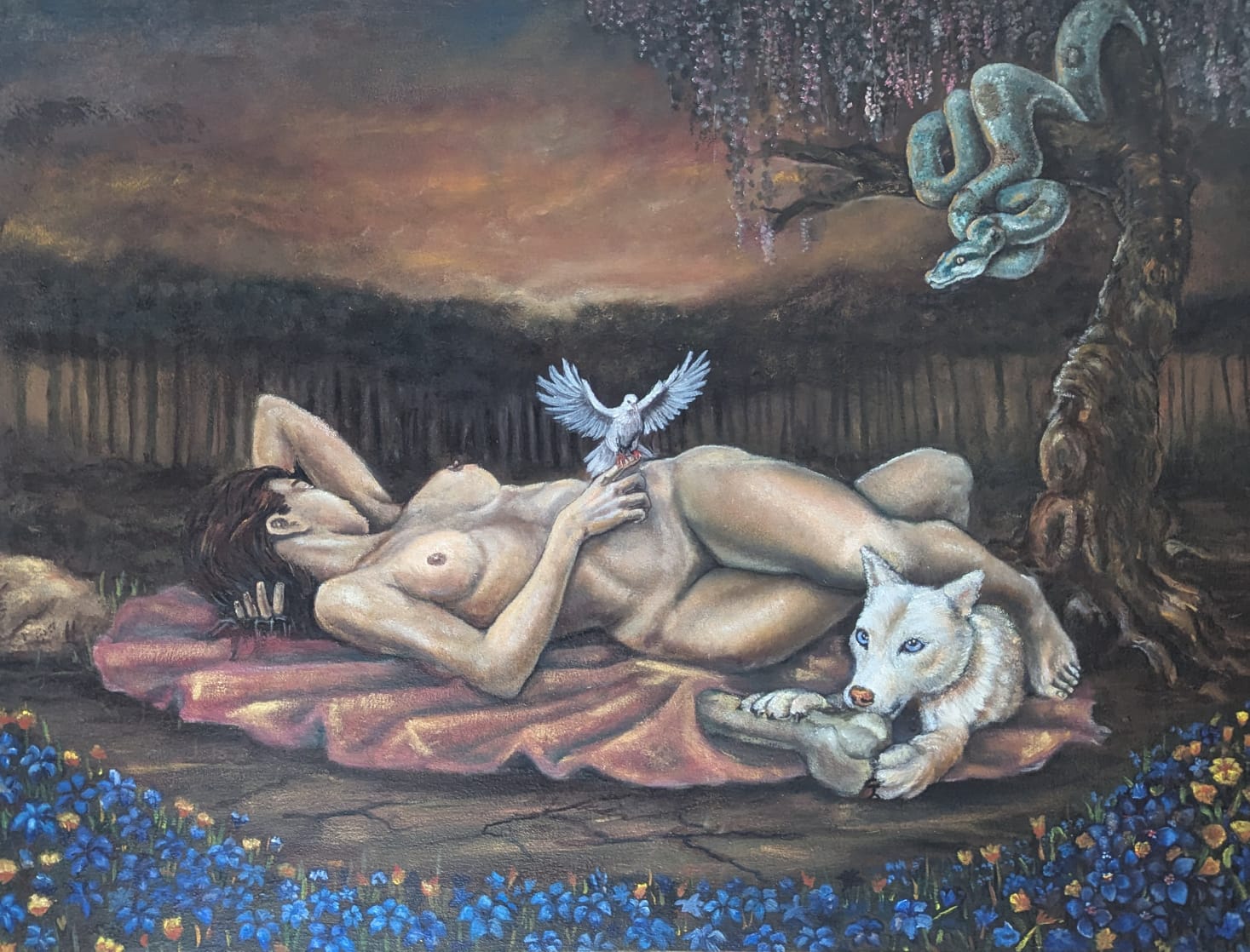 "Como un suspiro entre lo eterno y lo efímero, esta obra nace del diálogo entre la carne y el espíritu. La mujer desnuda -criatura de luz y sombra- descansa sobre el manto bermellón de su propia trascendencia, mientras el oro divino teje destellos en los pliegues de su entrega. La paloma (inocencia), mensajera de lo intangible, posa su vuelo en esa mano que ya no teme sosteniendo lo sagrado. A sus pies, la fidelidad del perro blanco con los últimos vestigios de vergüenza, y en la rama del árbol, la serpiente (astucia), dibuja preguntas con su silbido de sabiduría antigua.