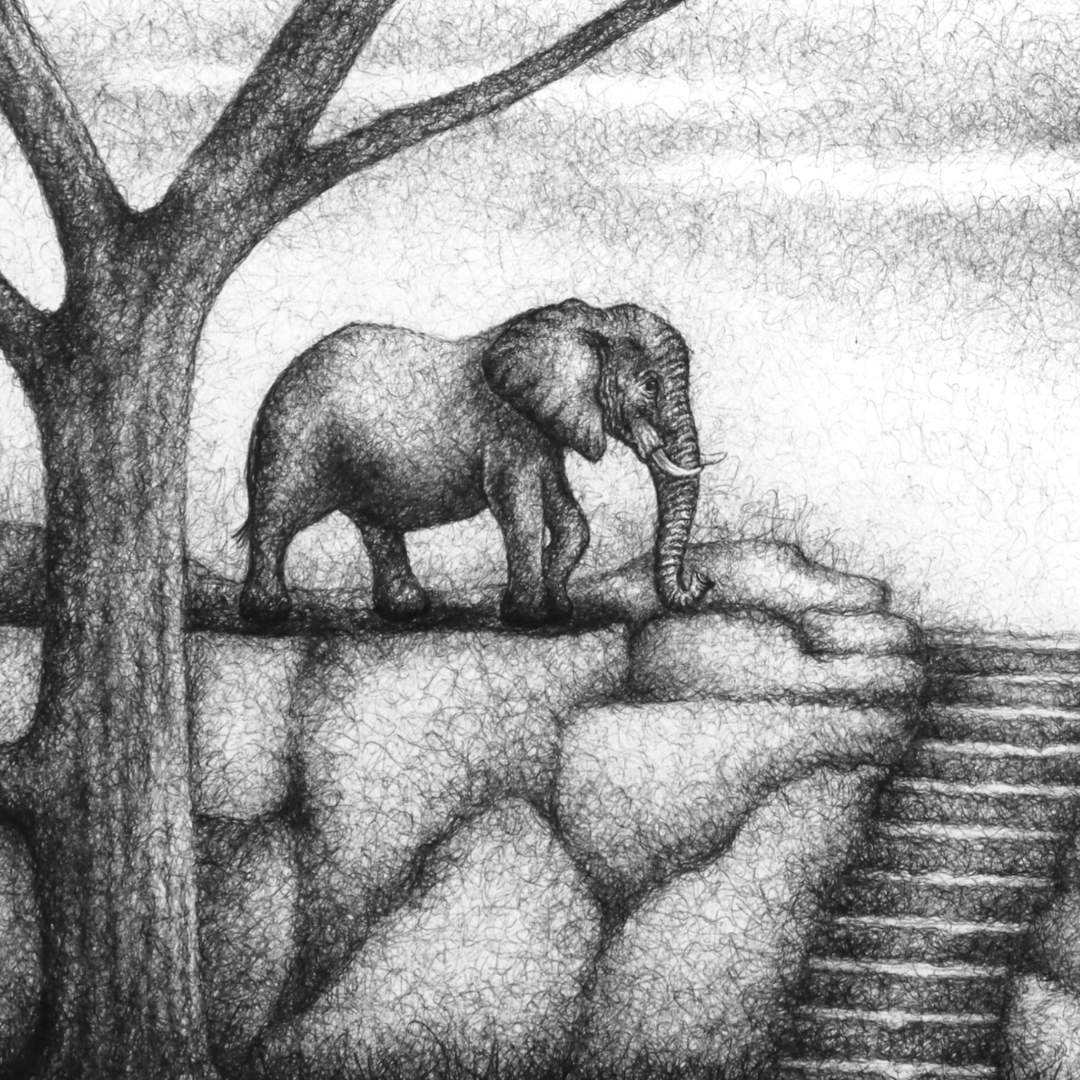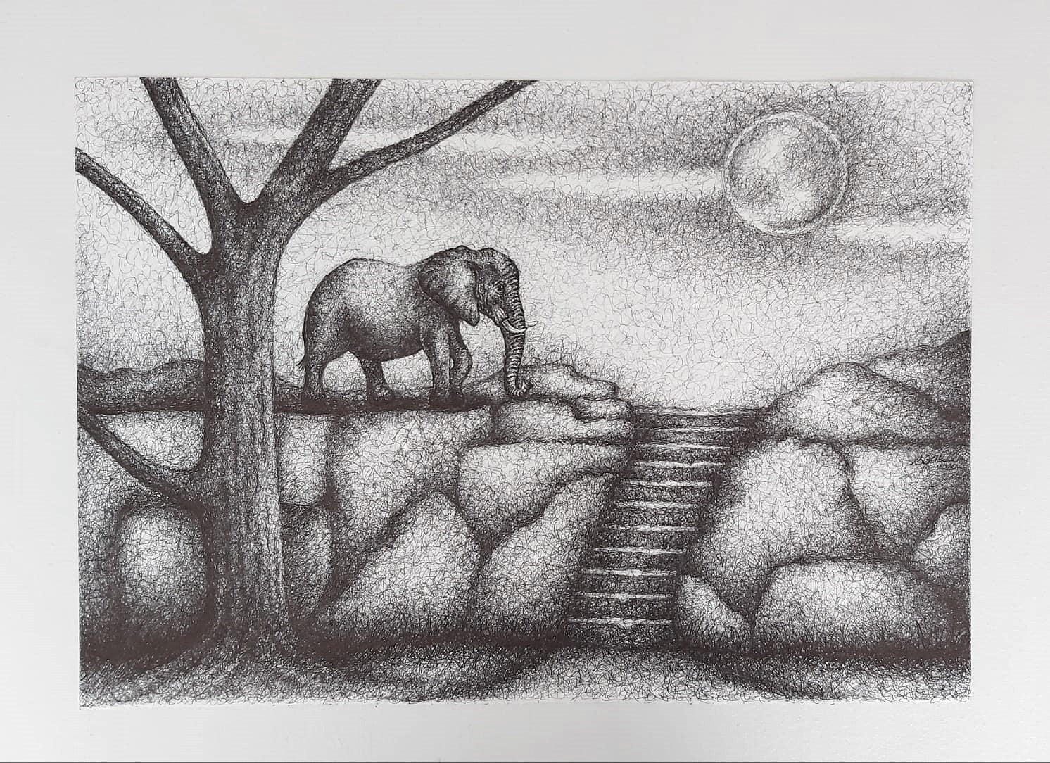 La técnica de la filigrana se realizó con bolígrafo negro sobre papel creando la sensación de las sombras.