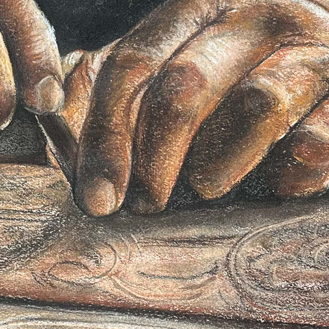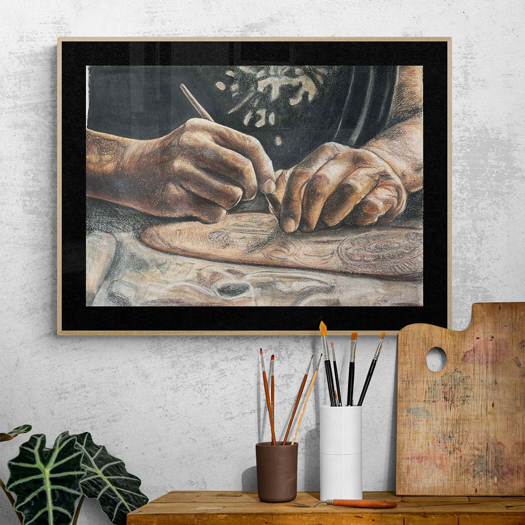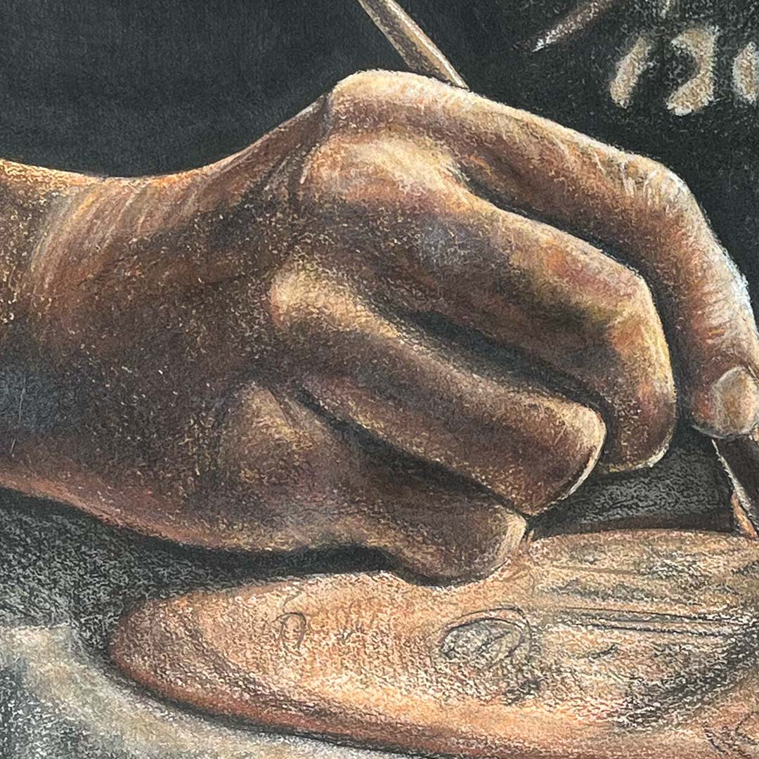 Artesano es un dibujo al pastel que captura la fuerza y dedicación de unas manos en pleno trabajo. Cada trazo refleja el poder y la habilidad del artesano, con detalles cuidadosamente trazados que resaltan la textura y la energía en cada movimiento. La técnica al pastel aporta calidez y profundidad, creando una obra que evoca el esfuerzo y la pasión del trabajo manual. Para quienes aprecian el arte que celebra la labor humana.