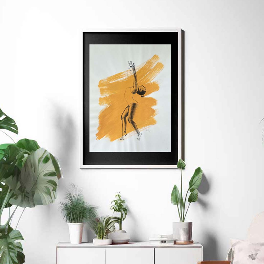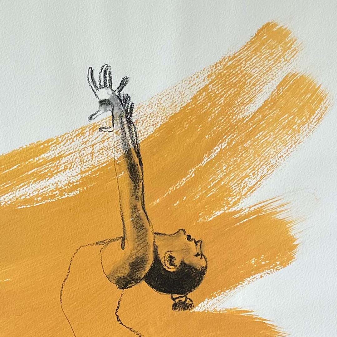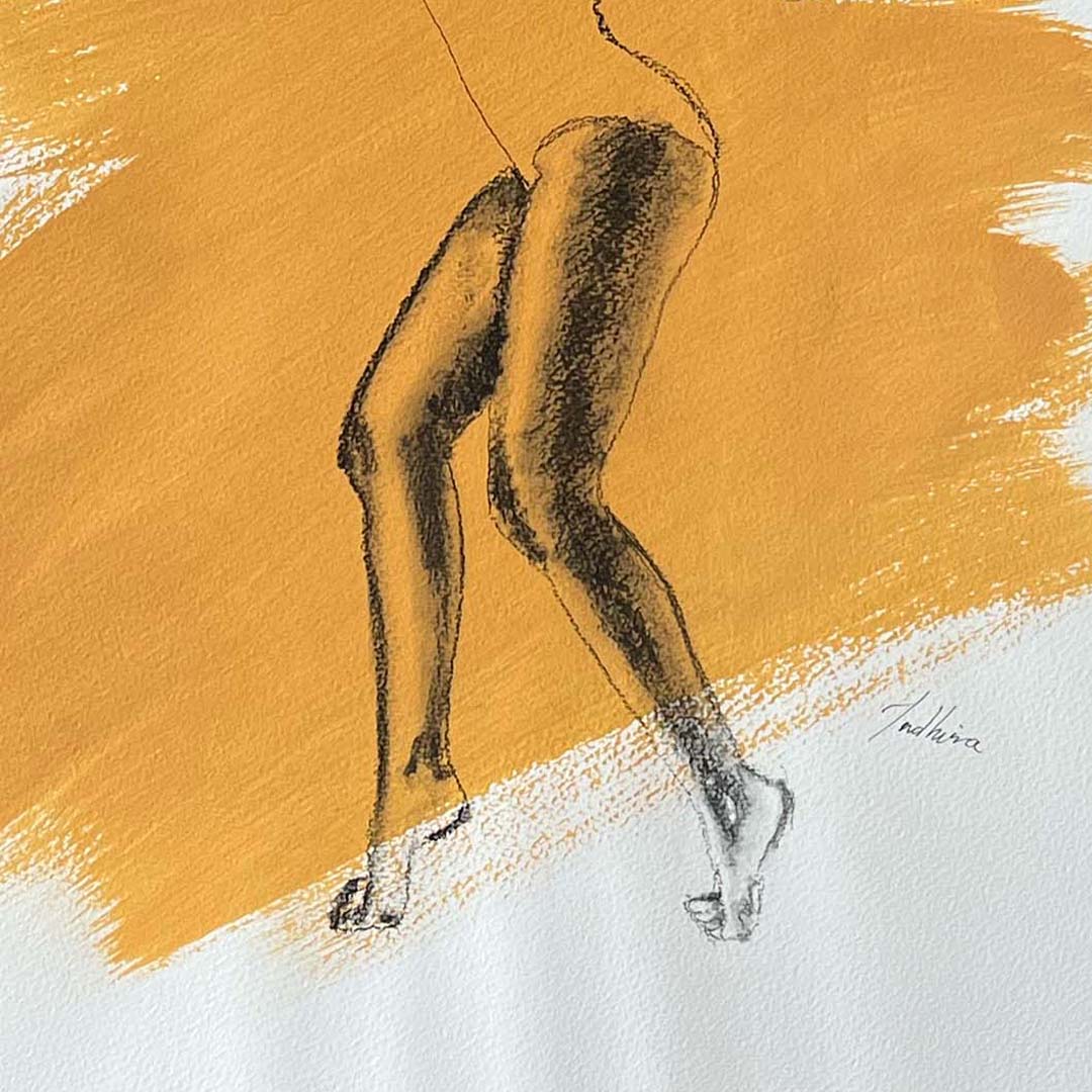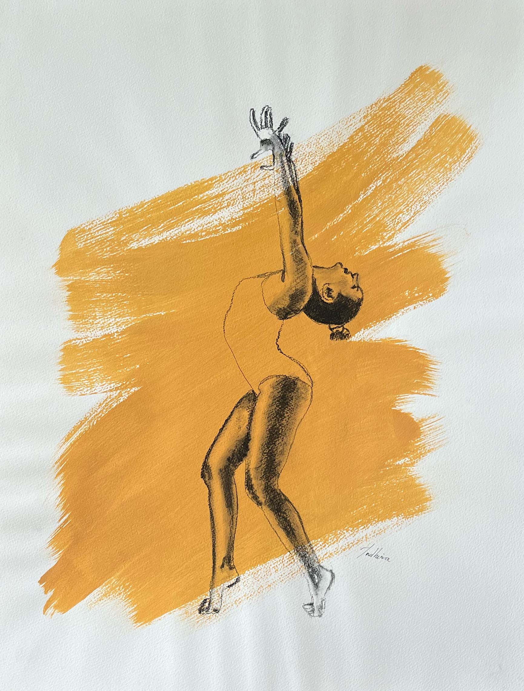 Obra en técnica mixta que combina la elegancia del carboncillo con sutiles toques en color. Este dibujo captura la gracia y fluidez de una bailarina en plena danza, con trazos delicados que resaltan la suavidad de cada gesto. El contraste entre las sombras en carboncillo y los acentos en color crea una pieza vibrante y dinámica, destacando la energía y belleza del cuerpo en movimiento.