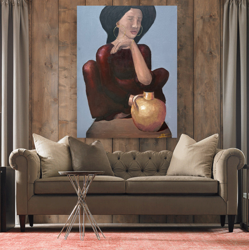 Pintura acrílica de una mujer sentada con una expresión serena y los ojos cerrados. La figura tiene el cabello oscuro, lleva unos aros grandes dorados y un vestido de tonos marrones rojizos. Apoya una mano sobre su rostro y la otra descansa sobre una mesa, donde hay una vasija de color amarillento con reflejos dorados.