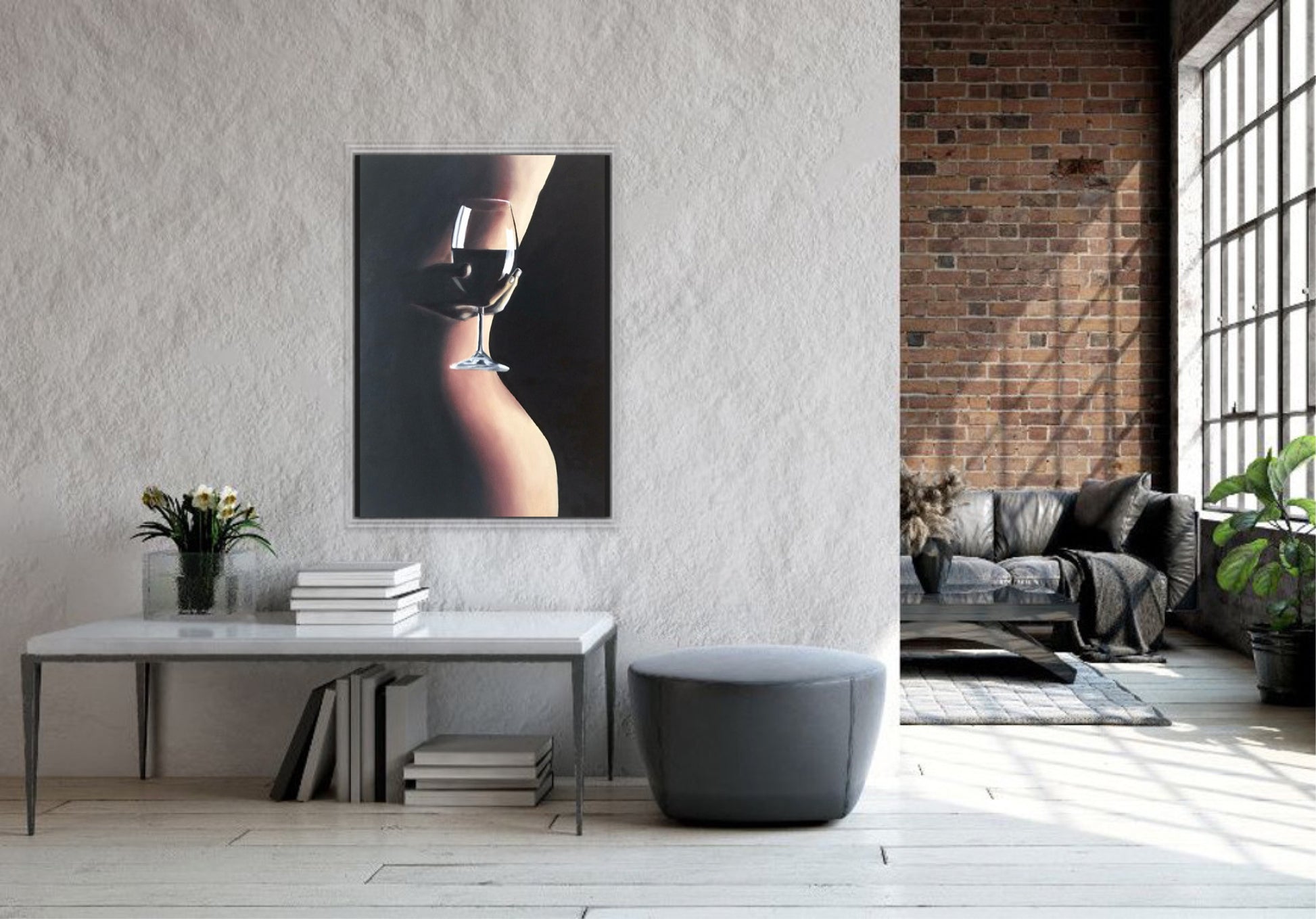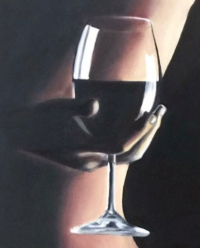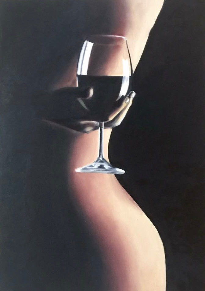 Esta cautivadora pintura al óleo en blanco y negro presenta el torso de una mujer desnuda. Su postura es intrigante: sostiene con gracia una copa de vino tinto en su mano izquierda mientras se recarga en su costado. El brazo derecho cruza sobre su abdomen, y su mano se alza hacia arriba, creando una sensación de misterio y elegancia. La ausencia de su cabeza, que solo existe en nuestra imaginación, añade un toque de enigma. Esta obra es perfecta para quienes buscan una pieza única y evocadora para su colección.