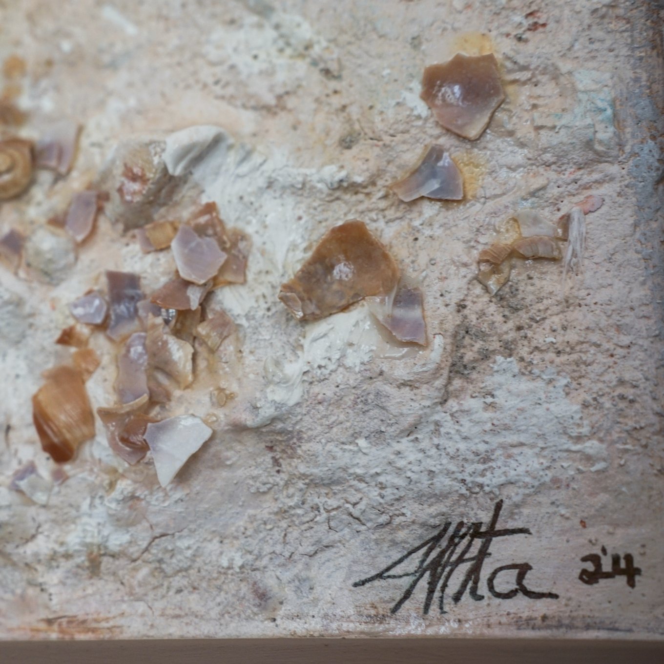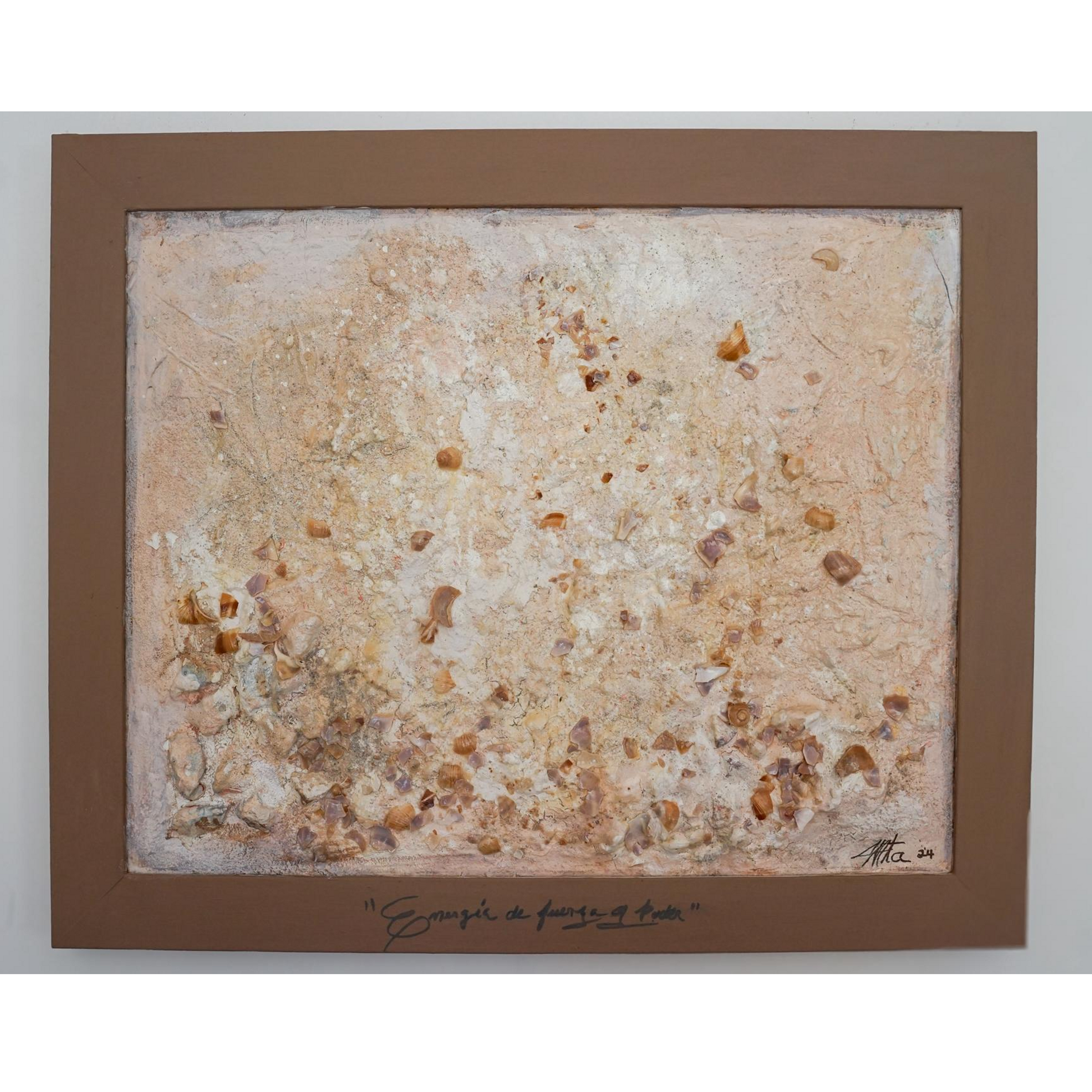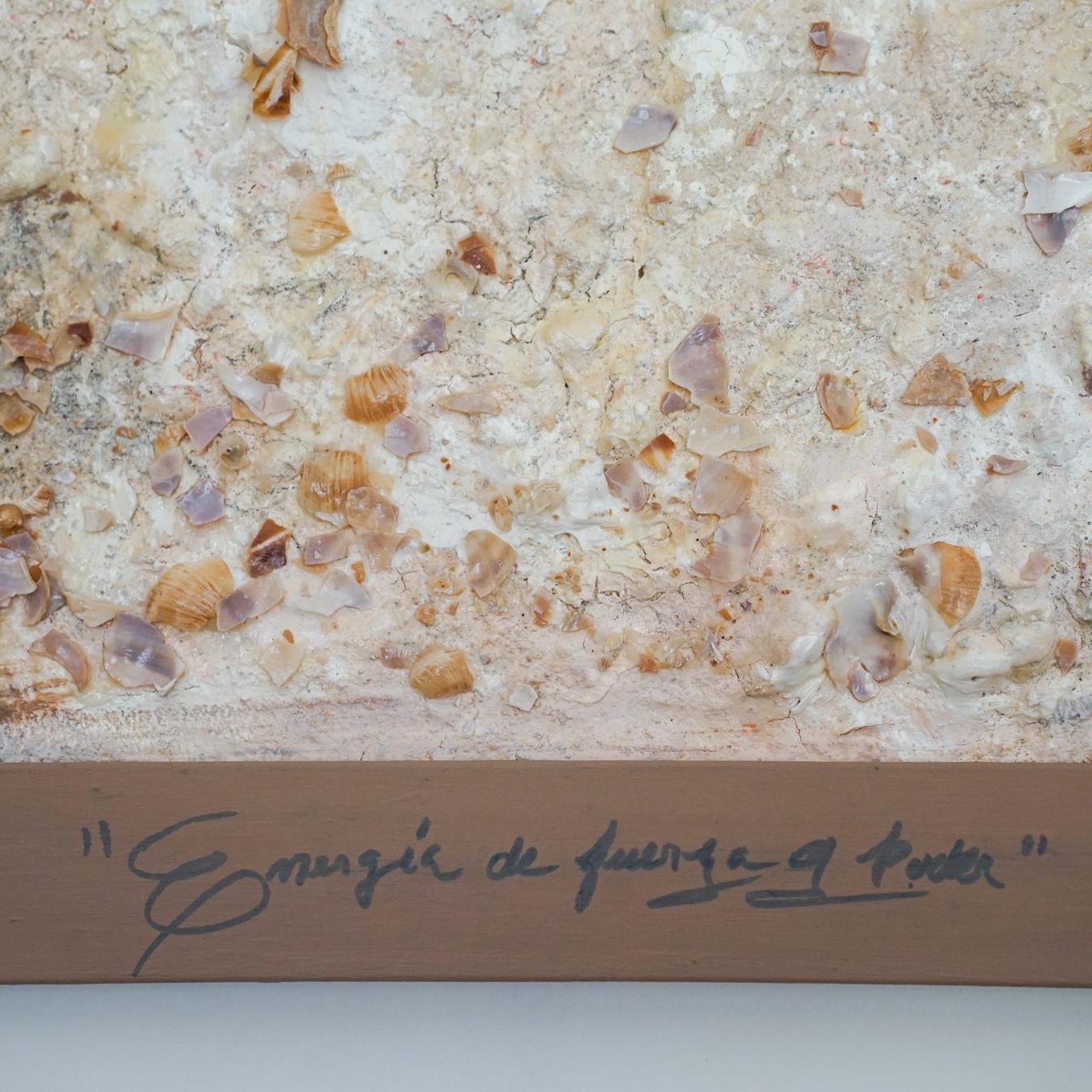 Energía de fuerza y poder es moderna, decorativa; catalogada escultura en lienzo, fósiles de piedra en lienzo, o sobre madera, con una energía fuerte, estilo particular de Mayita.