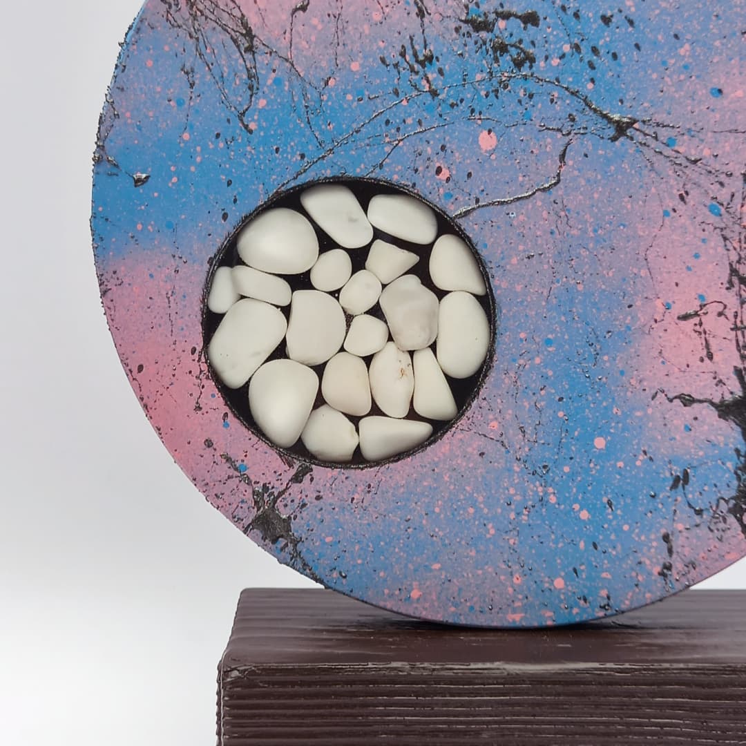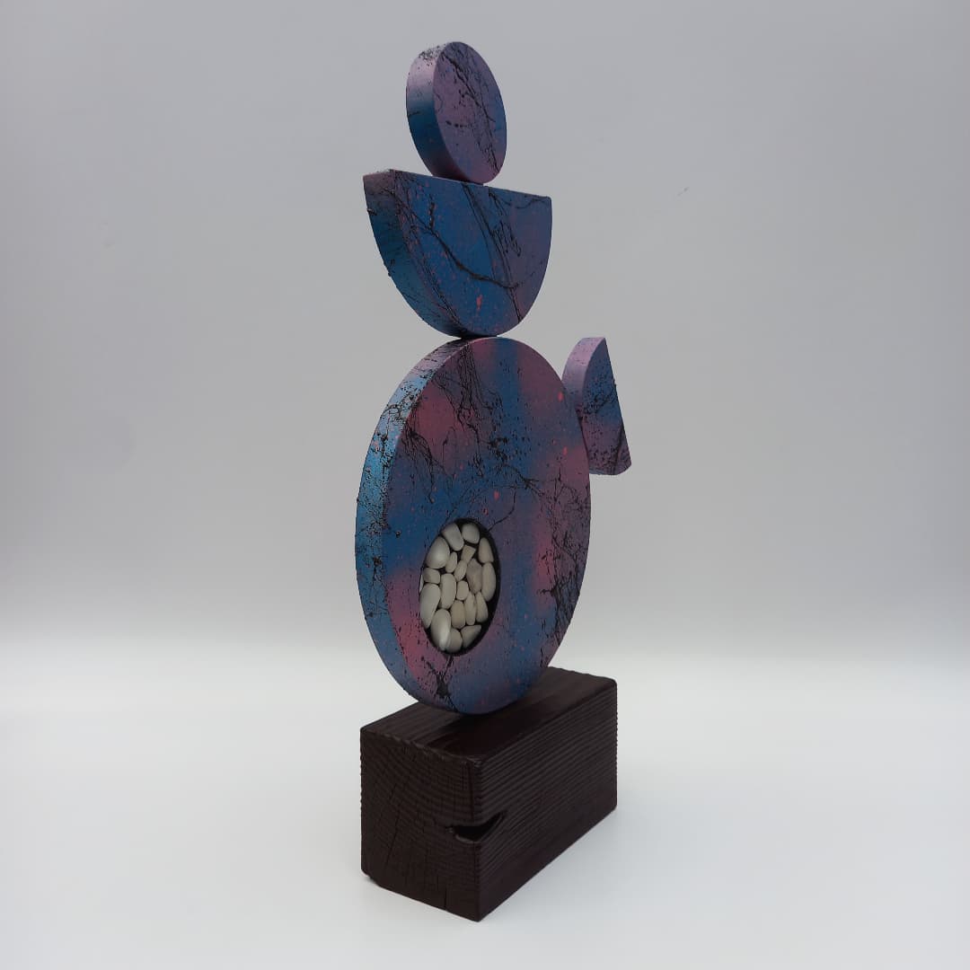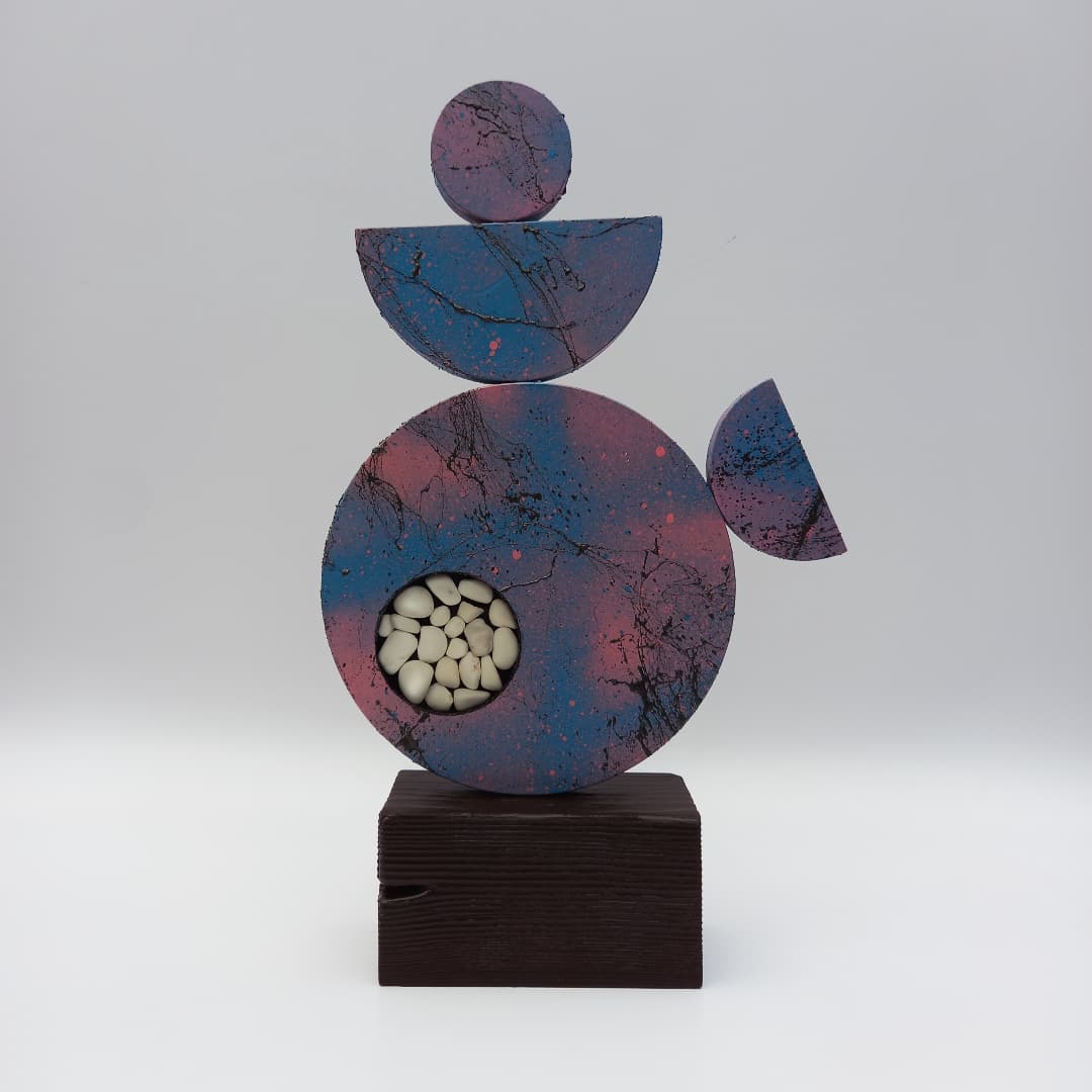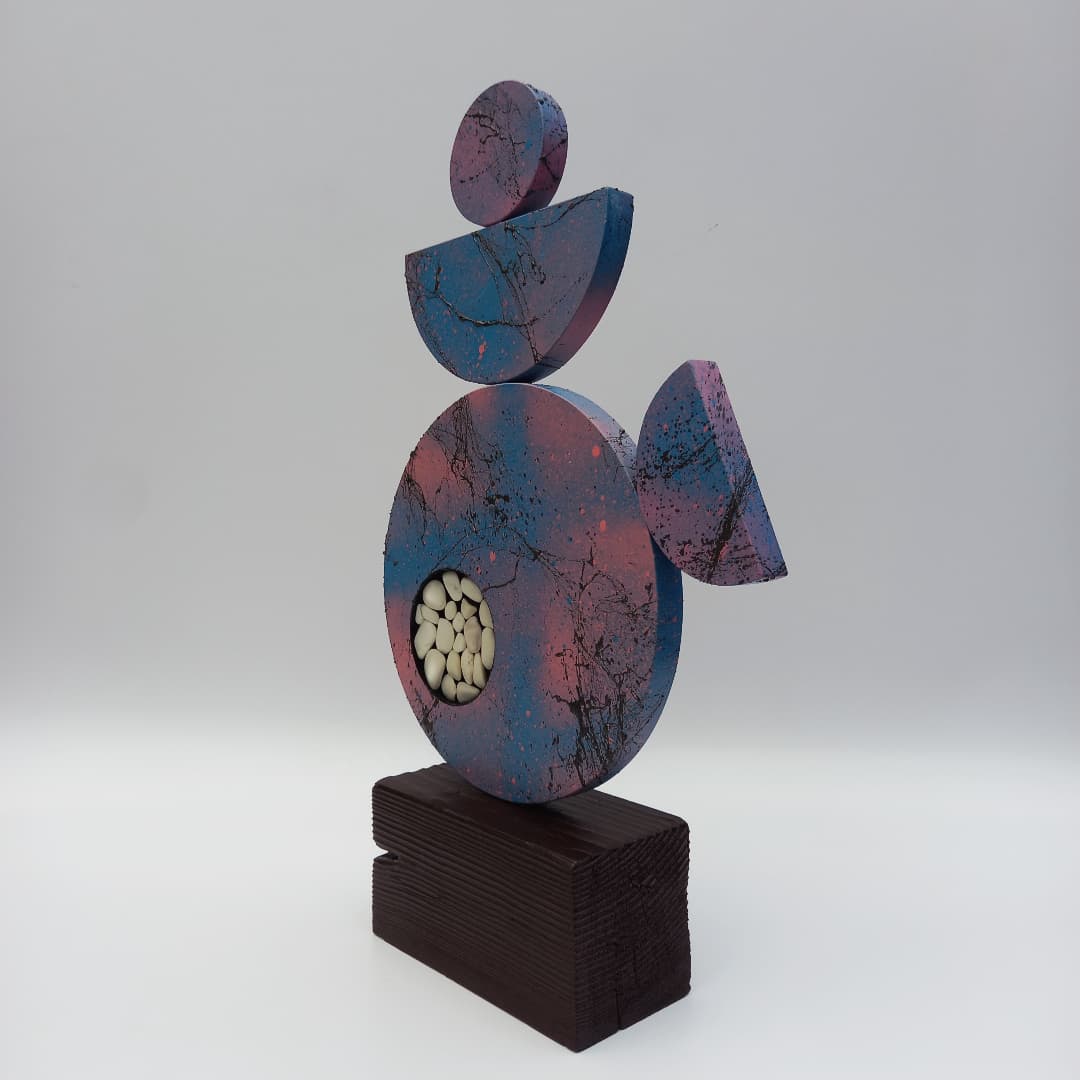 "Ensayo 2" es una escultura geométrica de madera, intervenida con aerosol y un encapsulado de piedras de río. Su composición sugiere un equilibrio en constante cambio, donde lo estructural y lo orgánico coexisten dentro de un sistema de formas y texturas.