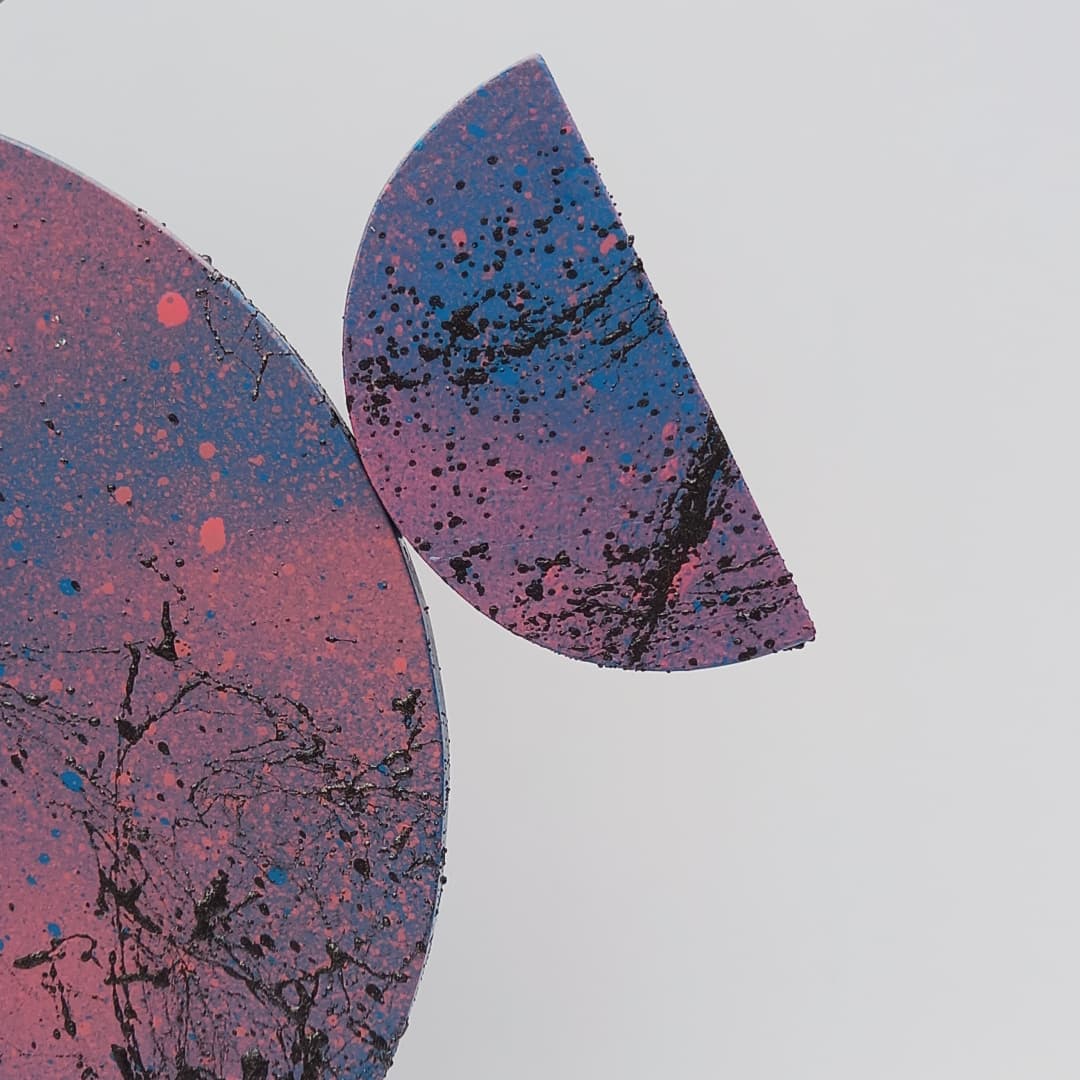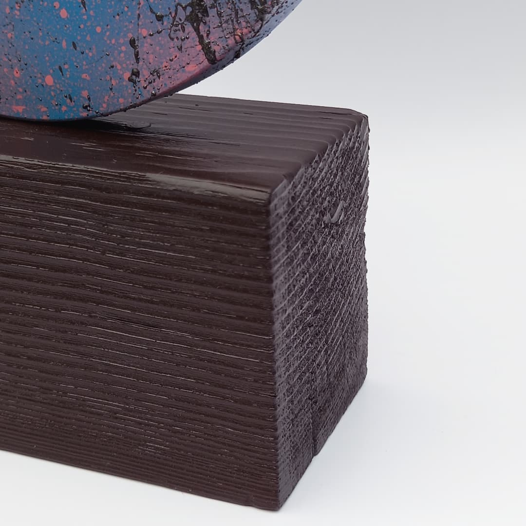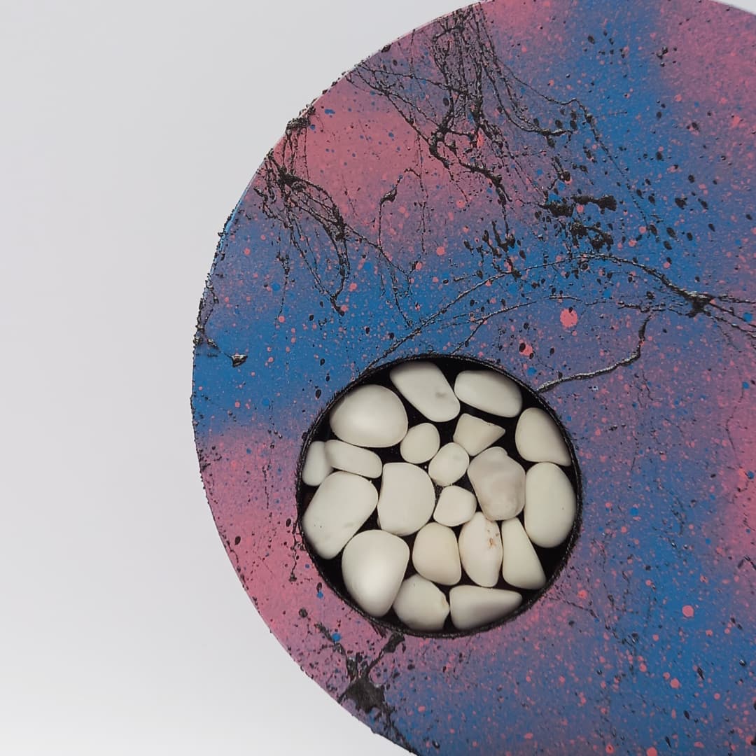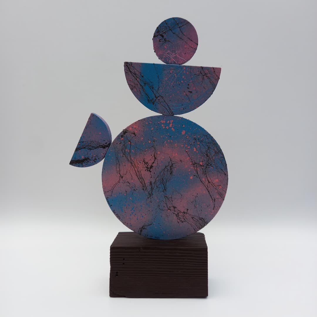 "Ensayo 2" es una escultura geométrica de madera, intervenida con aerosol y un encapsulado de piedras de río. Su composición sugiere un equilibrio en constante cambio, donde lo estructural y lo orgánico coexisten dentro de un sistema de formas y texturas.