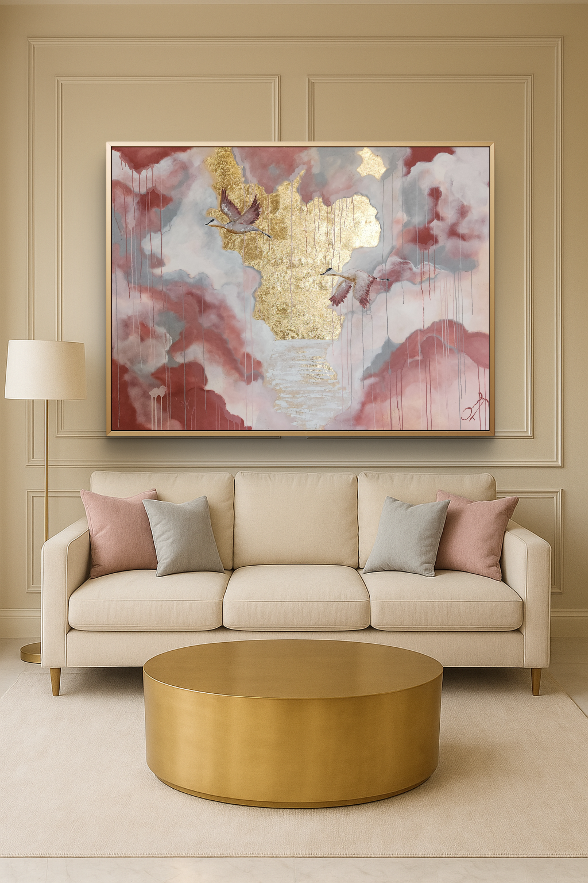 La obra representa un atardecer envuelto en nubes teñidas de tonos cálidos y suaves, atravesadas por destellos dorados que sugieren la luz del sol ocultándose en el horizonte. En medio de este paisaje etéreo, dos aves vuelan en armonía, simbolizando la libertad, la esperanza y el tránsito hacia nuevos horizontes.