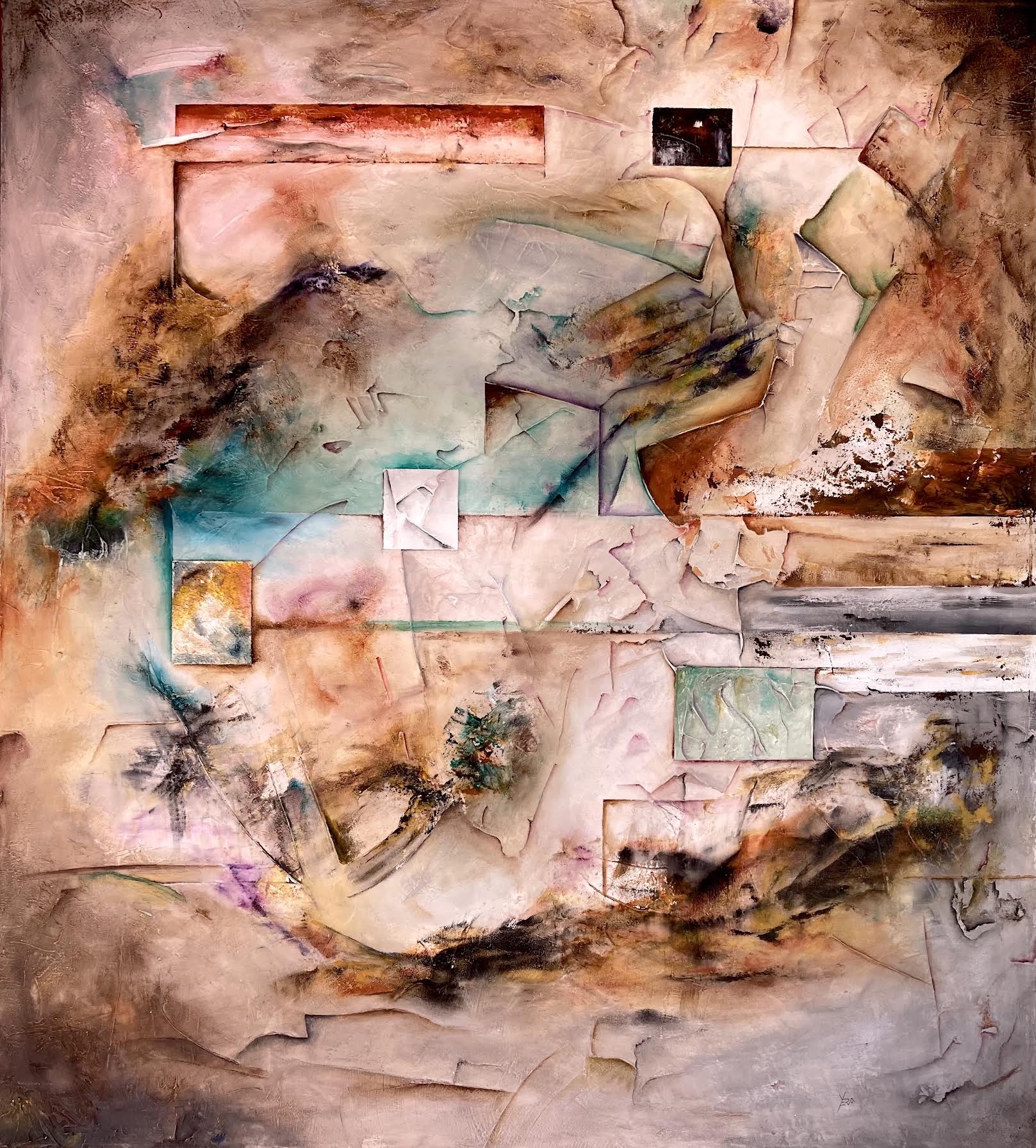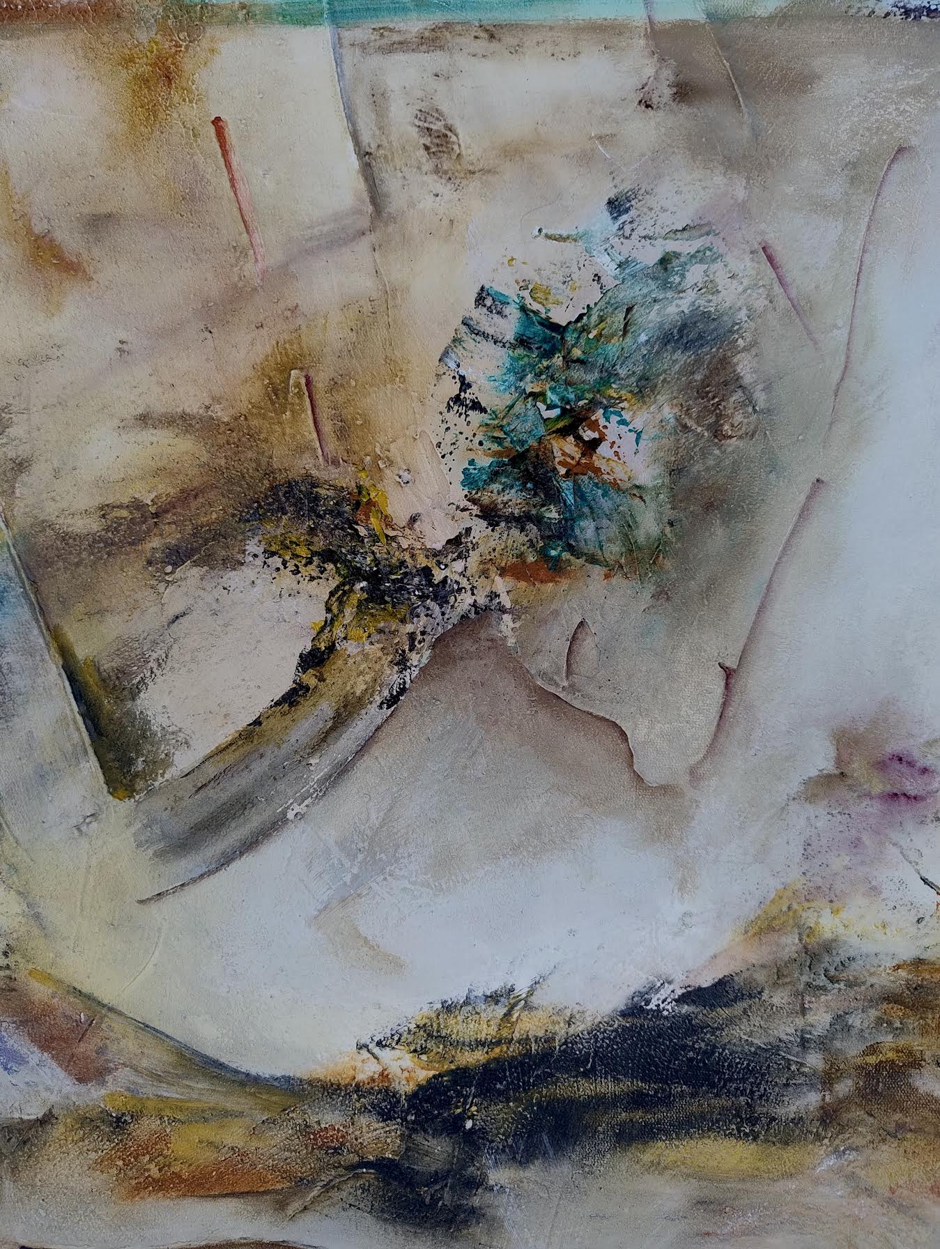 Esta obra se abre como un campo de batalla entre elementos contrapuestos: la combustión y la tierra húmeda, la luminosidadincandescente y los tonos ocres apagados. La yuxtaposición de planos, en ocasiones dislocados, genera una sensación de tensión, como si la pintura estuviera en un estado de inestabilidad constante, a punto de derrumbarse o de emerger con una fuerza renovada.
