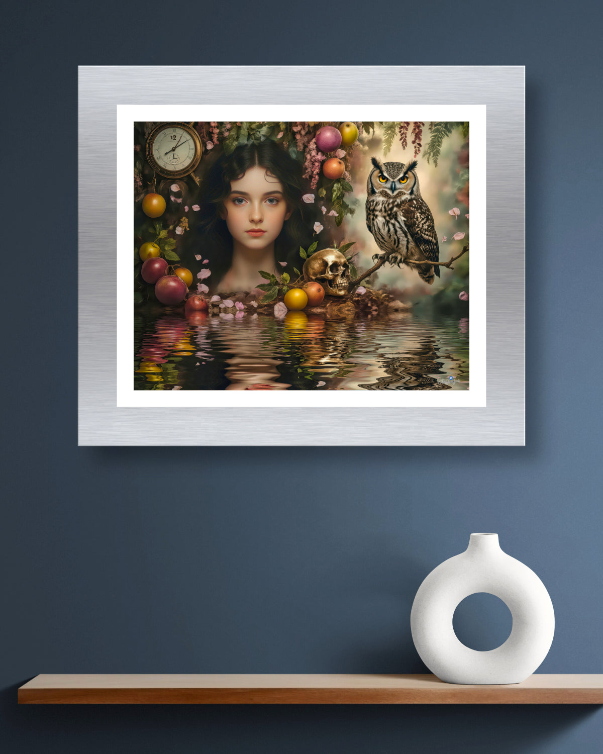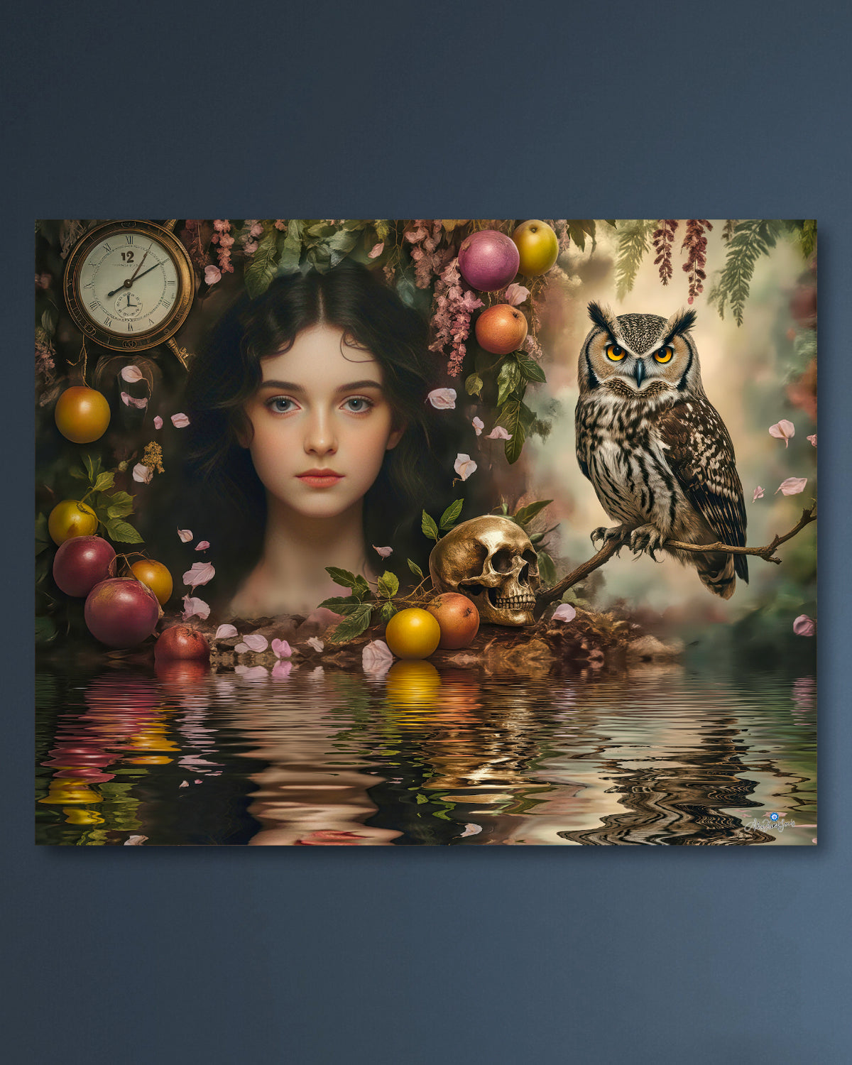 El reloj representa la dimensión lineal del tiempo; el cráneo, la inevitabilidad de la transformación; el búho, la sabiduría que observa más allá de lo visible; los frutos y pétalos, la vida en constante renacimiento.