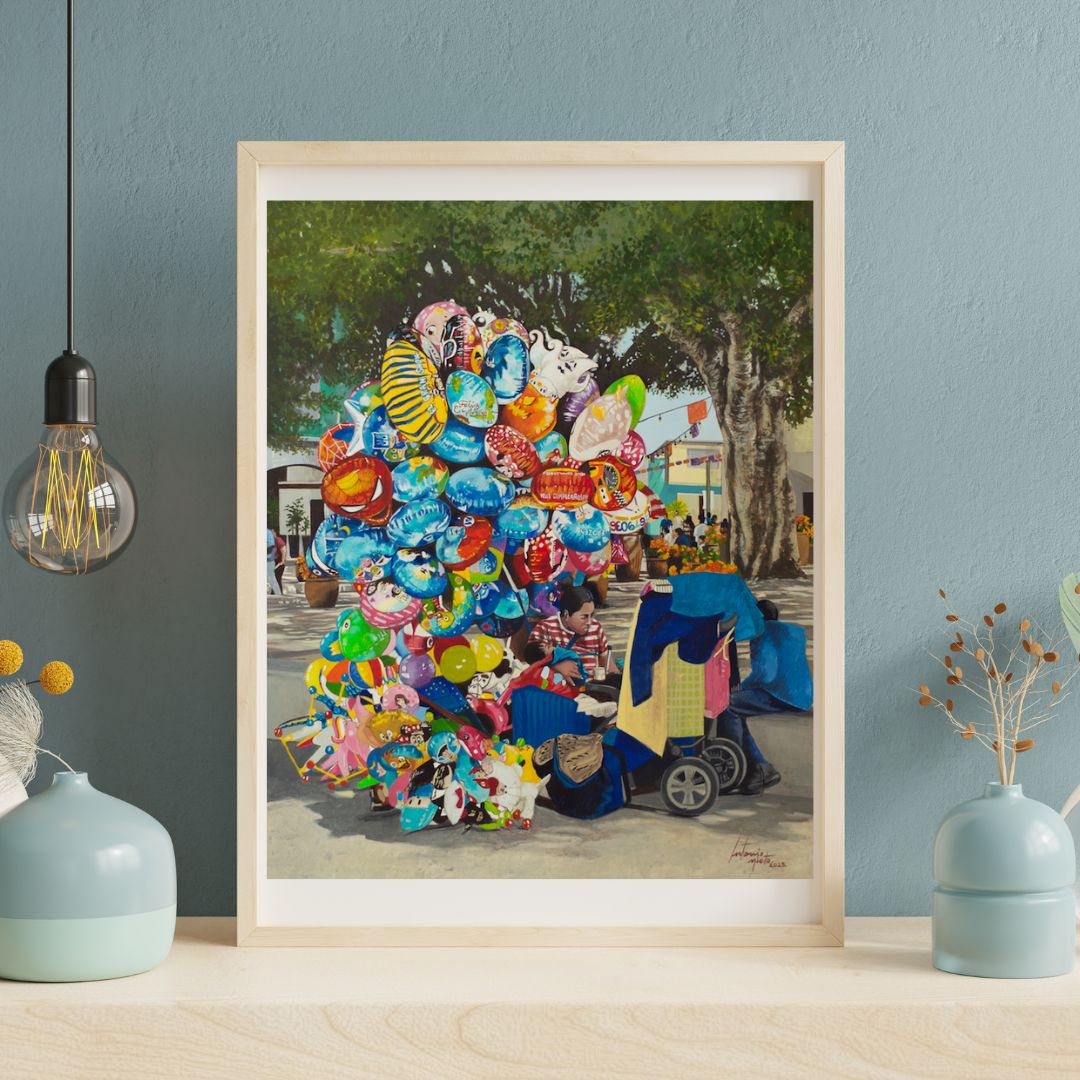 Una vibrante escena urbana donde el color, el movimiento y la emoción se entrelazan en una composición de gran fuerza visual. El contraste entre la explosión cromática de los globos y la vida cotidiana del entorno dota a la obra de un carácter único, lleno de energía y narrativa.