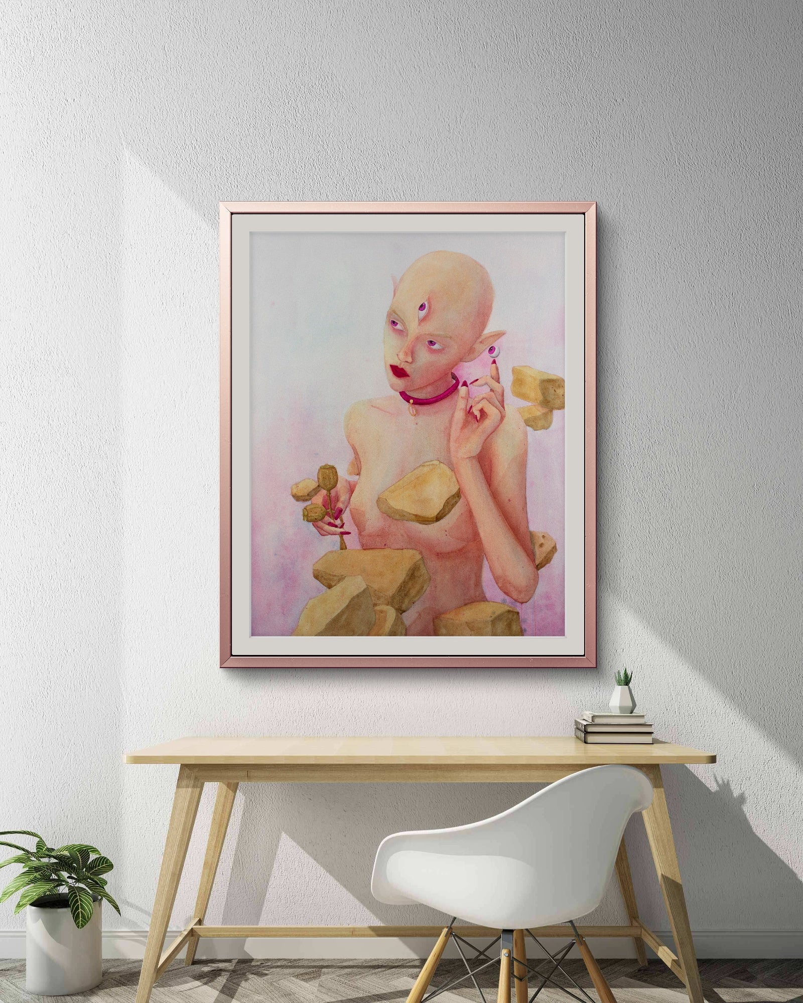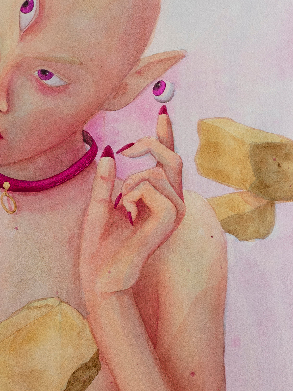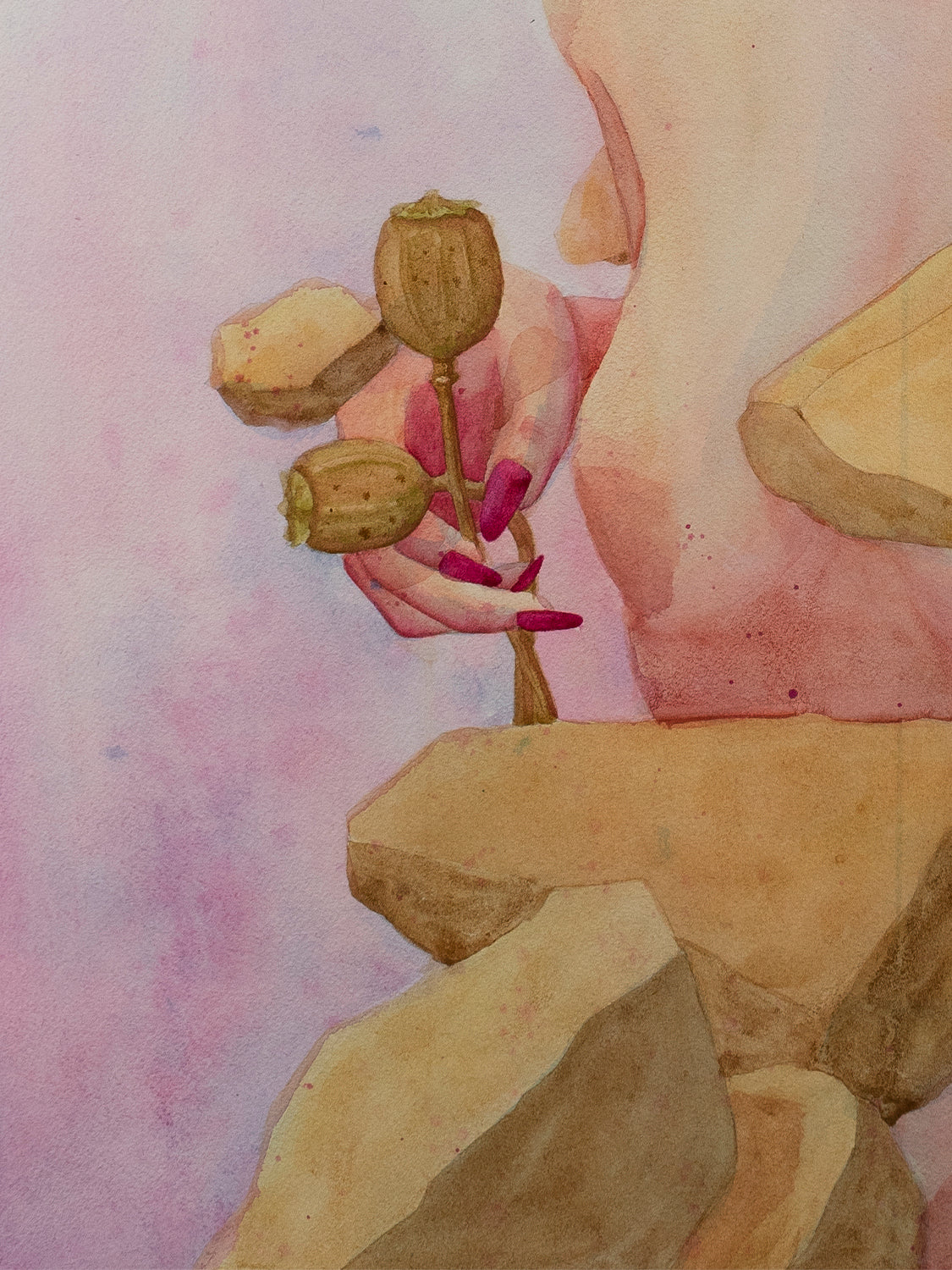 La primera pintura de la serie "Entre Hadas y Amapolas", donde una misma criatura feérica, marcada por la presencia de un tercer ojo, atraviesa distintas fases de transformación. En esta obra, la figura del hada aparece con piel blanca y tonos suaves rosados. En su mano derecha sostiene un par de plantas de amapola, símbolo de sueño, olvido y veneno. Su mano izquierda señala un ojo flotante suspendido frente a ella, como si intentara revelarlo o invocarlo.