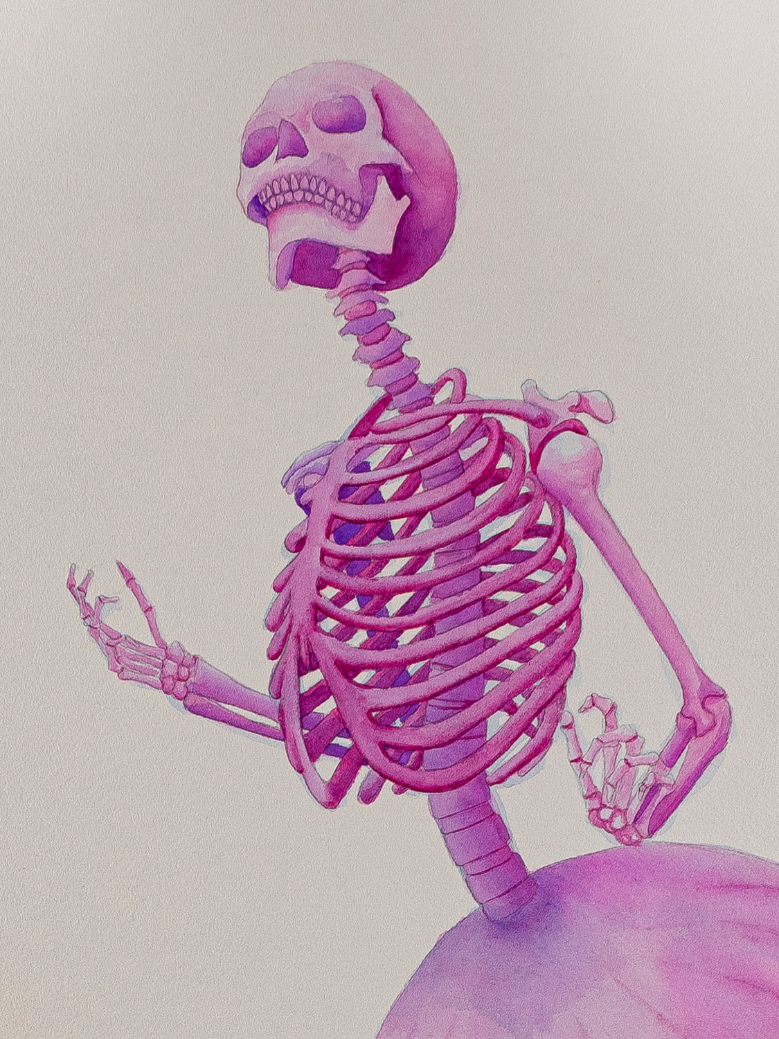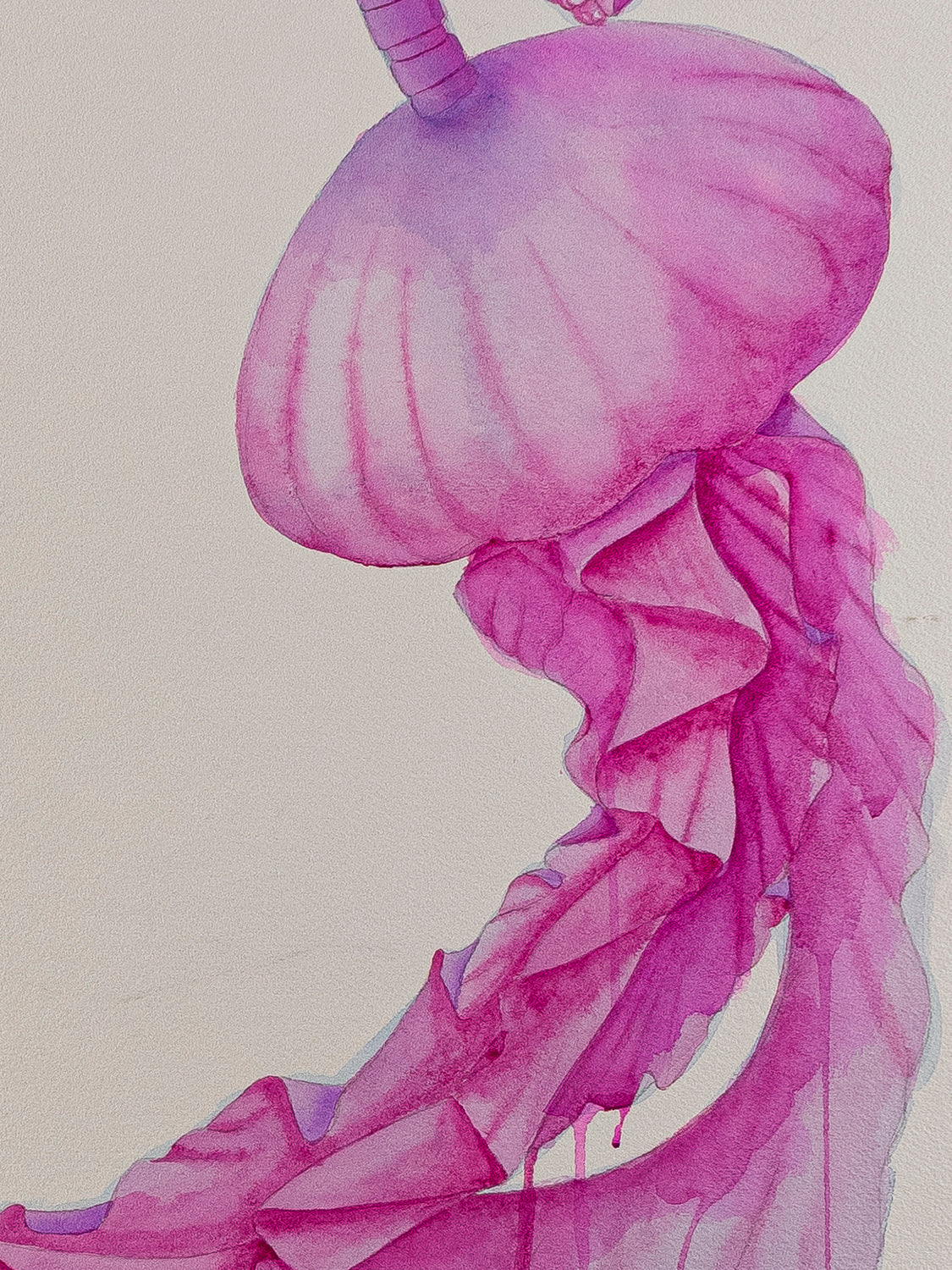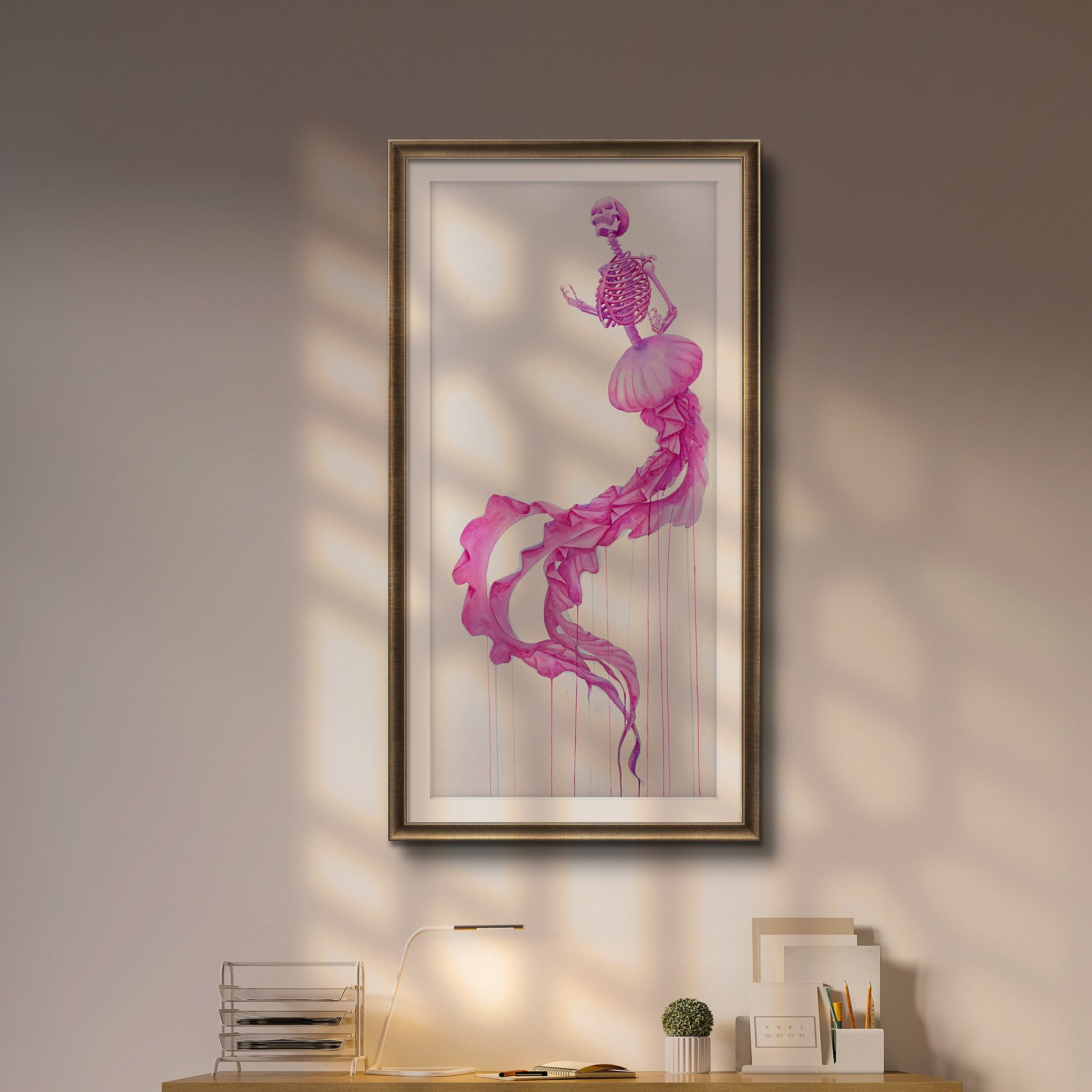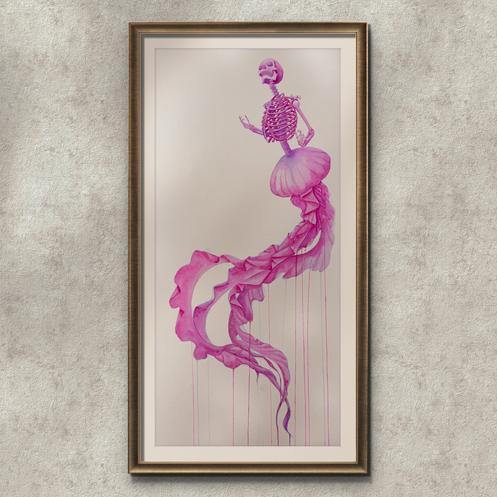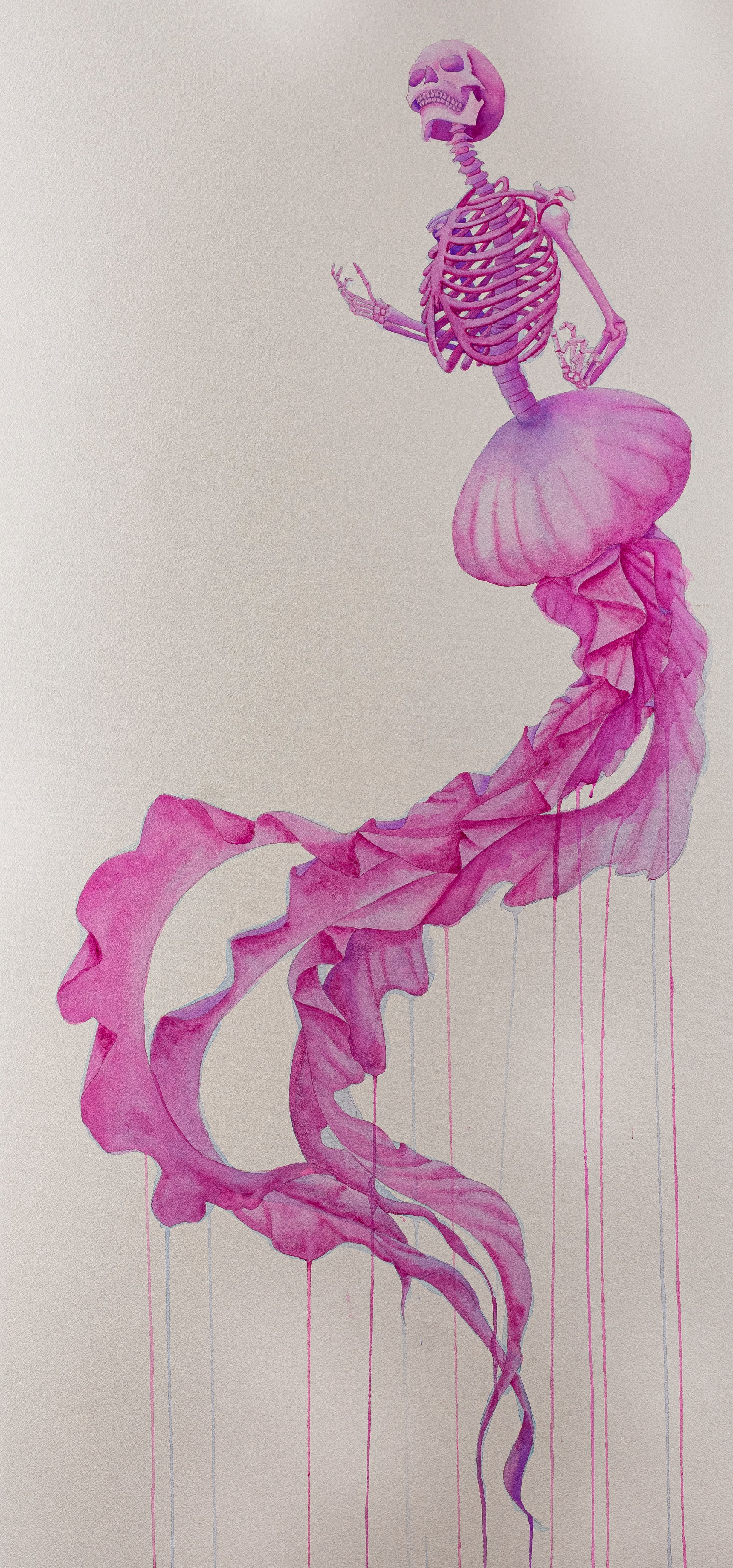 “Entre sombras y recuerdos” es una serie compuesta por 8 acuarelas en gran formato. A través de un ser mitad medusa y mitad esqueleto humano, exploro la fragilidad del alma, el susurro eterno de la muerte y los vestigios invisibles que el tiempo no logra borrar.
