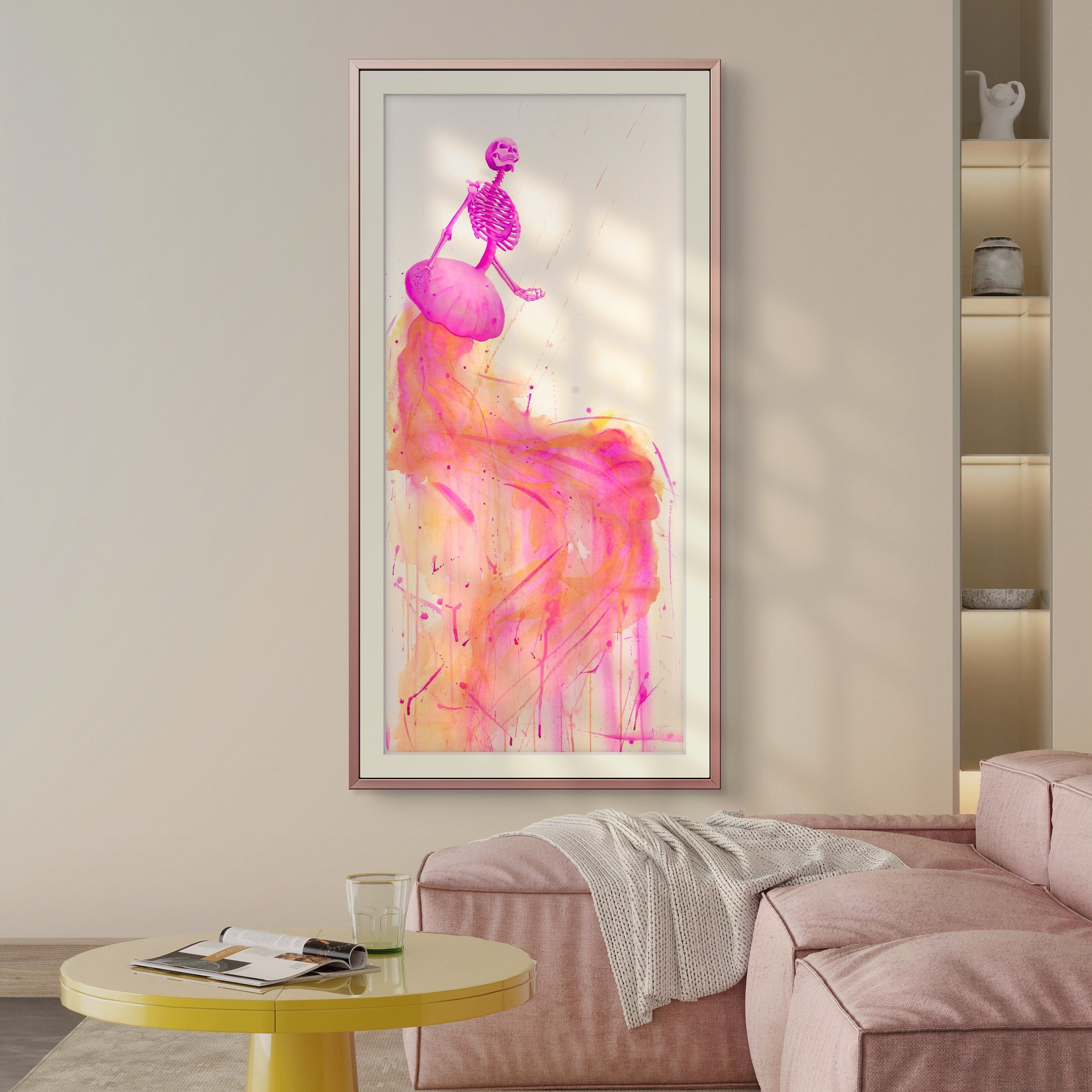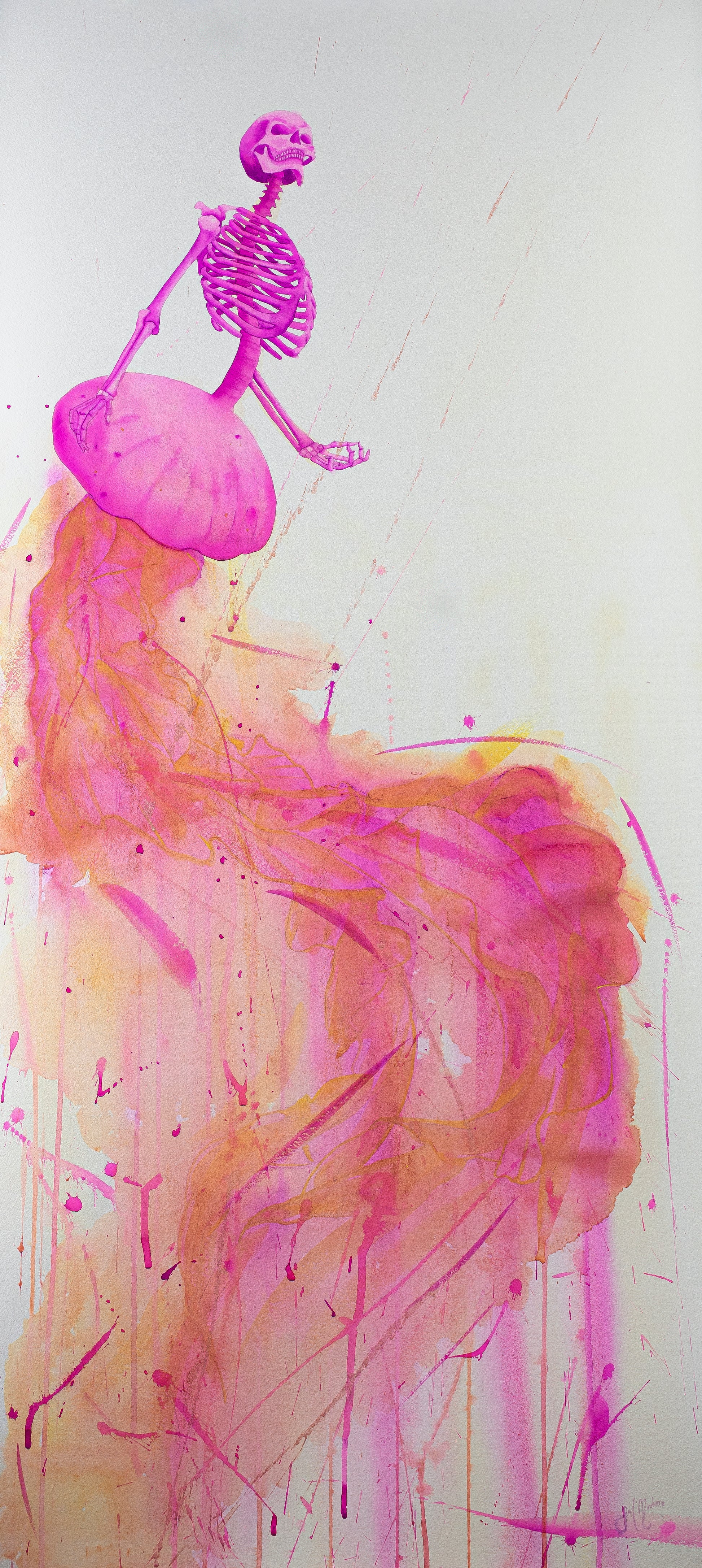 “Entre sombras y recuerdos” es una serie compuesta por 8 acuarelas en gran formato. A través de un ser mitad medusa y mitad esqueleto humano, exploro la fragilidad del alma, el susurro eterno de la muerte y los vestigios invisibles que el tiempo no logra borrar.