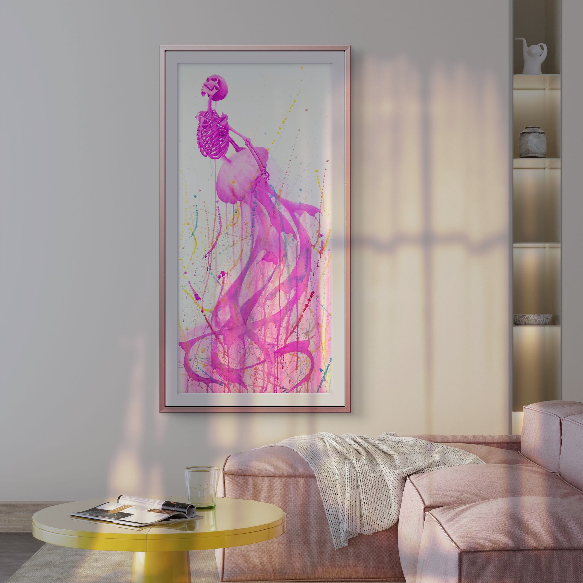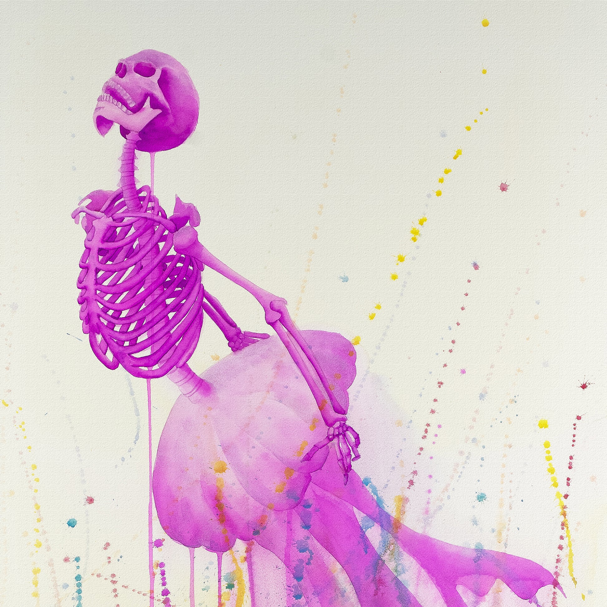 “Entre sombras y recuerdos” es una serie compuesta por 8 acuarelas en gran formato. A través de un ser mitad medusa y mitad esqueleto humano, exploro la fragilidad del alma, el susurro eterno de la muerte y los vestigios invisibles que el tiempo no logra borrar.