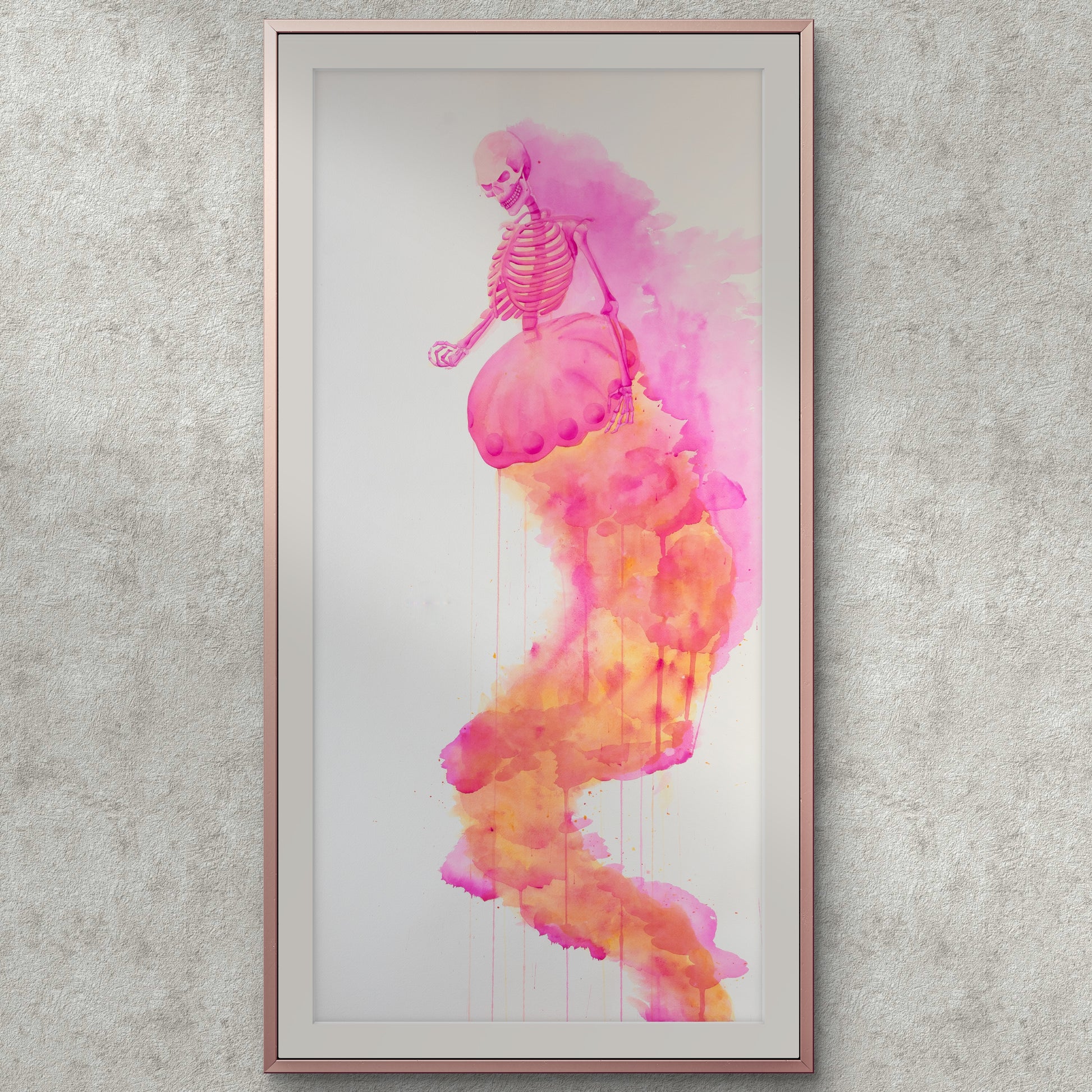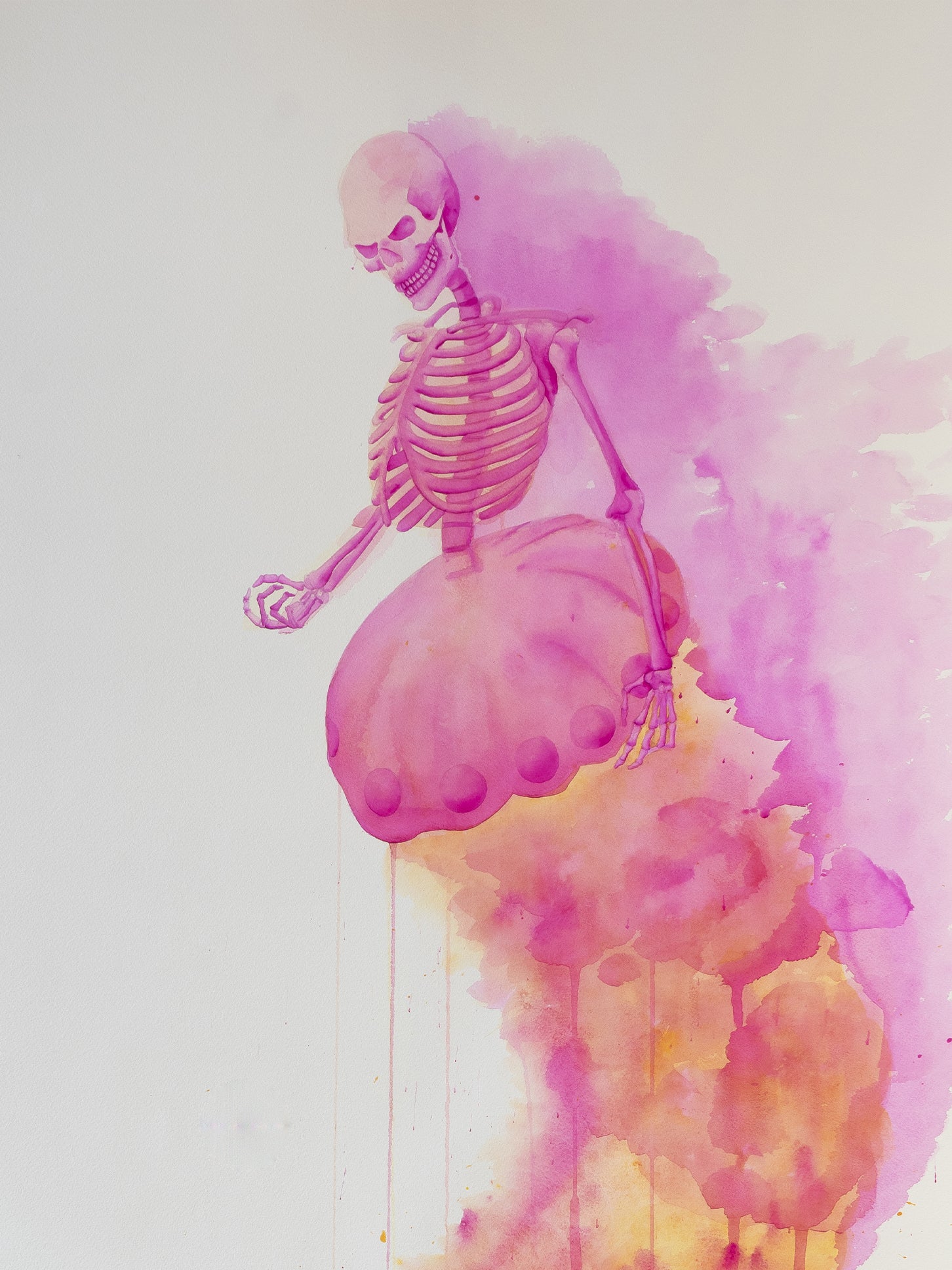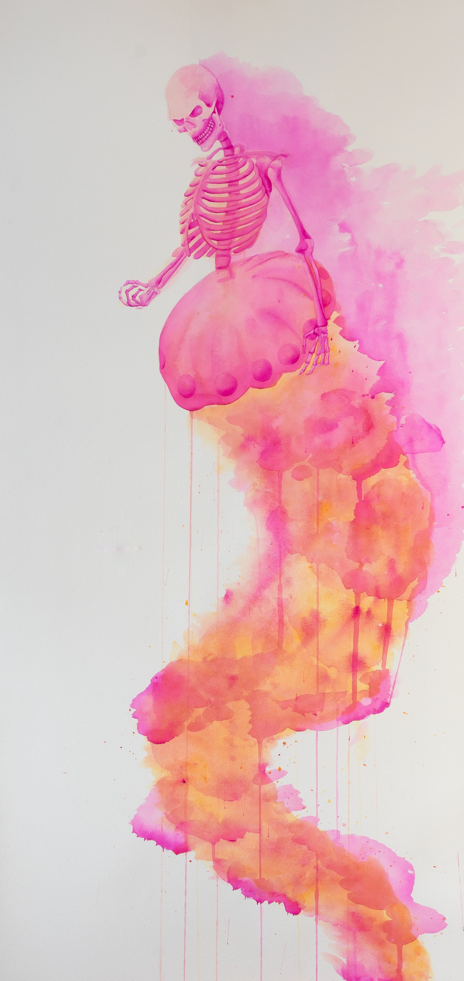Entre sombras y recuerdos es una serie compuesta por ocho acuarelas en gran formato. A través de un ser híbrido: mitad medusa, mitad esqueleto humano. La obra explora la fragilidad del cuerpo, la memoria como residuo y la presencia silenciosa del tiempo. Las figuras no narran un acontecimiento específico, sino que habitan un estado: un espacio suspendido entre lo vivo y lo que ya se transforma.