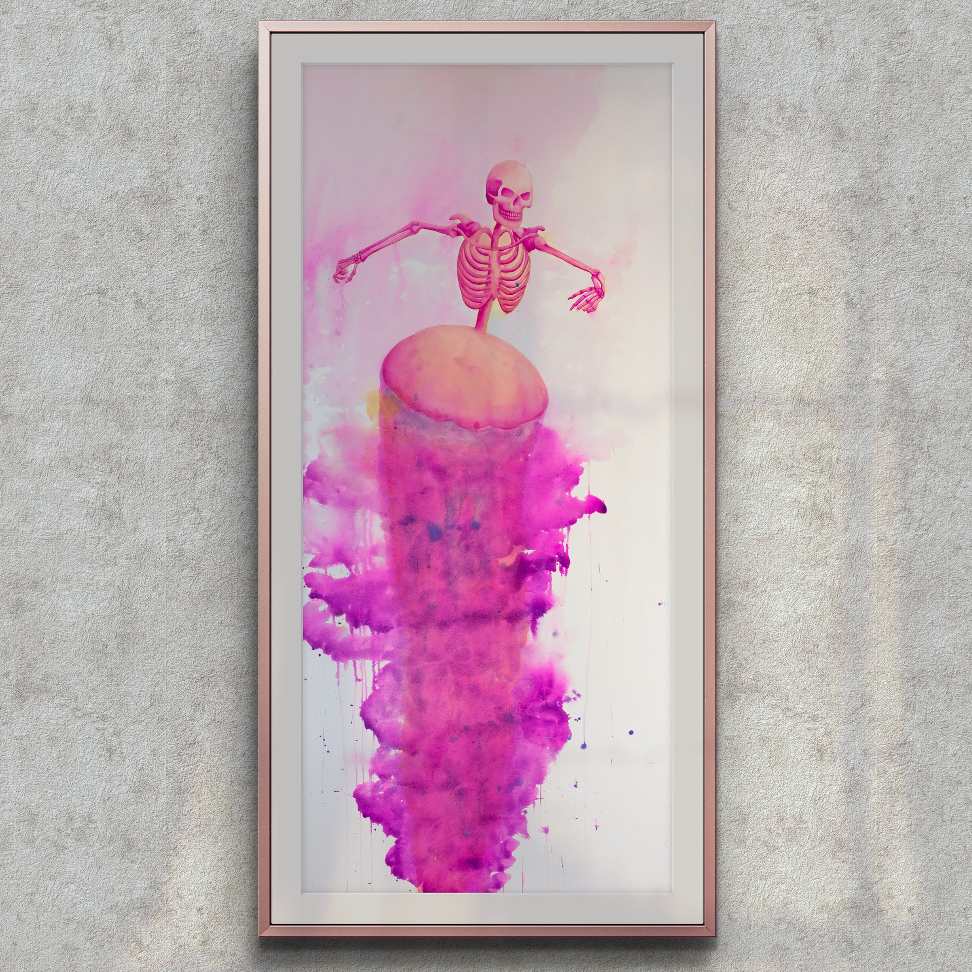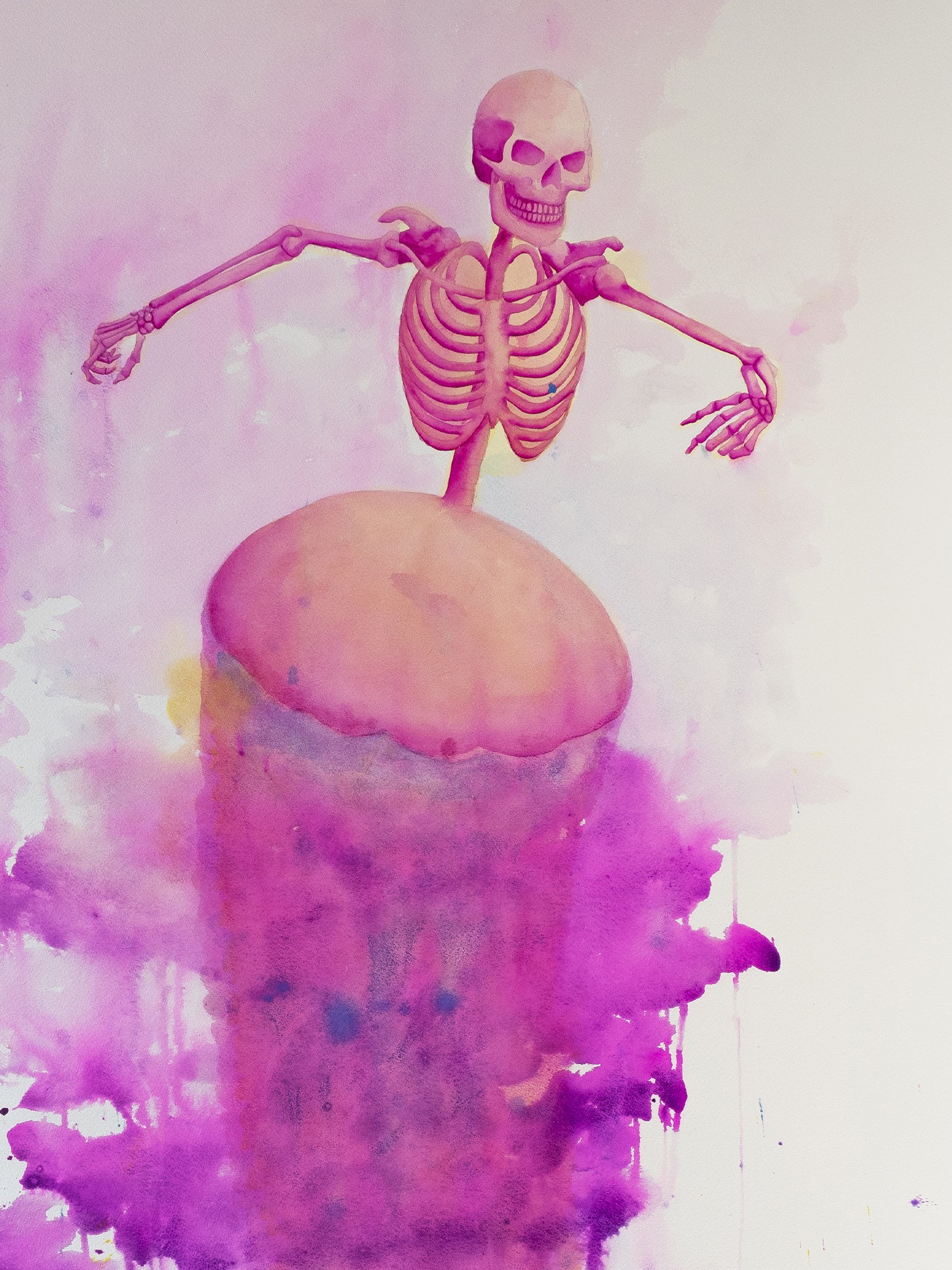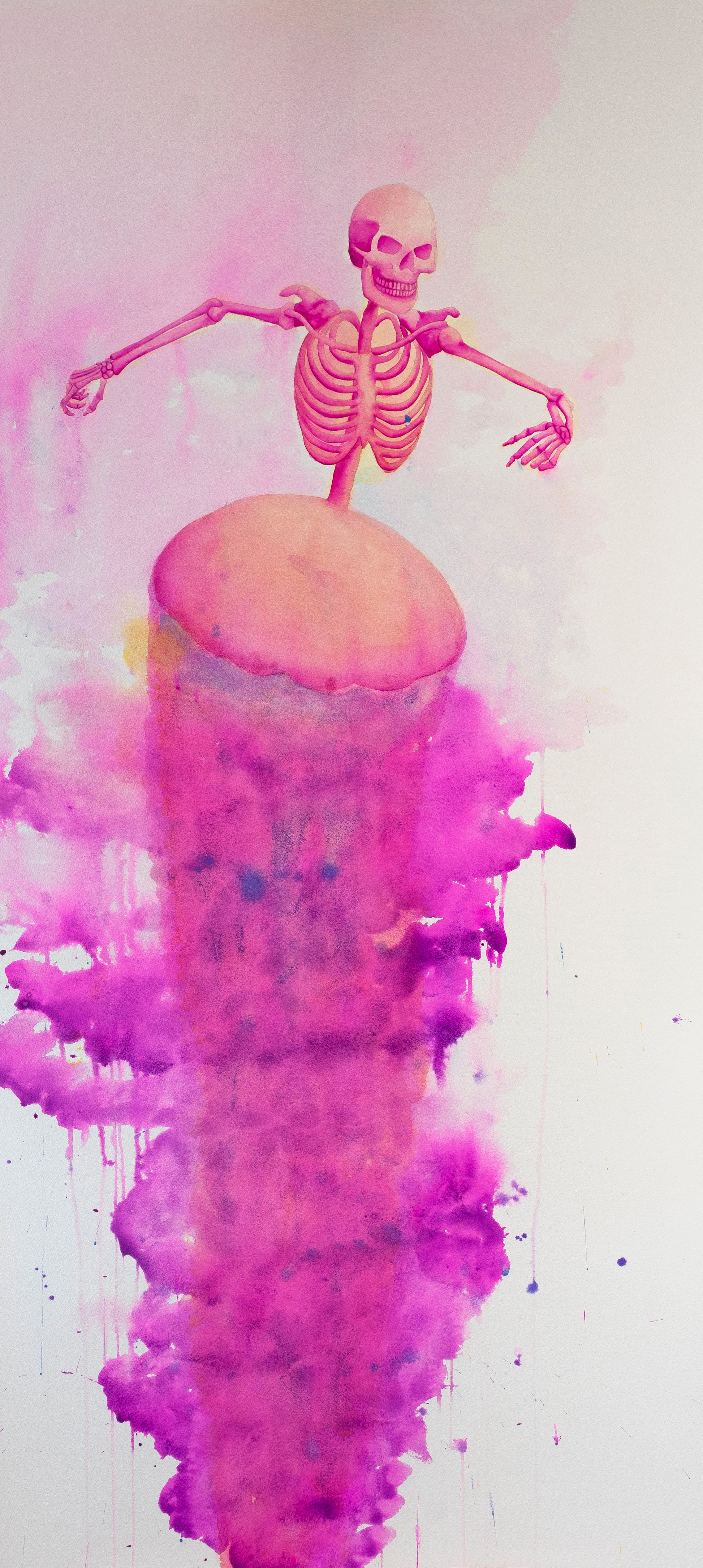 Entre sombras y recuerdos es una serie compuesta por ocho acuarelas en gran formato. A través de un ser híbrido: mitad medusa, mitad esqueleto humano. La obra explora la fragilidad del cuerpo, la memoria como residuo y la presencia silenciosa del tiempo. Las figuras no narran un acontecimiento específico, sino que habitan un estado: un espacio suspendido entre lo vivo y lo que ya se transforma.