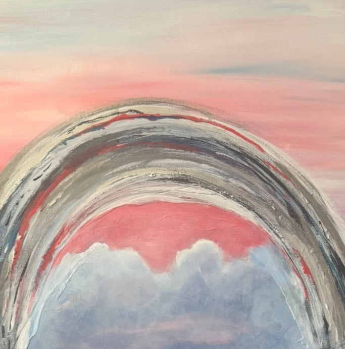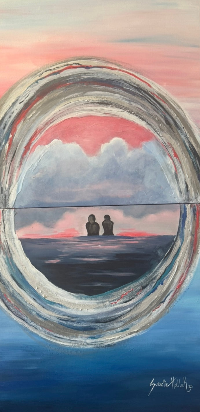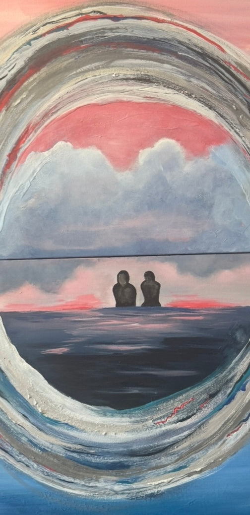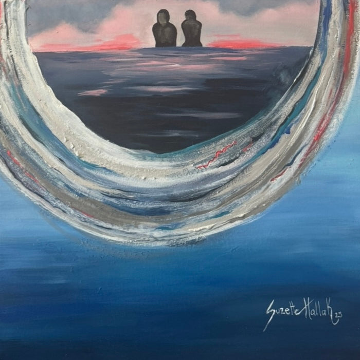 “Un círculo envolvente guarda un instante suspendido: dos figuras comparten mar y cielo, unidas en presencia, separadas por un hilo invisible. La obra evoca ese umbral donde la cercanía y la distancia respiran juntas.”