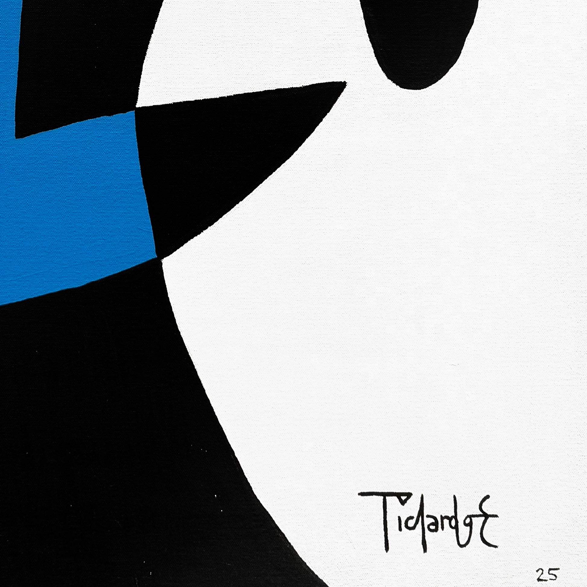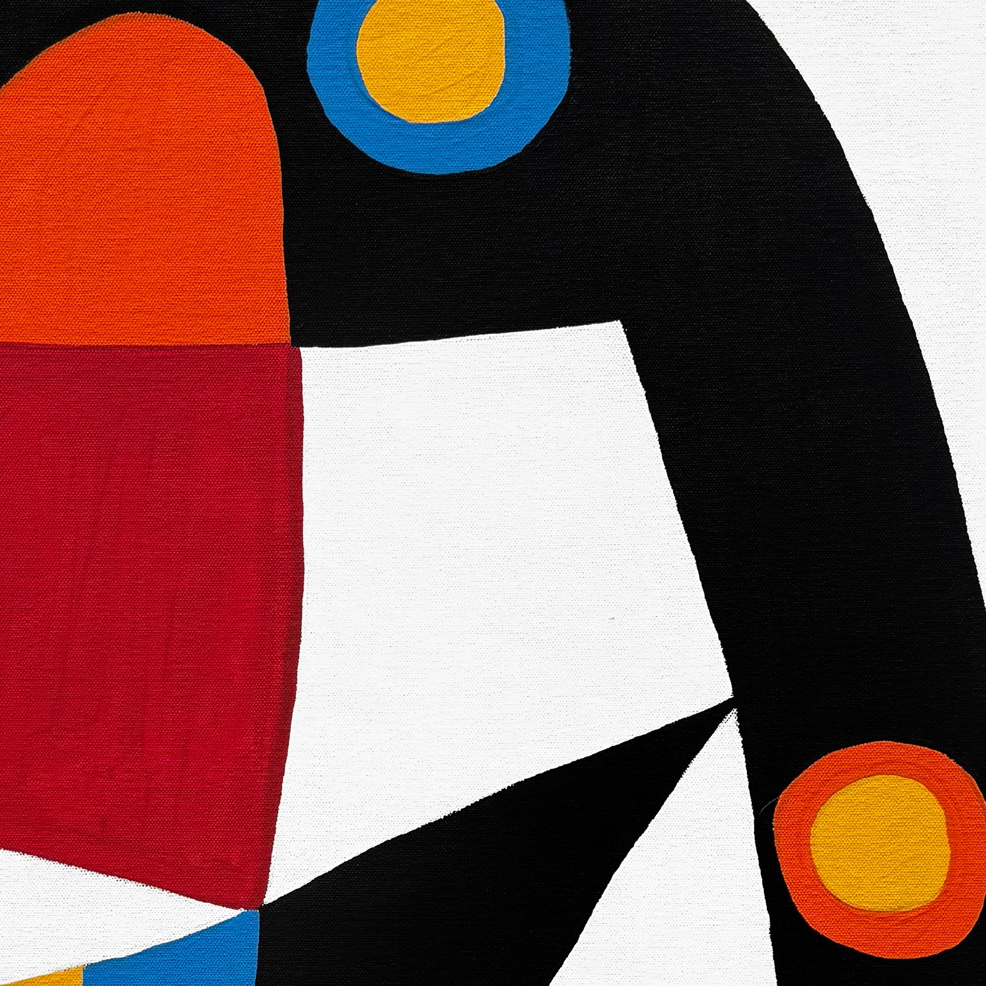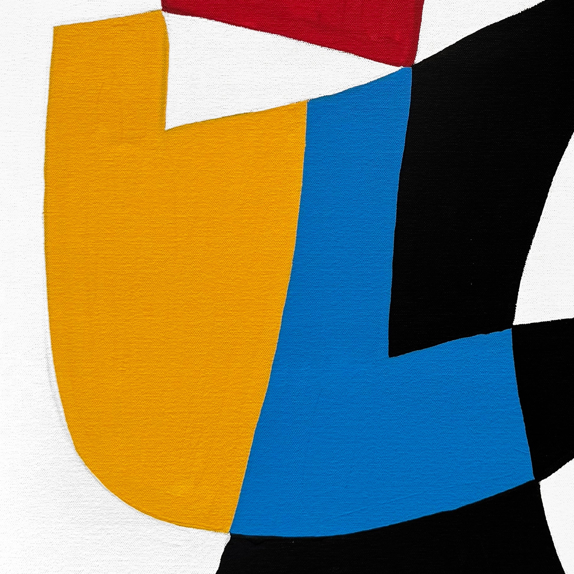 La estructura compositiva se organiza a partir de amplios planos de color que interactúan entre sí sin rigidez geométrica. Las curvas prolongadas y los ángulos suaves generan una sensación de movimiento contenido, mientras que los elementos circulares integrados en las figuras funcionan como puntos de tensión visual que ordenan la mirada. La relación entre forma y vacío crea una narrativa visual abierta, donde la abstracción mantiene un equilibrio constante que permite una lectura fluida dentro del lenguaje del arte contemporáneo.