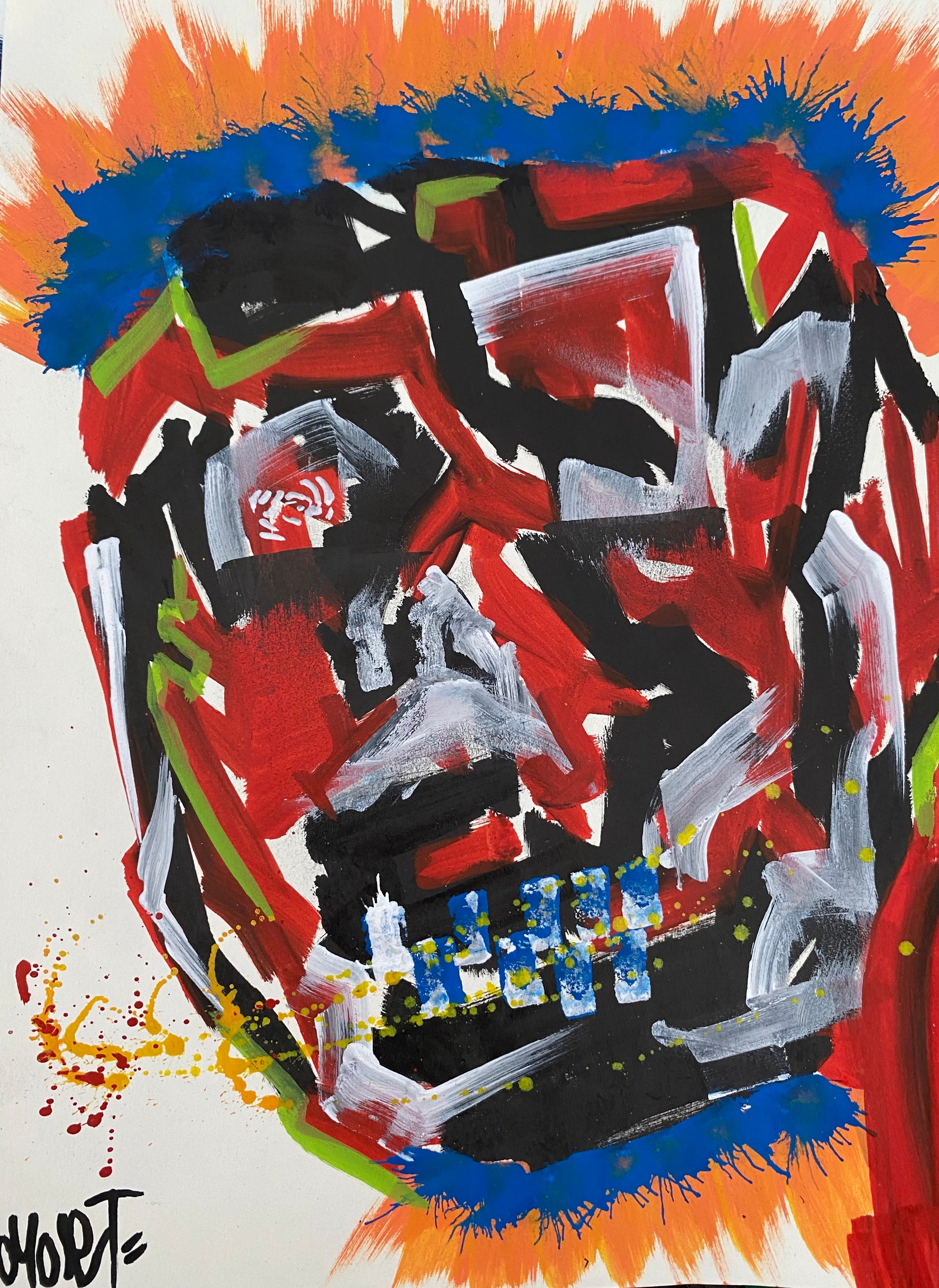 Esta pintura nace de la necesidad de liberar emociones reprimidas y del sentimiento que se genera cuando vives en una rutina de terapias. A través de colores intensos y un rostro fragmentado, expreso el odio y el dolor dentro de mí. Esta obra es una mueca de ironía frente al sufrimiento, un caos visual que invita al espectador a confrontar su propio malestar y encontrar en él una posible catarsis.