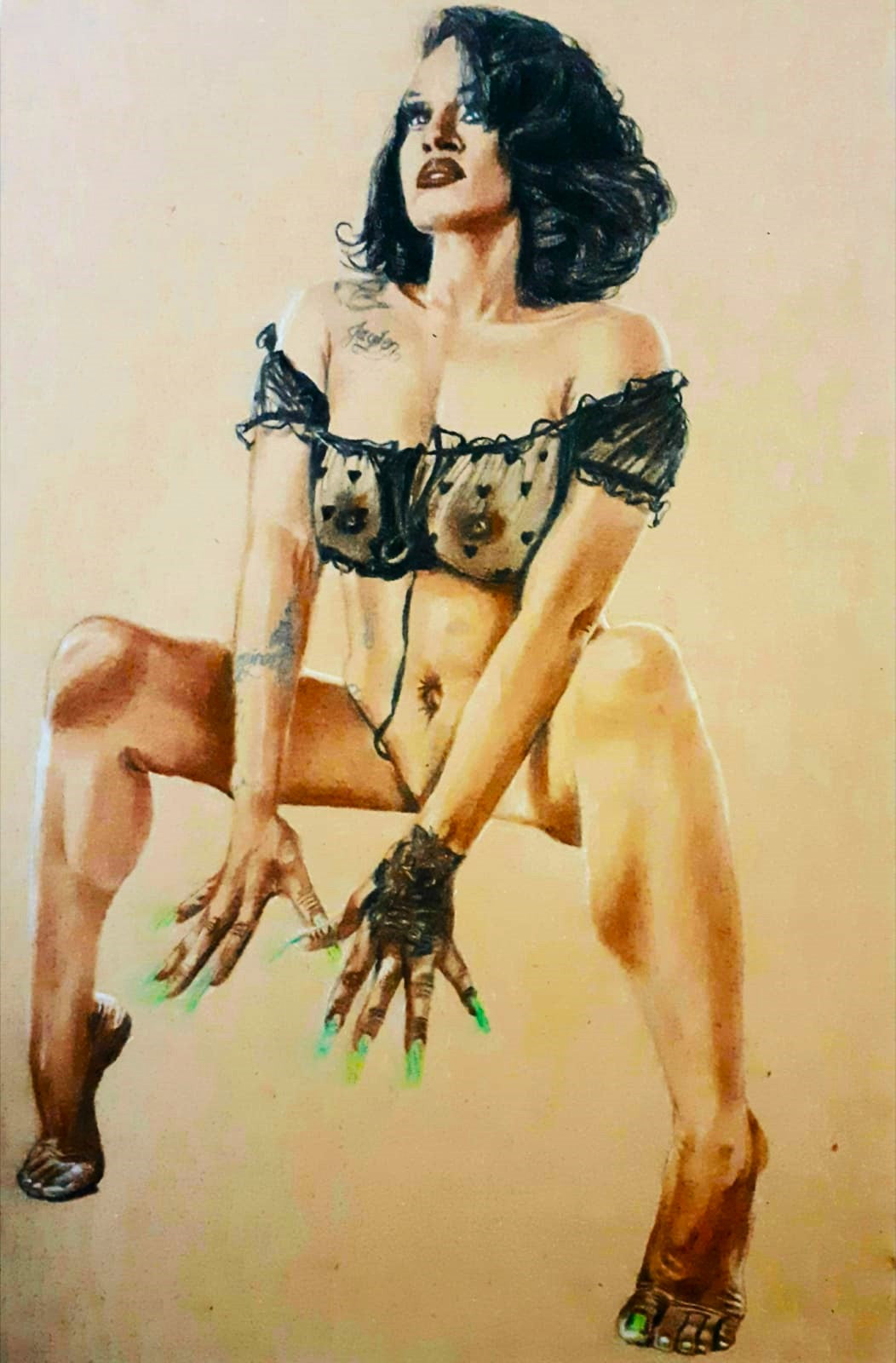 Retrato hecho en colores pastel tipo gis y carboncillo sobre papel craft.